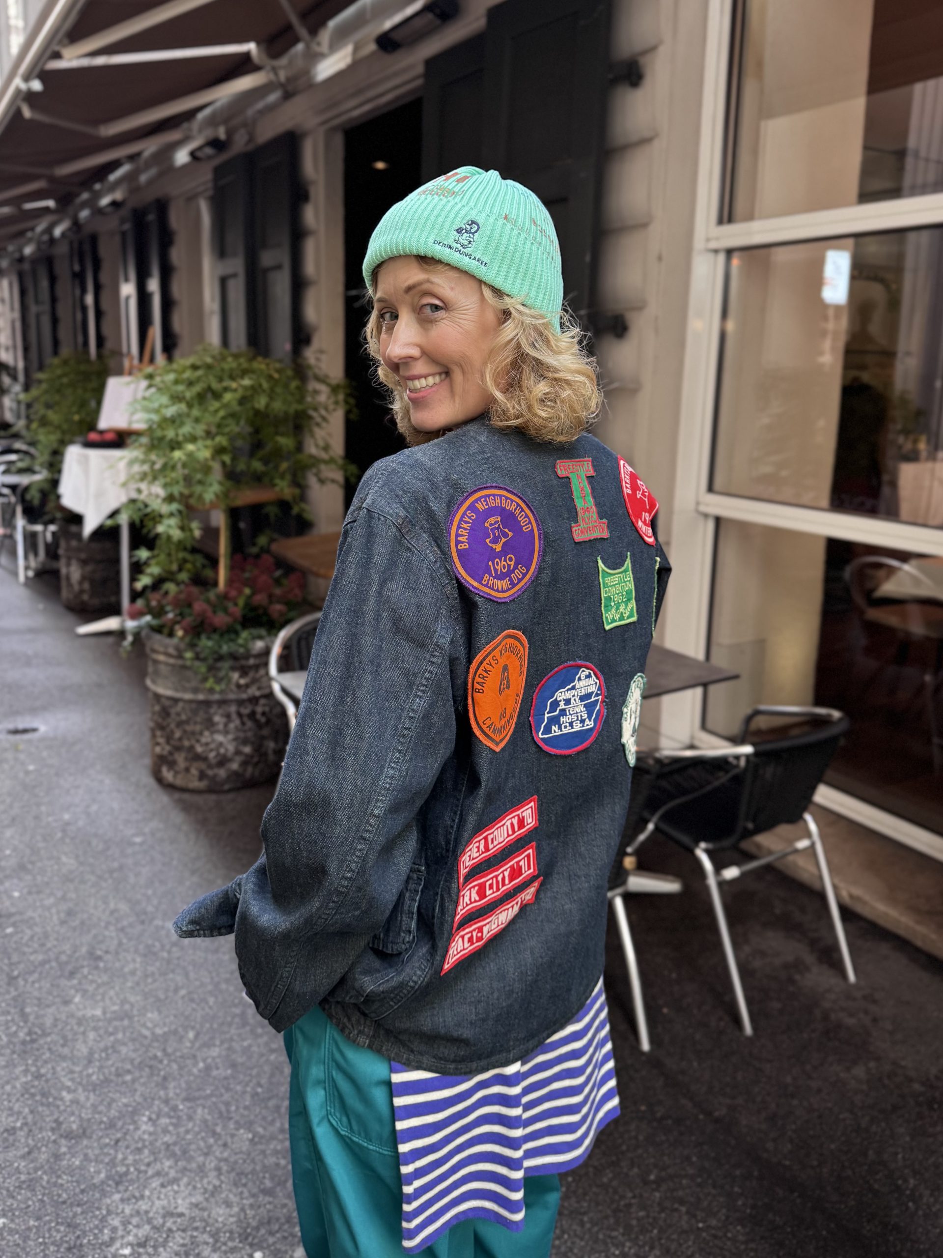 The 8oz Denim Hunter Jacket by Denim Dungaree is a dark denim jacket with a button-up front and a V-neck collar. The front has two large patch pockets at the waist. The back of the jacket is covered with various patches of different shapes, colors, and designs.
