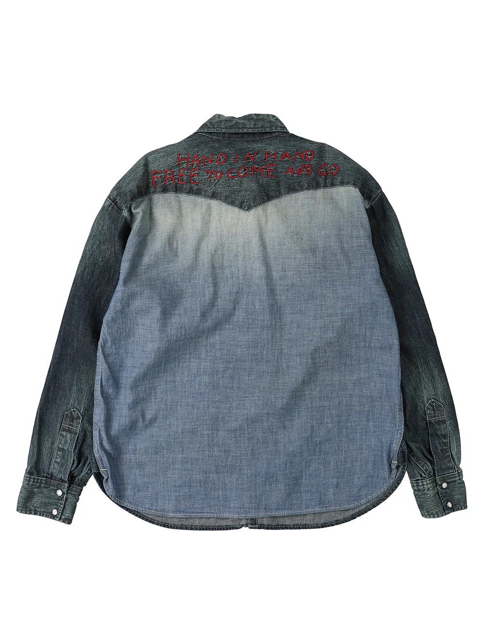 The 8oz Denim Western Shirt by Denim Dungaree is crafted from premium Zimbabwean cotton, providing a natural fade and a subtle sheen that enhances its visual depth. This Western shirt features a distinctive construction where the back is made of chambray, offering a striking contrast to the denim front. The design is further elevated by embroidery on the back yoke that is engineered to develop a unique, wrinkled character over time. It also include a chest pocket and snap buttons for all but the top closure.