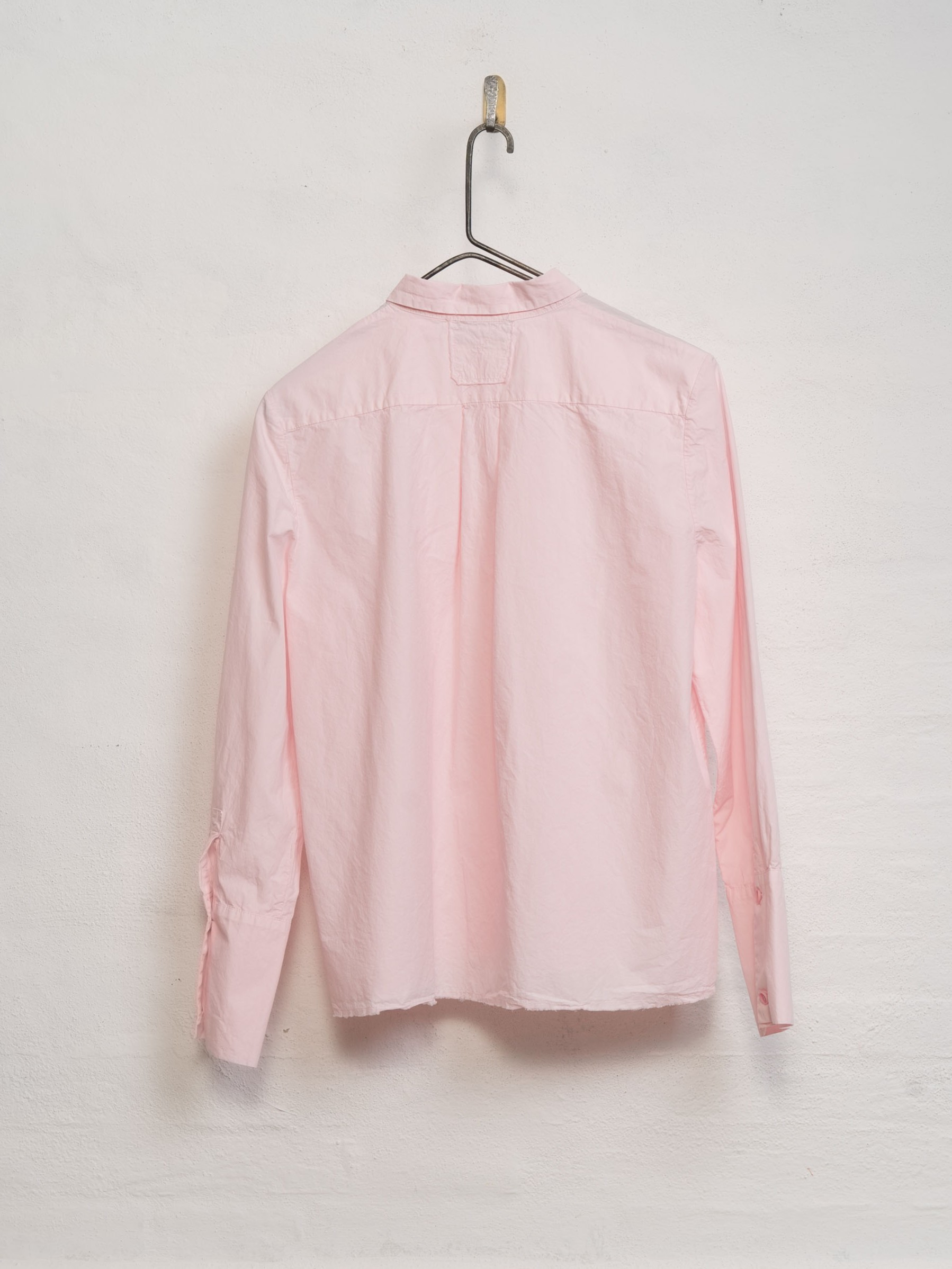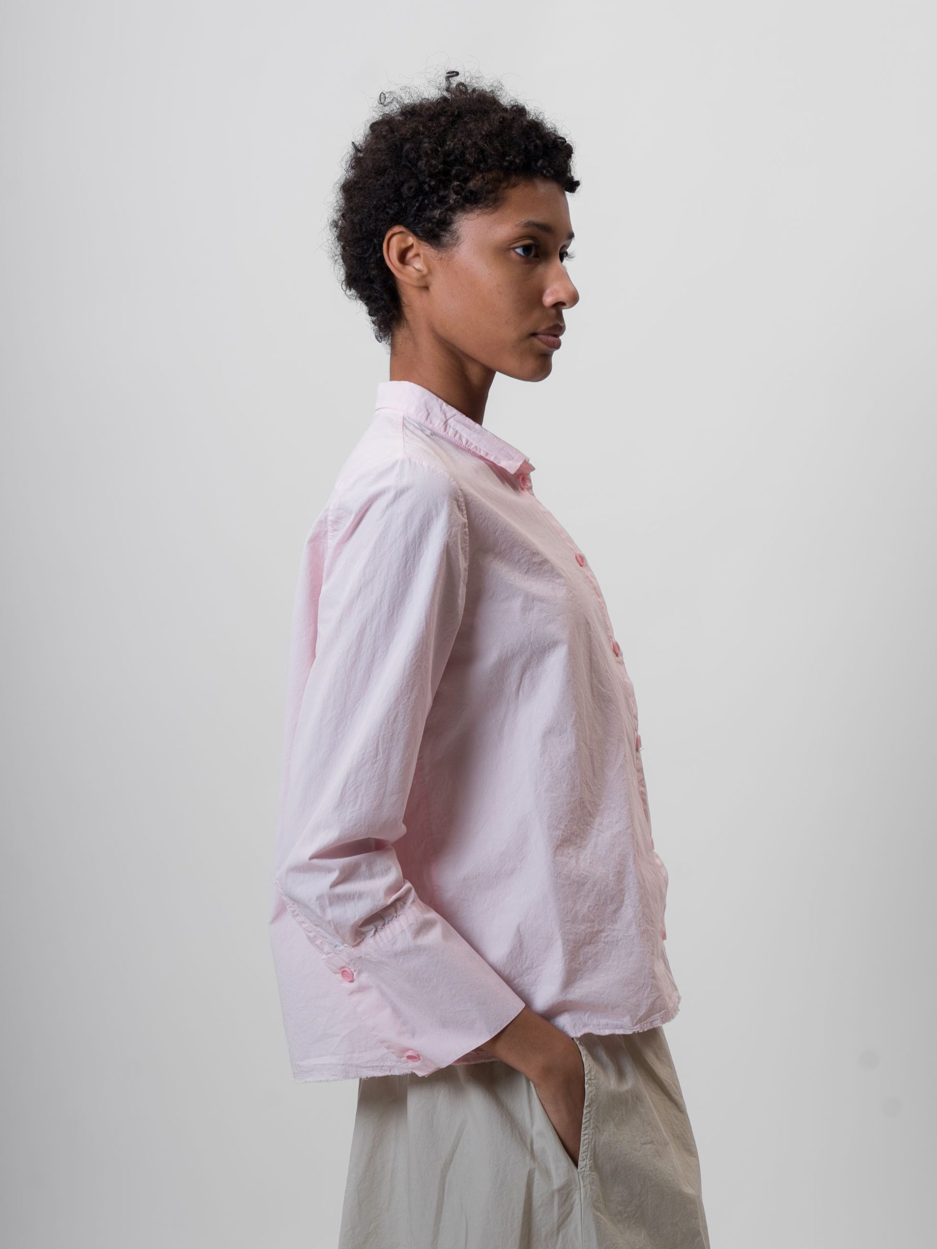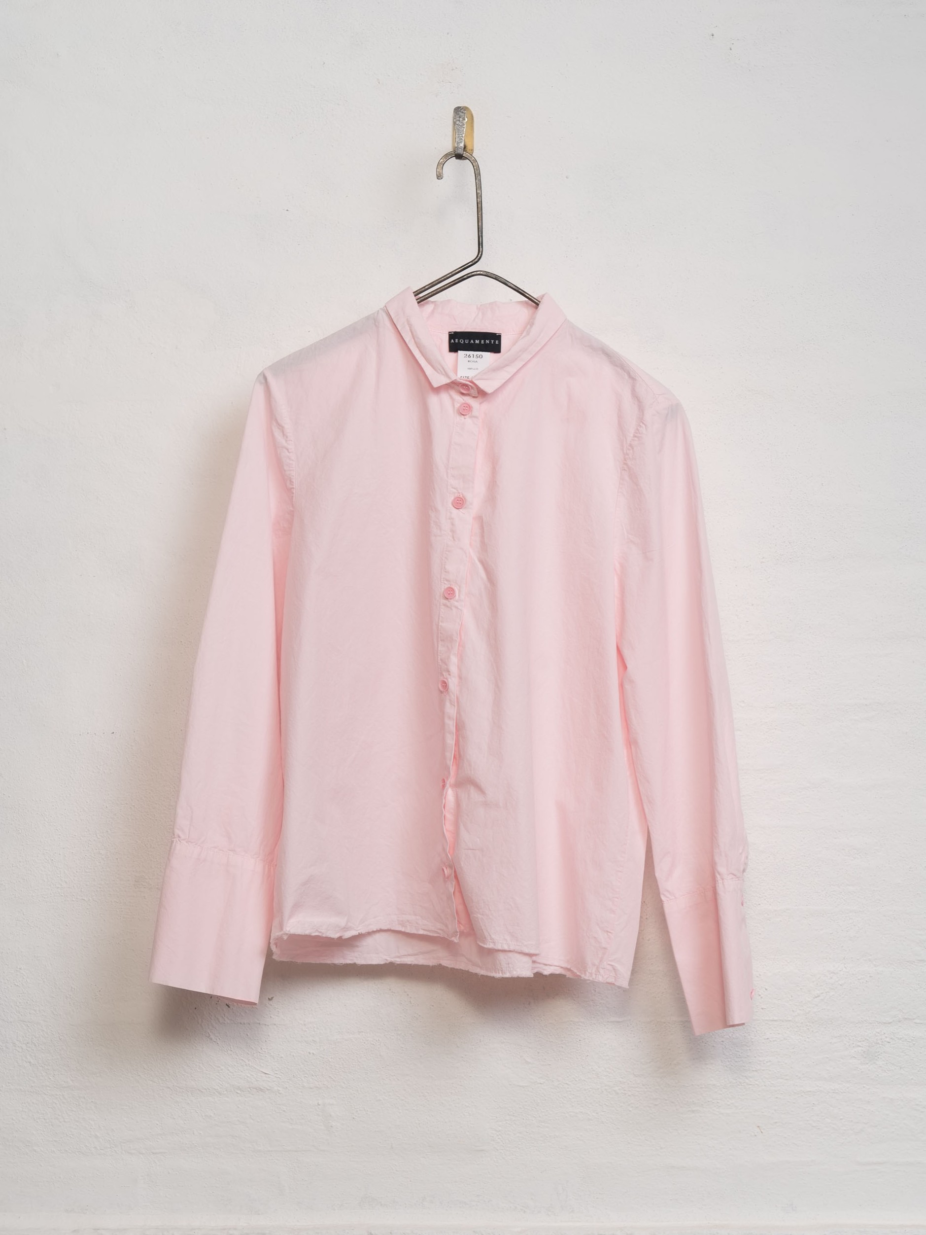 The Cotton Shirt by Aequamente is a long-sleeved top with a regular fit and a straight-cut hemline. The construction includes a short pointed collar and a front closure with tonal corozo buttons.
