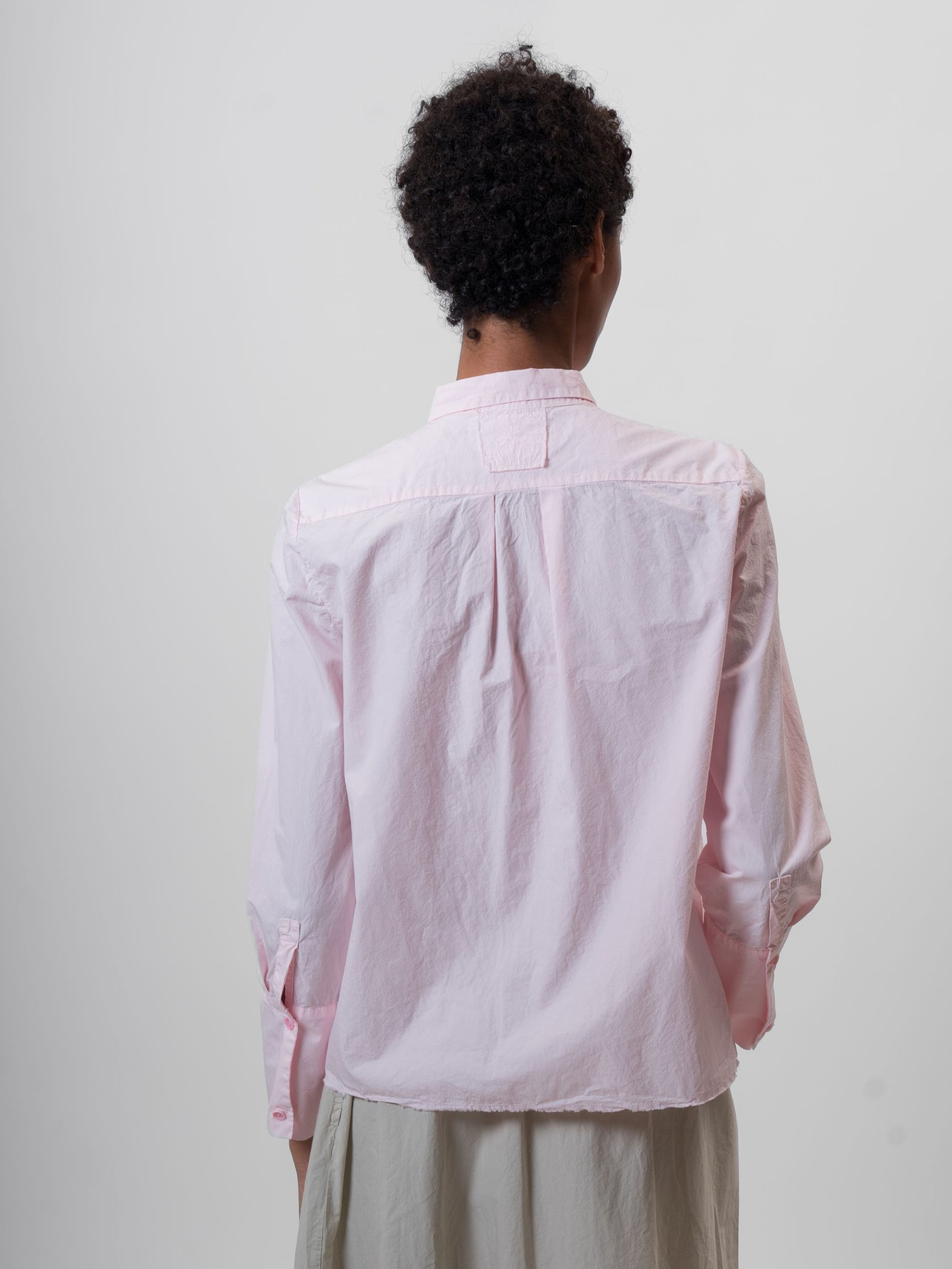 The long sleeves are finished with structured, buttoned cuffs. Crafted with a lightweight, slightly crinkled texture, the shirt maintains a clean-lined silhouette suitable for seasonal layering or standalone wear.