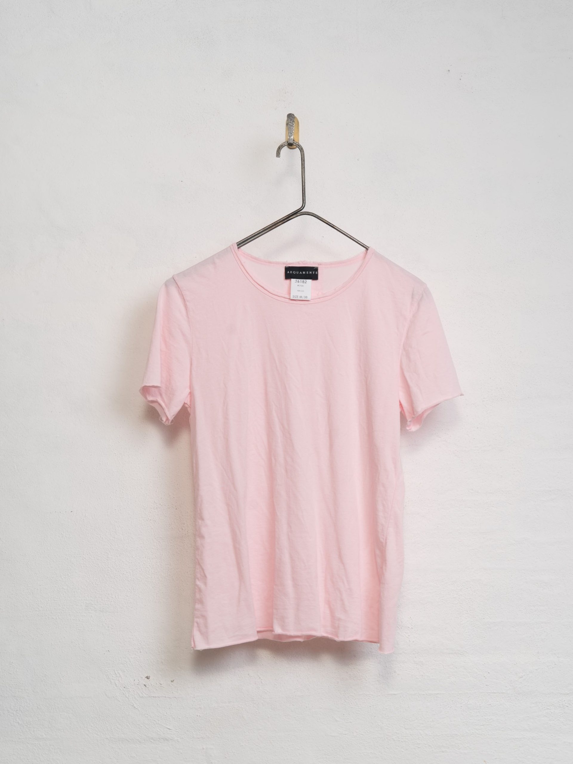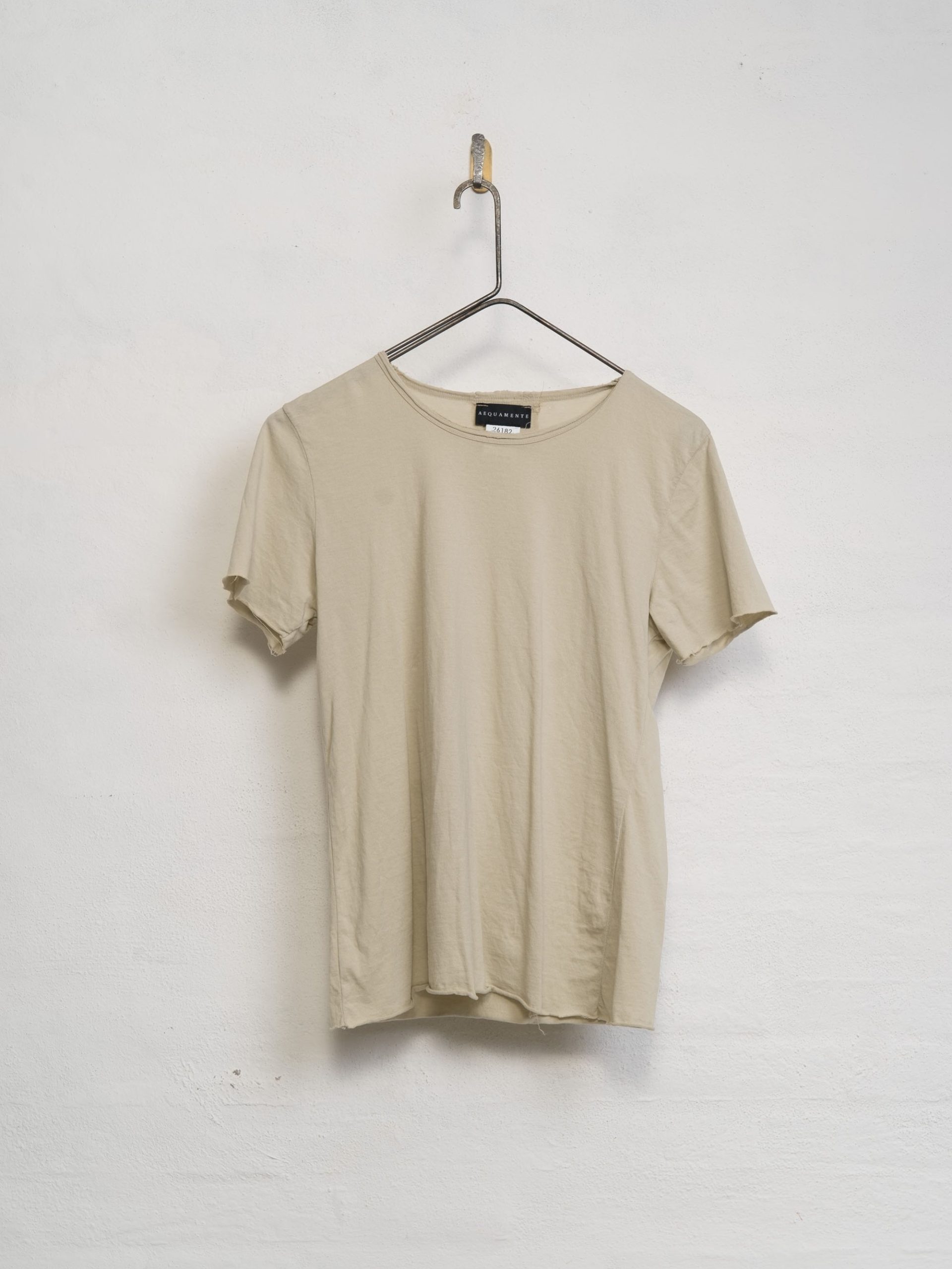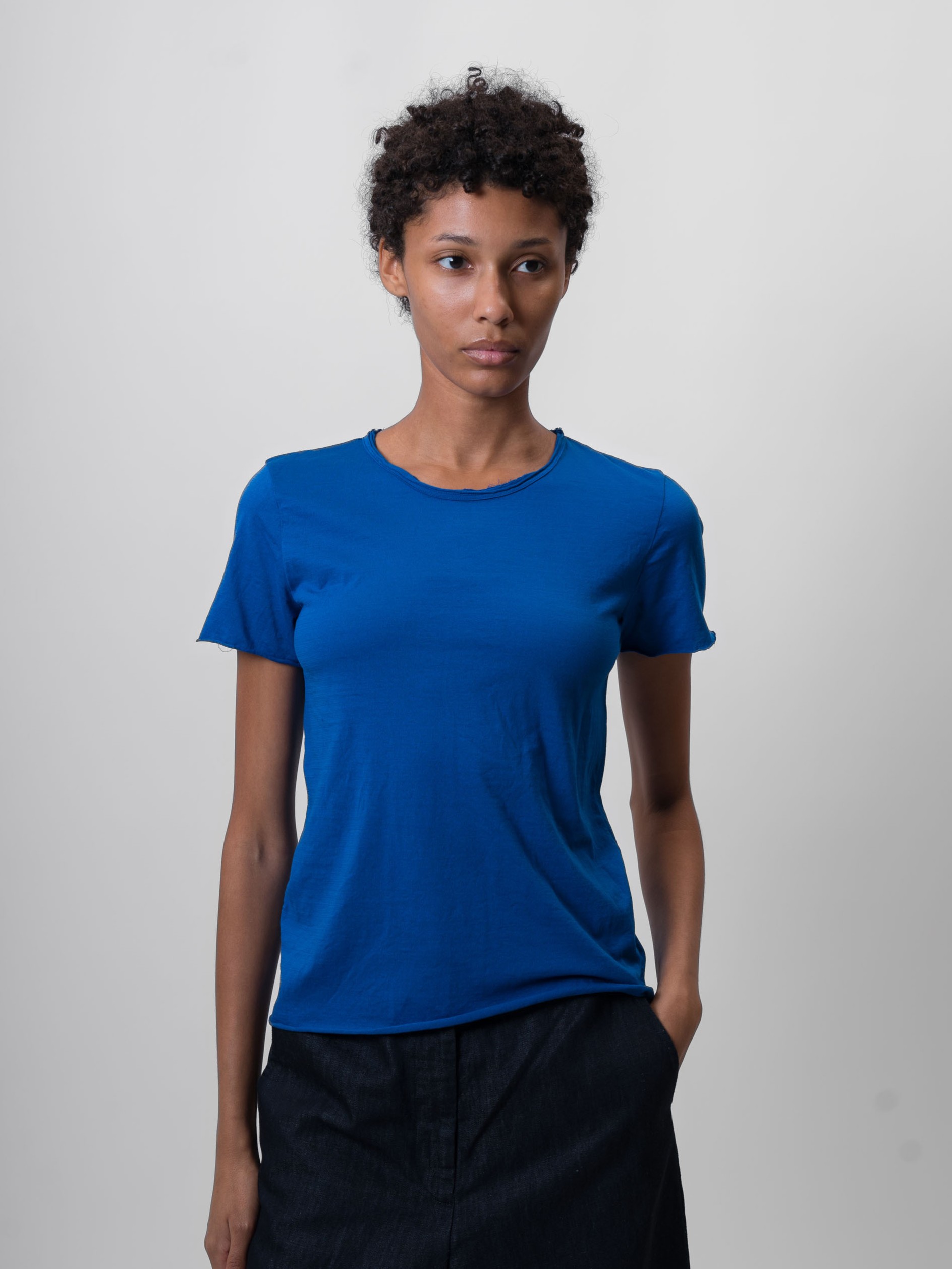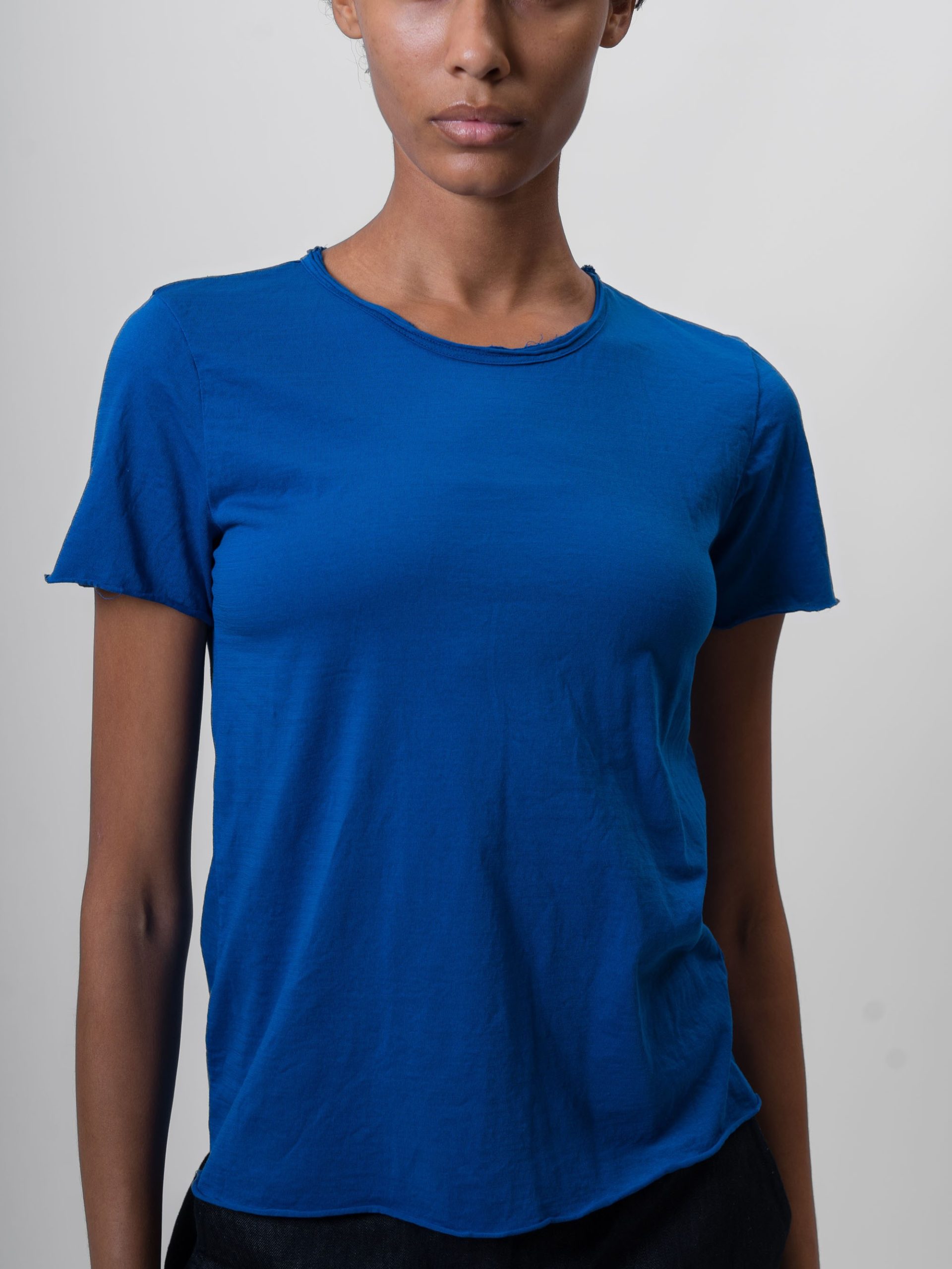 The Cotton T-Shirt by Aequamente is a short-sleeved top made from 100% cotton crepe. It features a slim, straight-cut silhouette and a standard crew neckline. The fabric possesses a subtle, fine-grained texture with a lightweight and breathable hand-feel, characteristic of high-twist crepe yarns.
