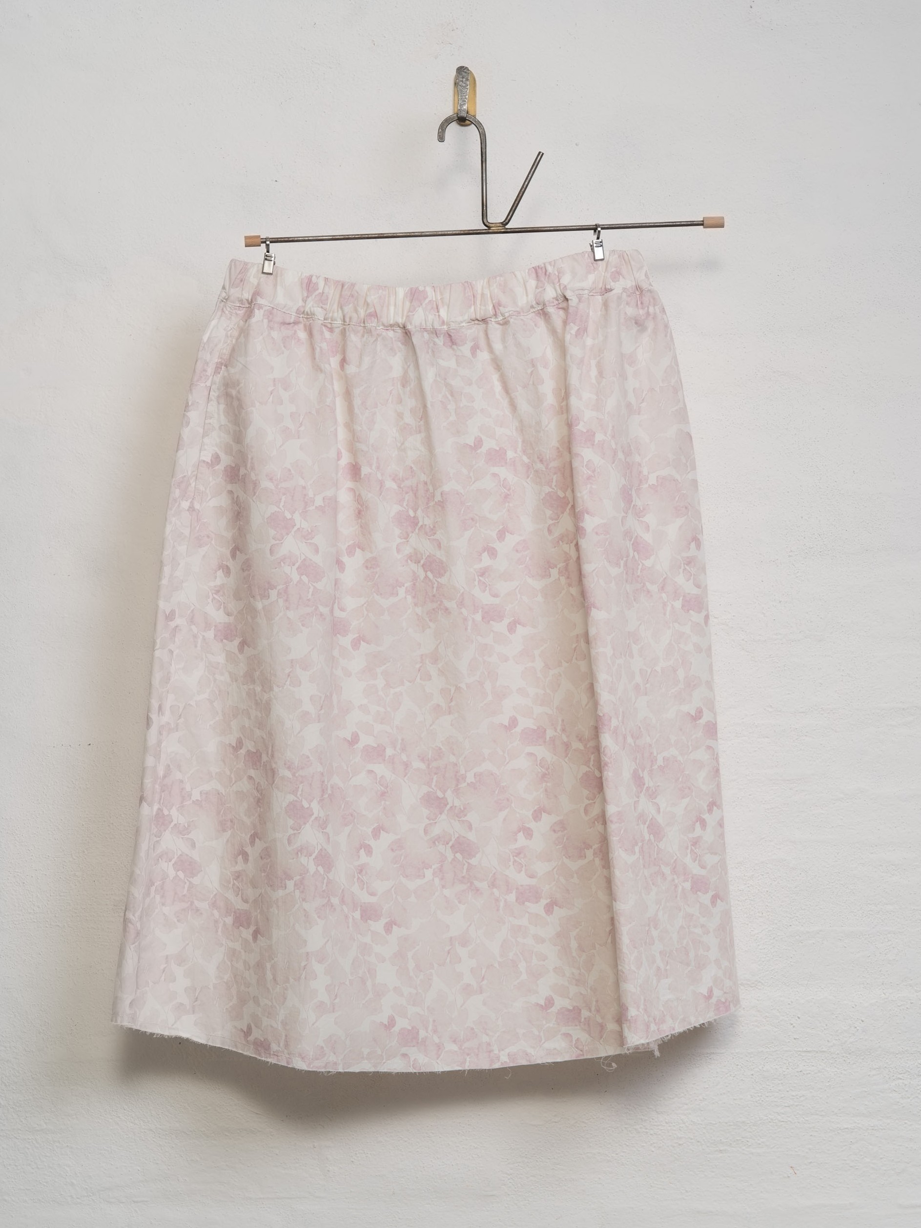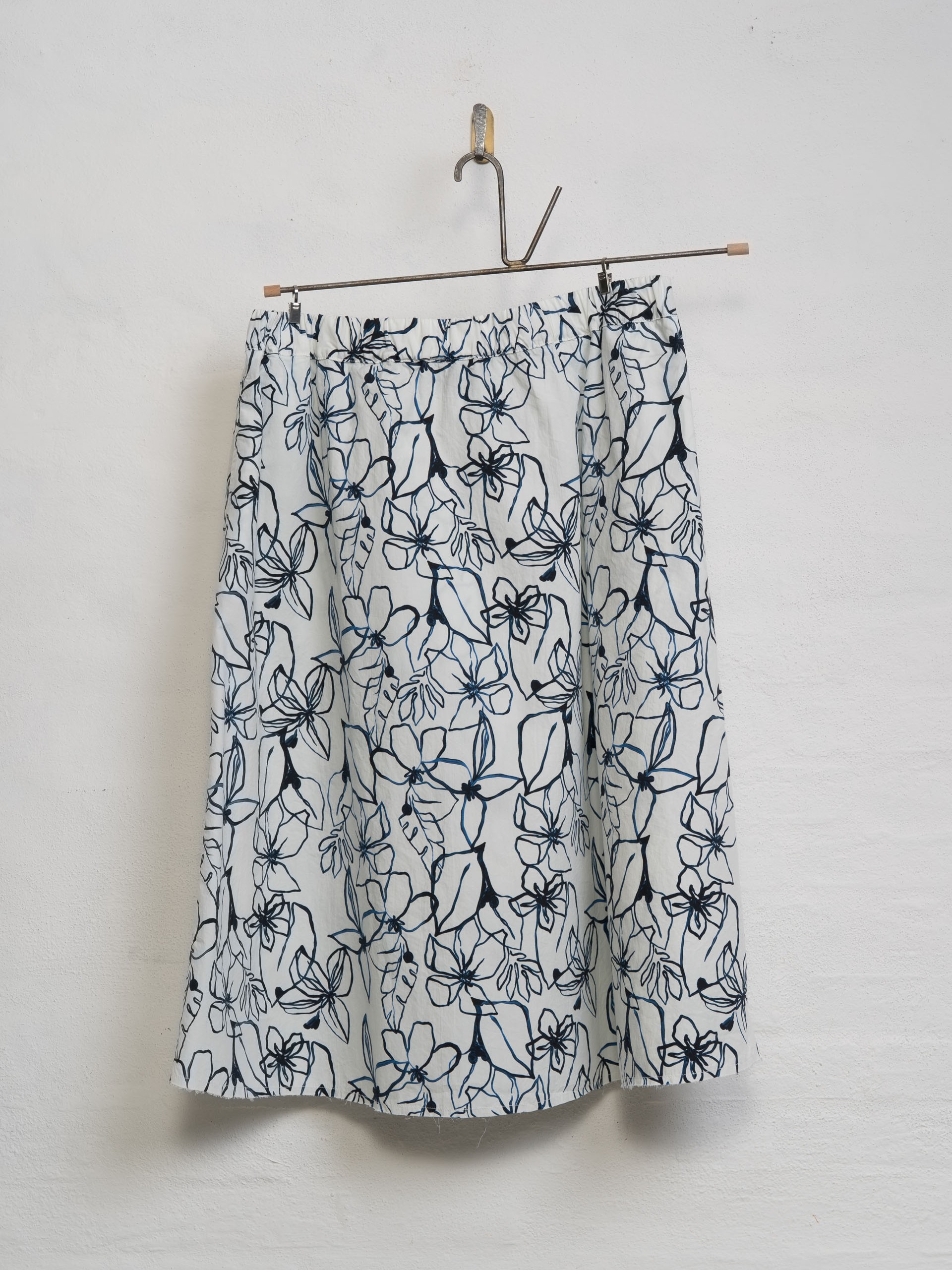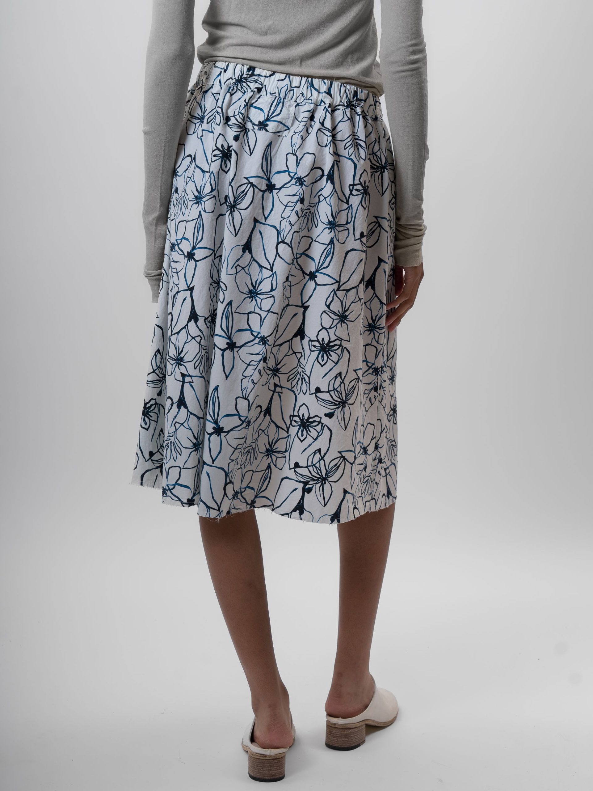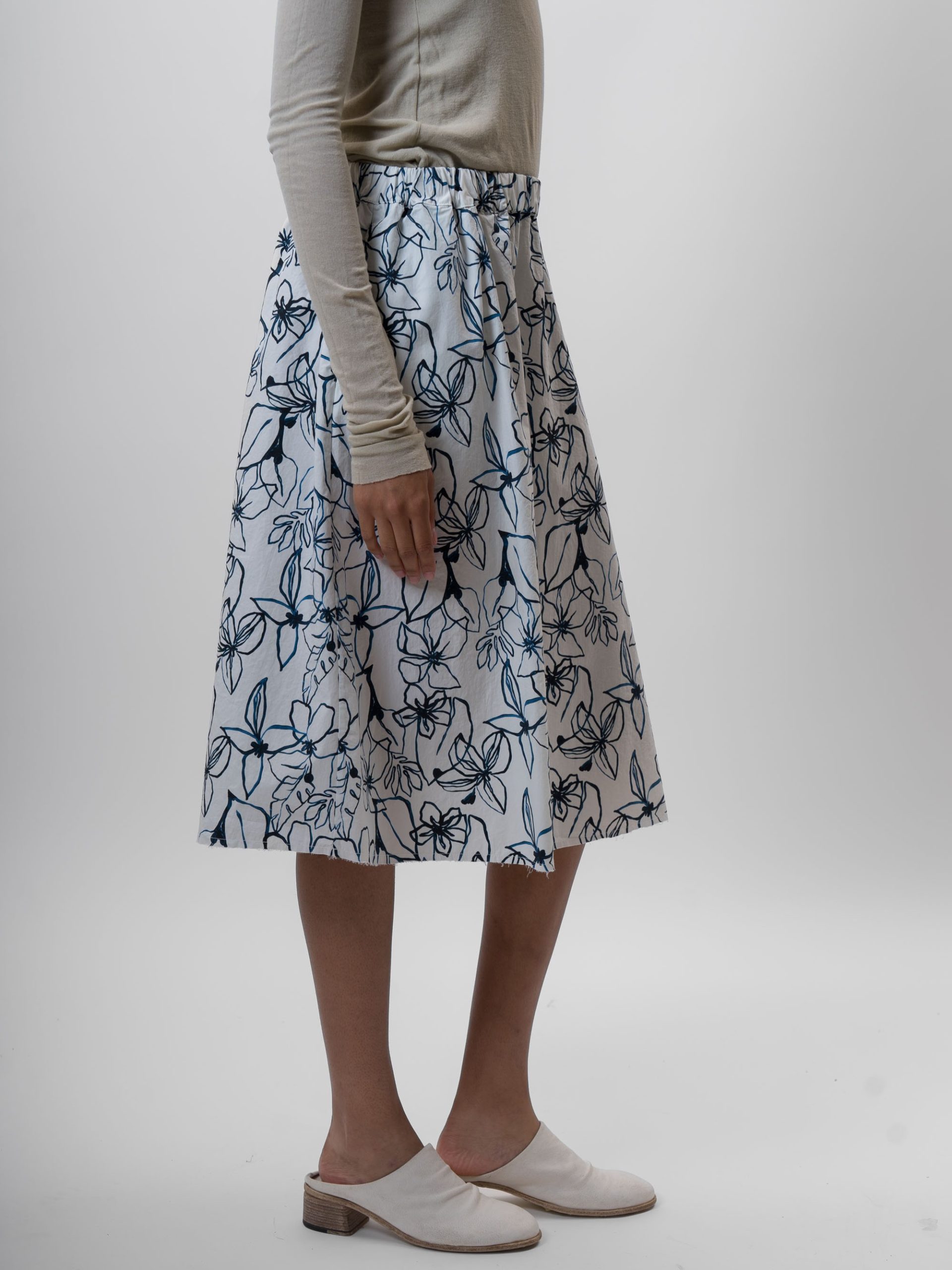 The Flowers Skirt by Aequamente is a midi-length pull-on garment crafted from lightweight cotton. It features an elasticated waistband for a comfortable, adjustable fit and includes functional concealed side pockets. The skirt has a relaxed A-line silhouette and is finished with a raw, unfinished hemline.