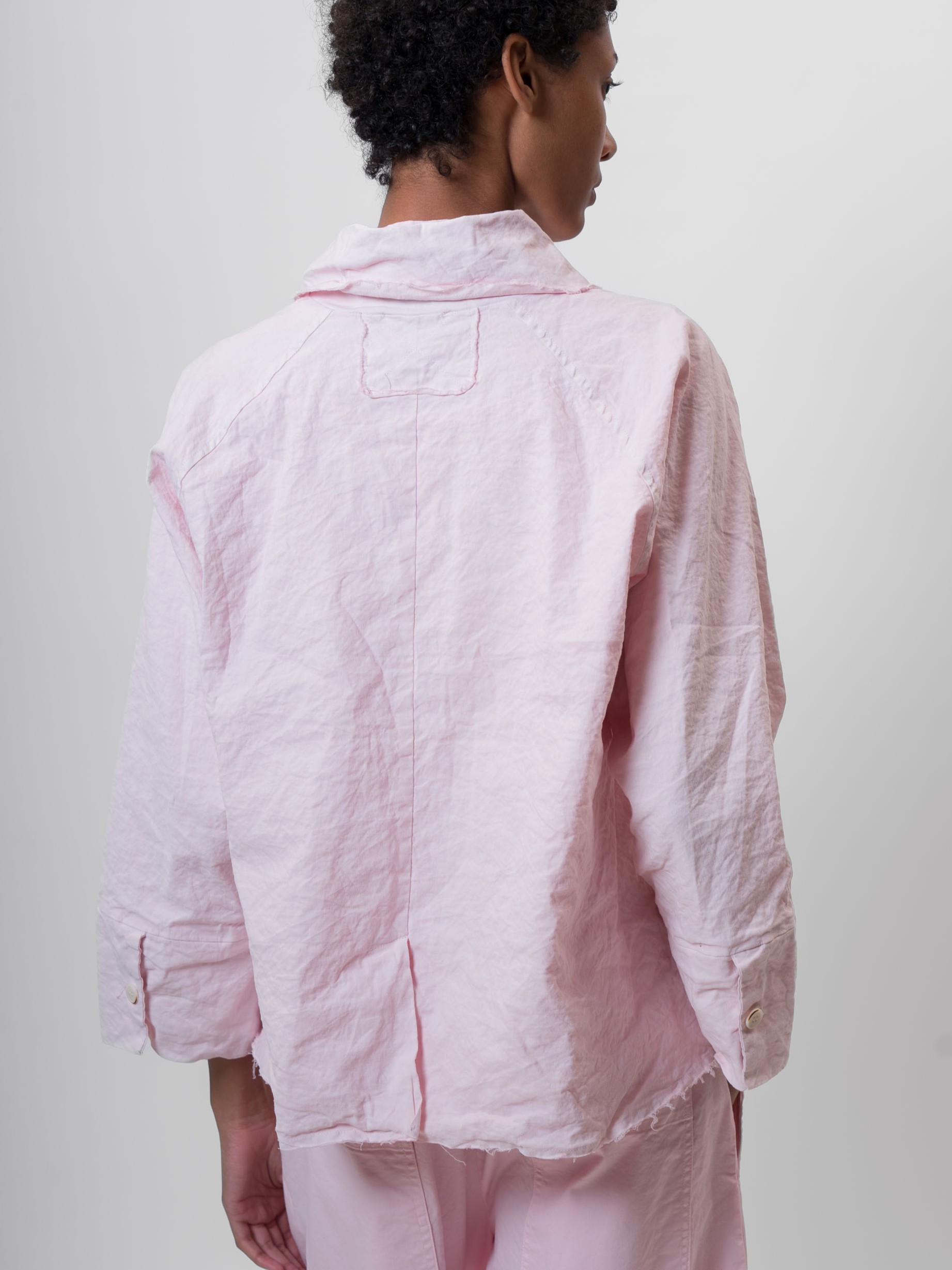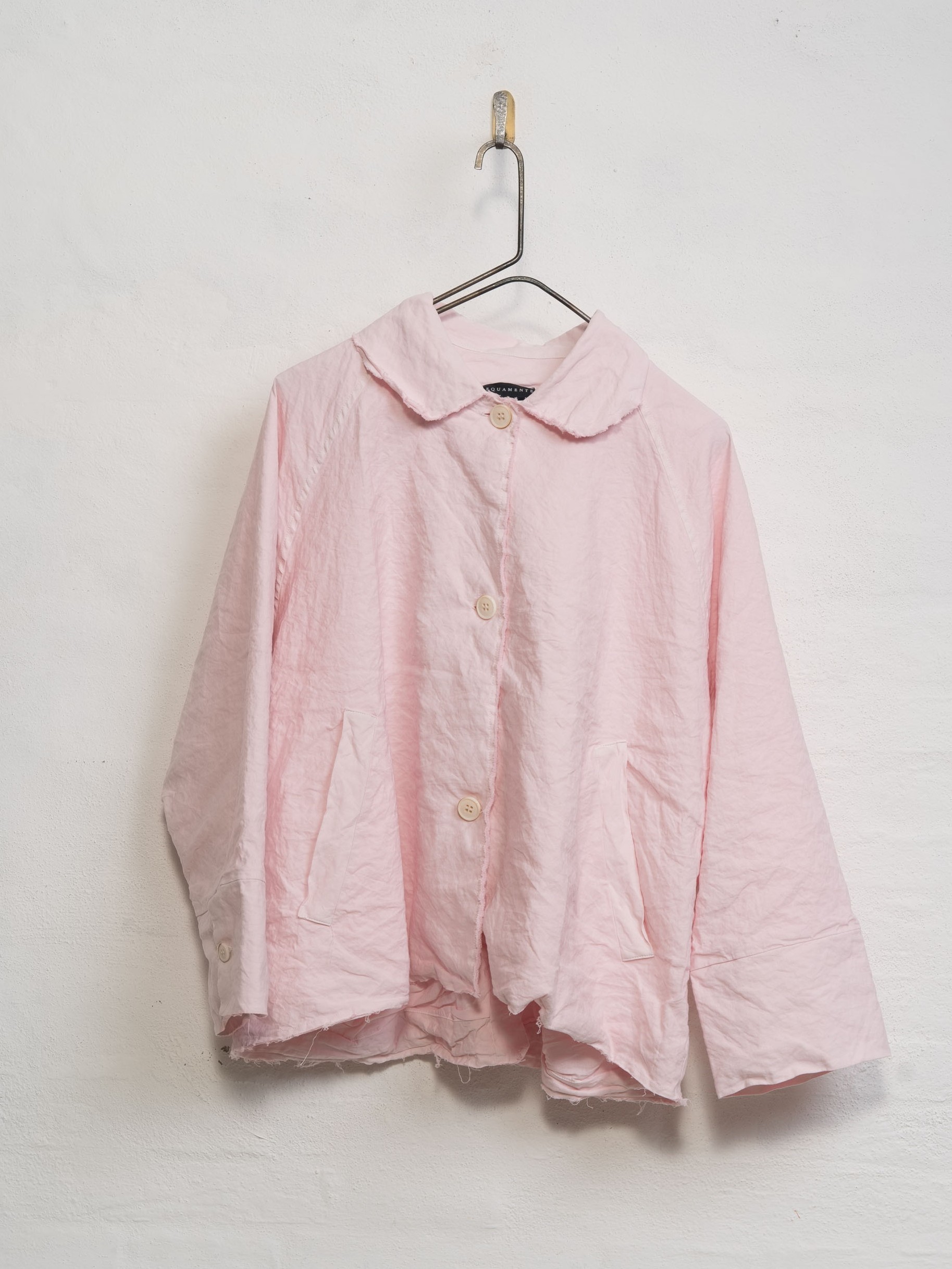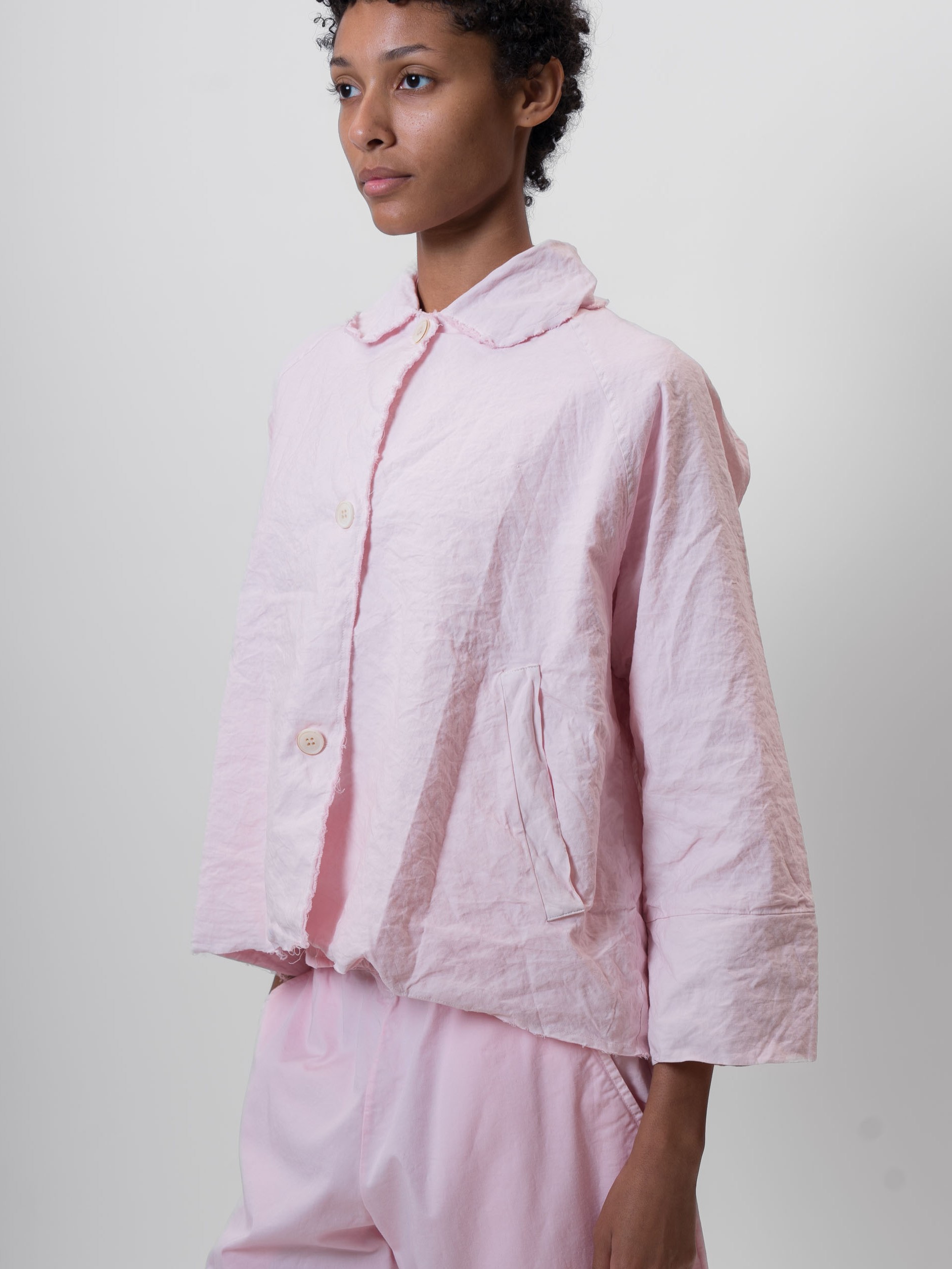 The design features a pointed collar, wide sleeves with buttoned cuffs, and a single-breasted front closure using tonal corozo buttons.