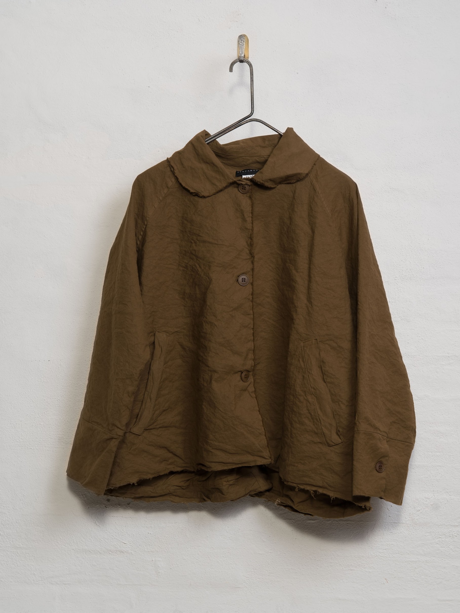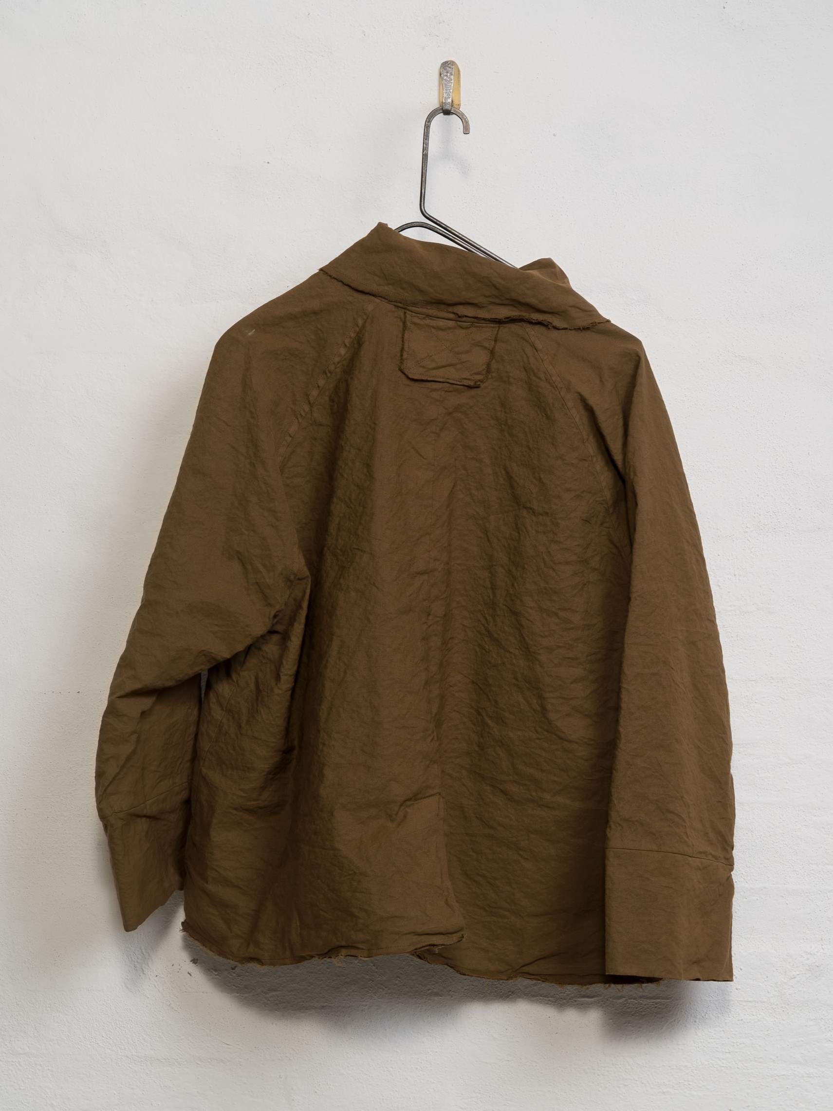 The Jacket by Aequamente is a relaxed-fit jacket crafted from a specialized cotton-steel blend, which provides a permanent crinkle effect and structural memory.