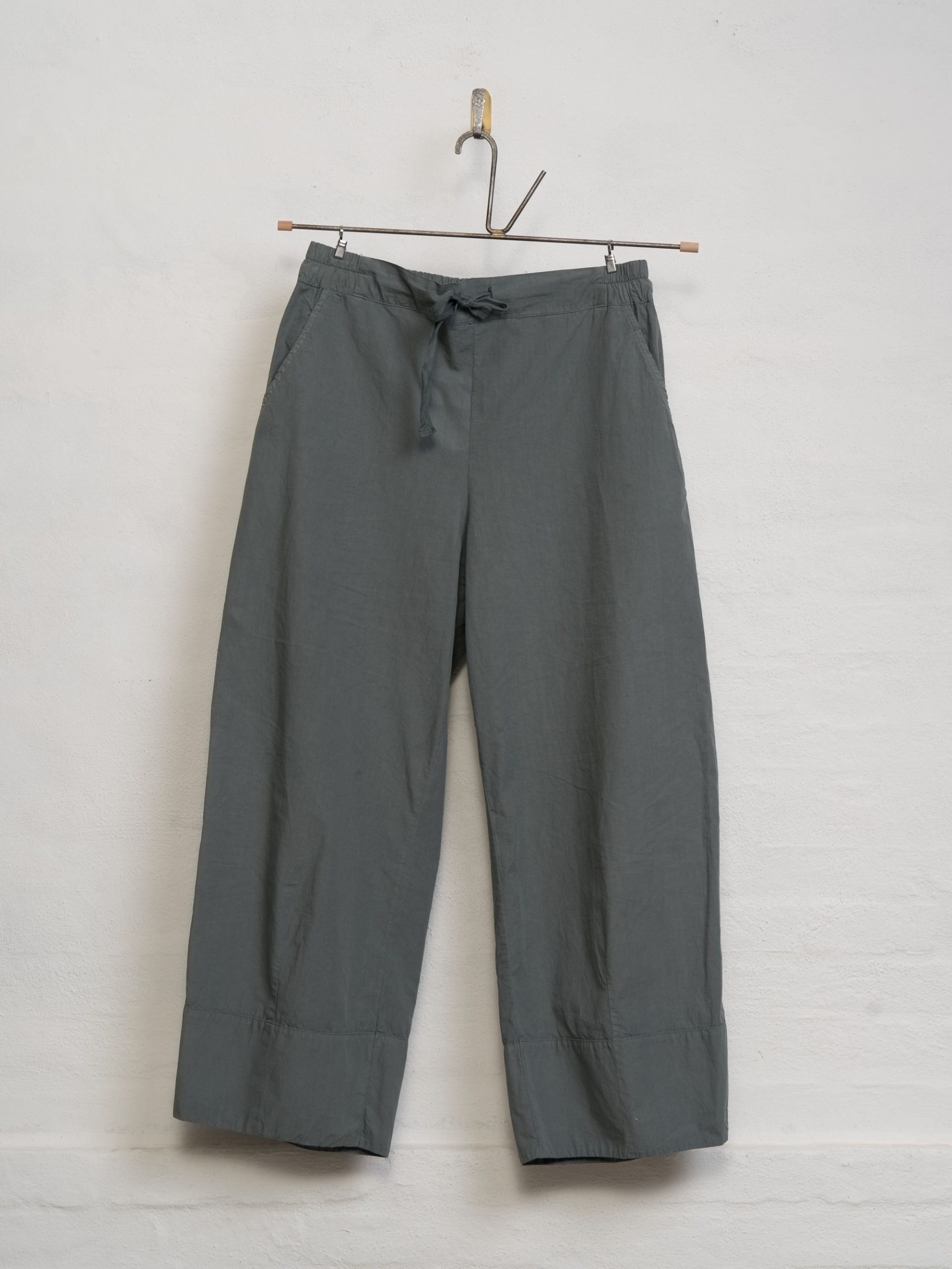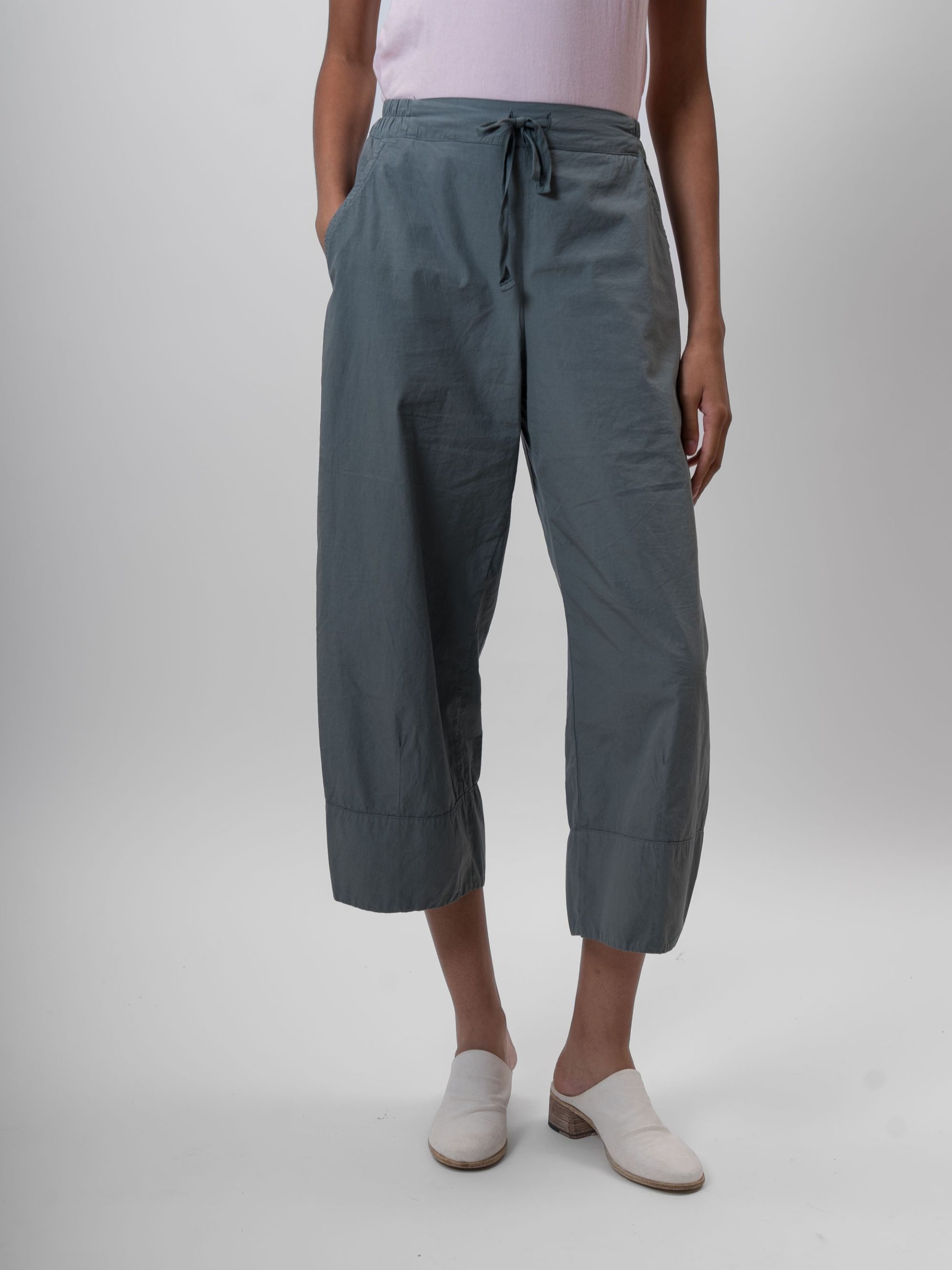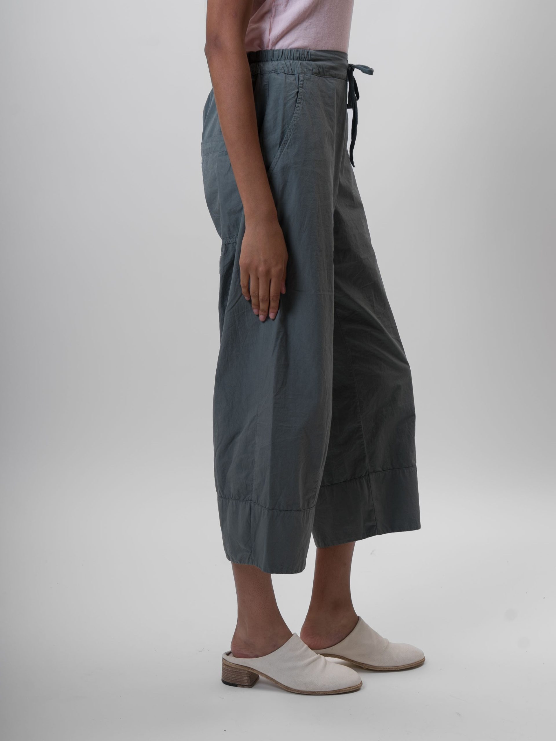 The Tie Pants by Aequamente are wide-leg, cropped trousers featured in a slate-grey “Asfalto” hue.