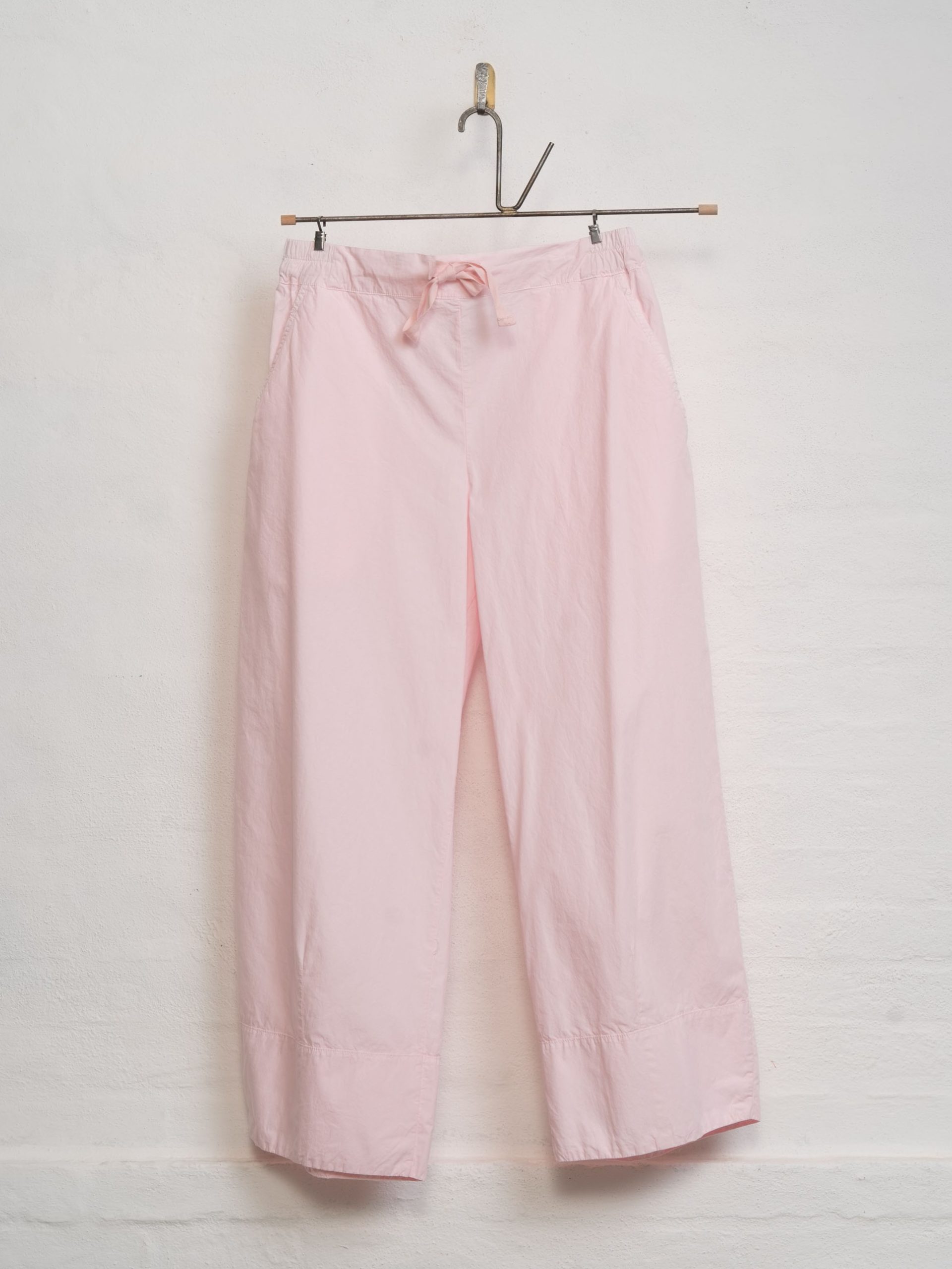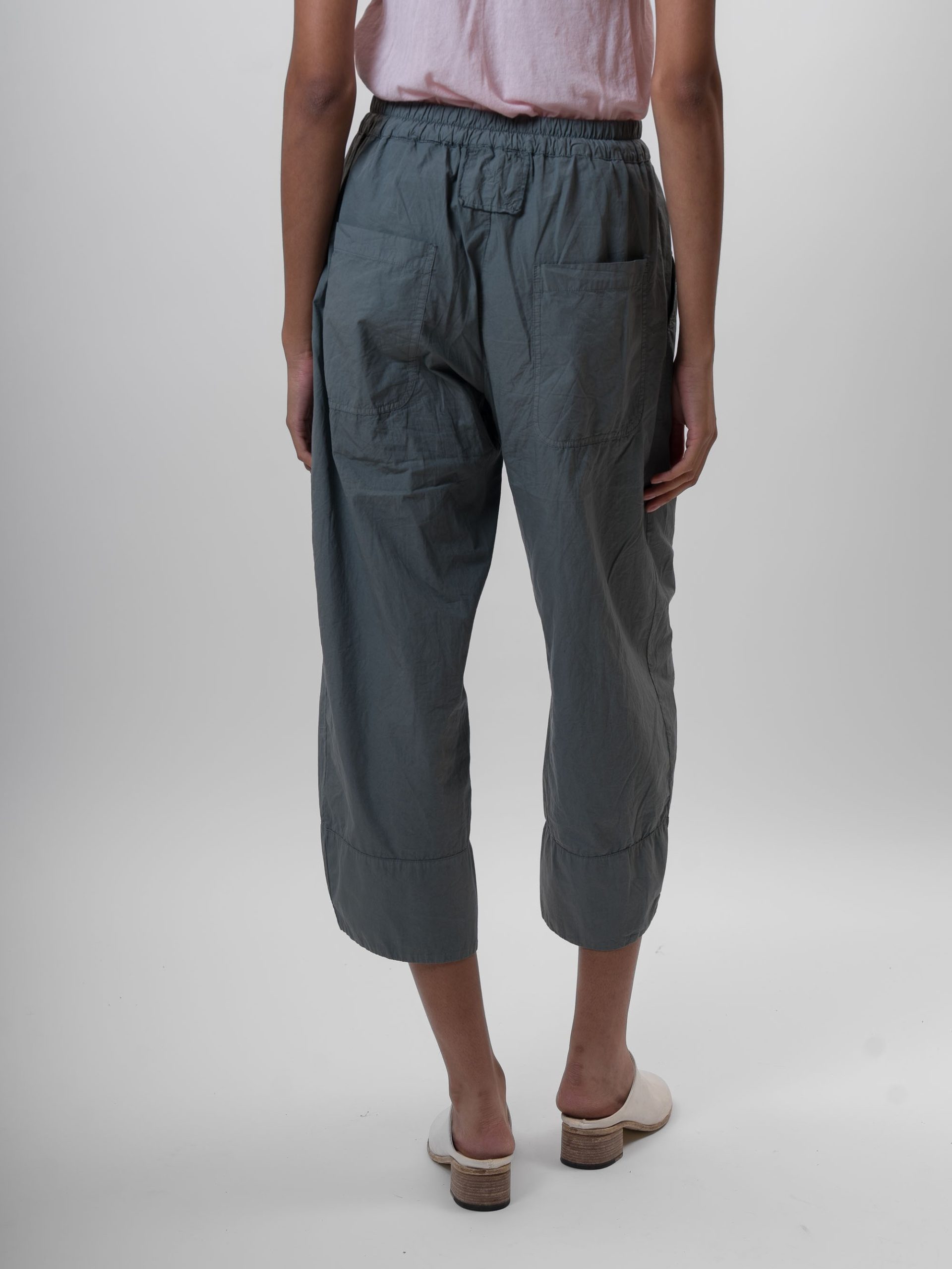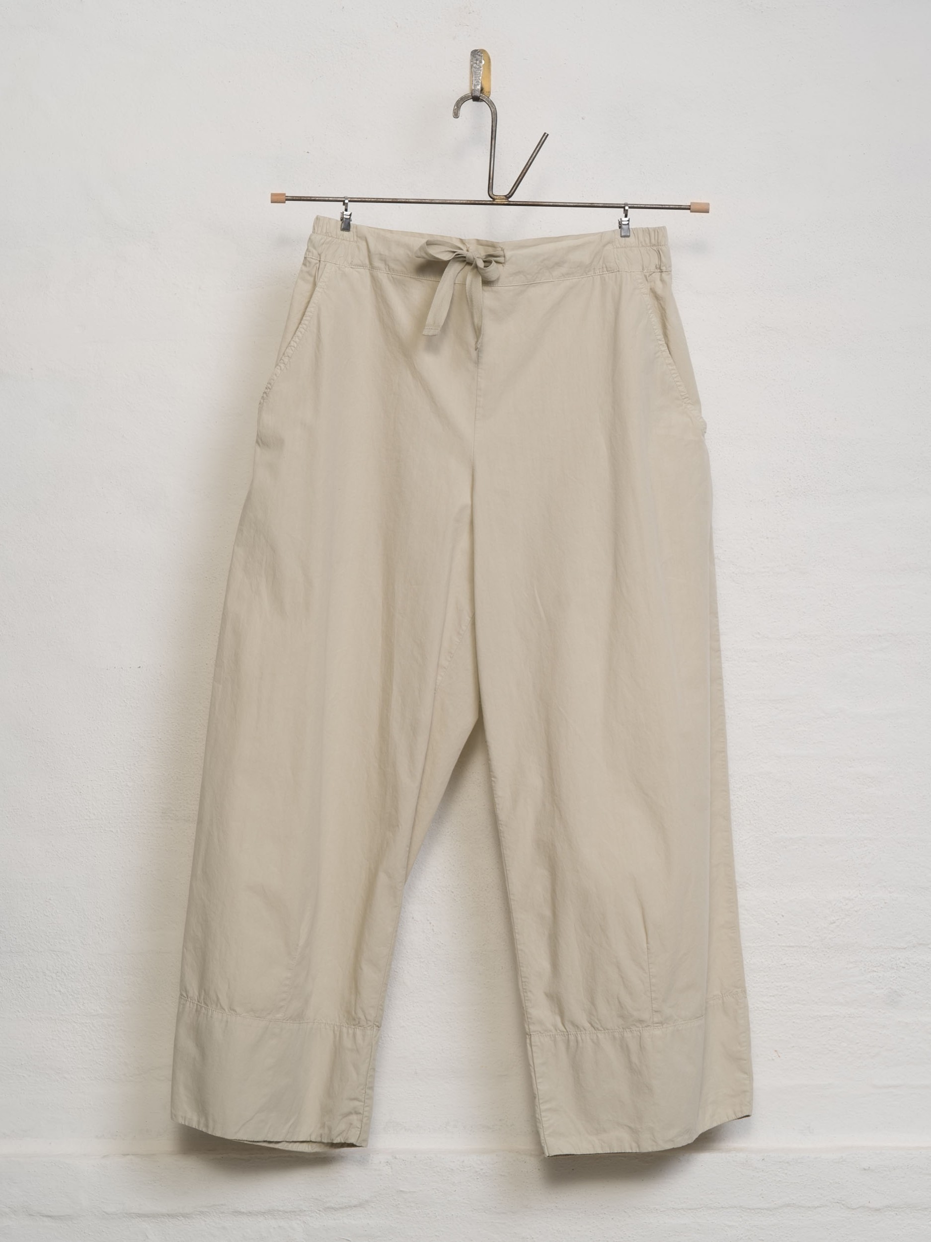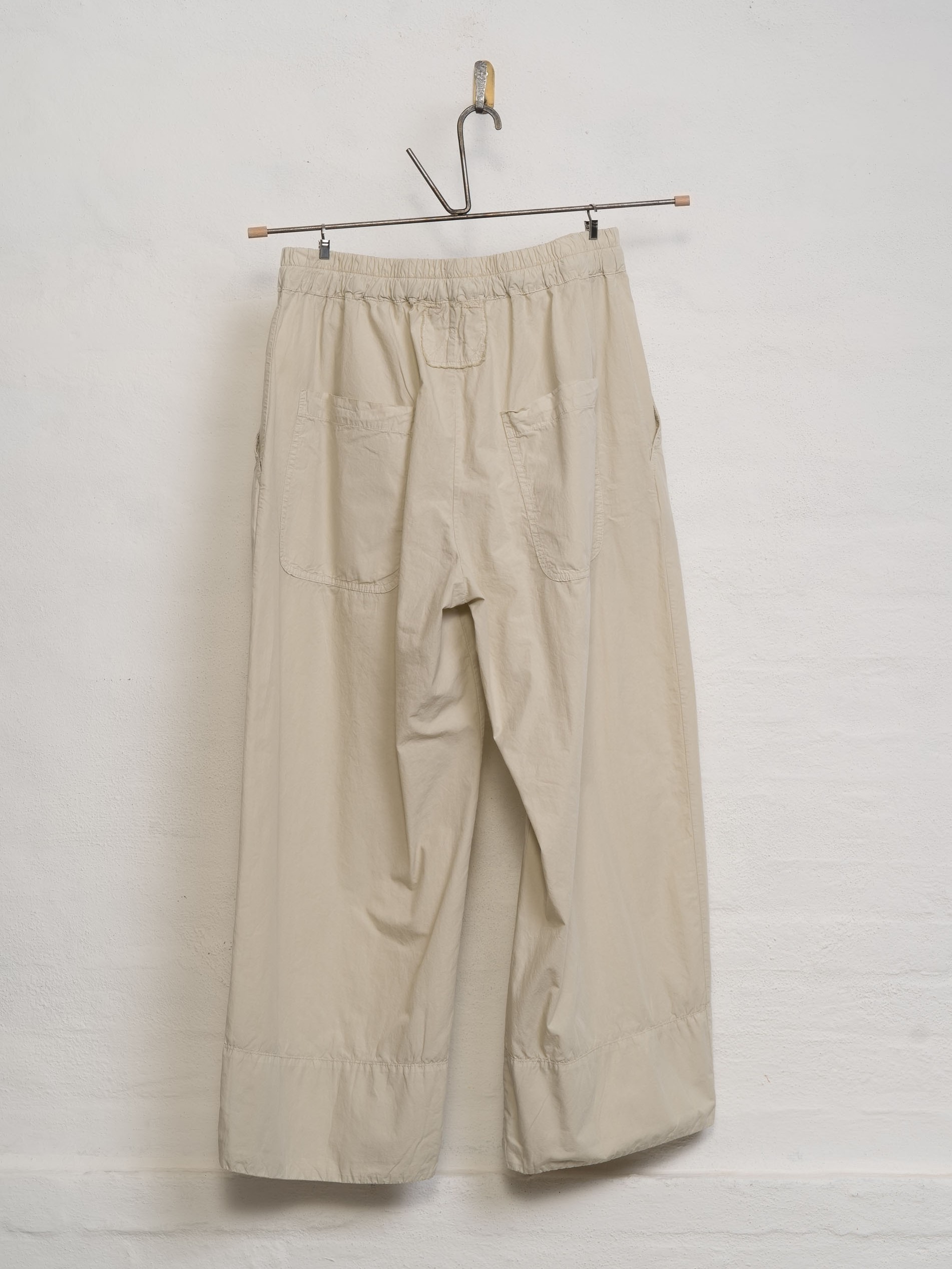 Designed with a relaxed fit, the pants incorporate a hybrid waist construction consisting of a flat front and an elasticated back with an adjustable drawstring. They feature functional side-seam pockets and back pockets, with a silhouette that drapes straight through the hip and narrows slightly at the ankle.