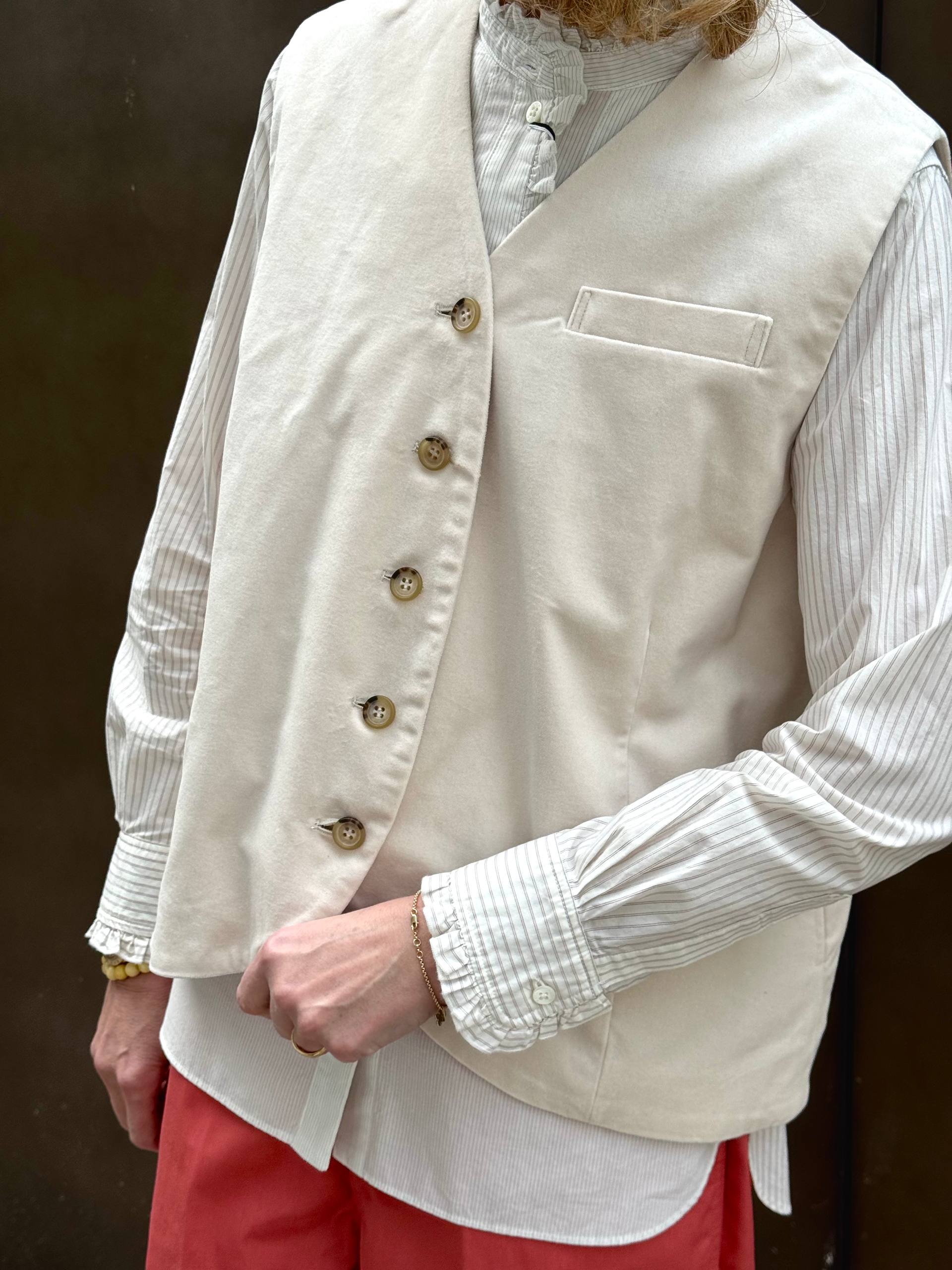 The Annie Velveteen Vest by Sarahwear is a V-neck vest with a full button-up front. The vest has a loose fit and a single small pocket on the upper chest. The material appears to be a plush velveteen fabric, and the vest is lined with a striped pattern.