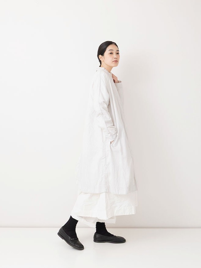 The Arrow Coat by Veritecoeur is named for its arrow-like shape when the arms are spread, due to the absence of seams at the armholes. When worn, the fabric follows the line of the shoulders, creating a clean silhouette.
