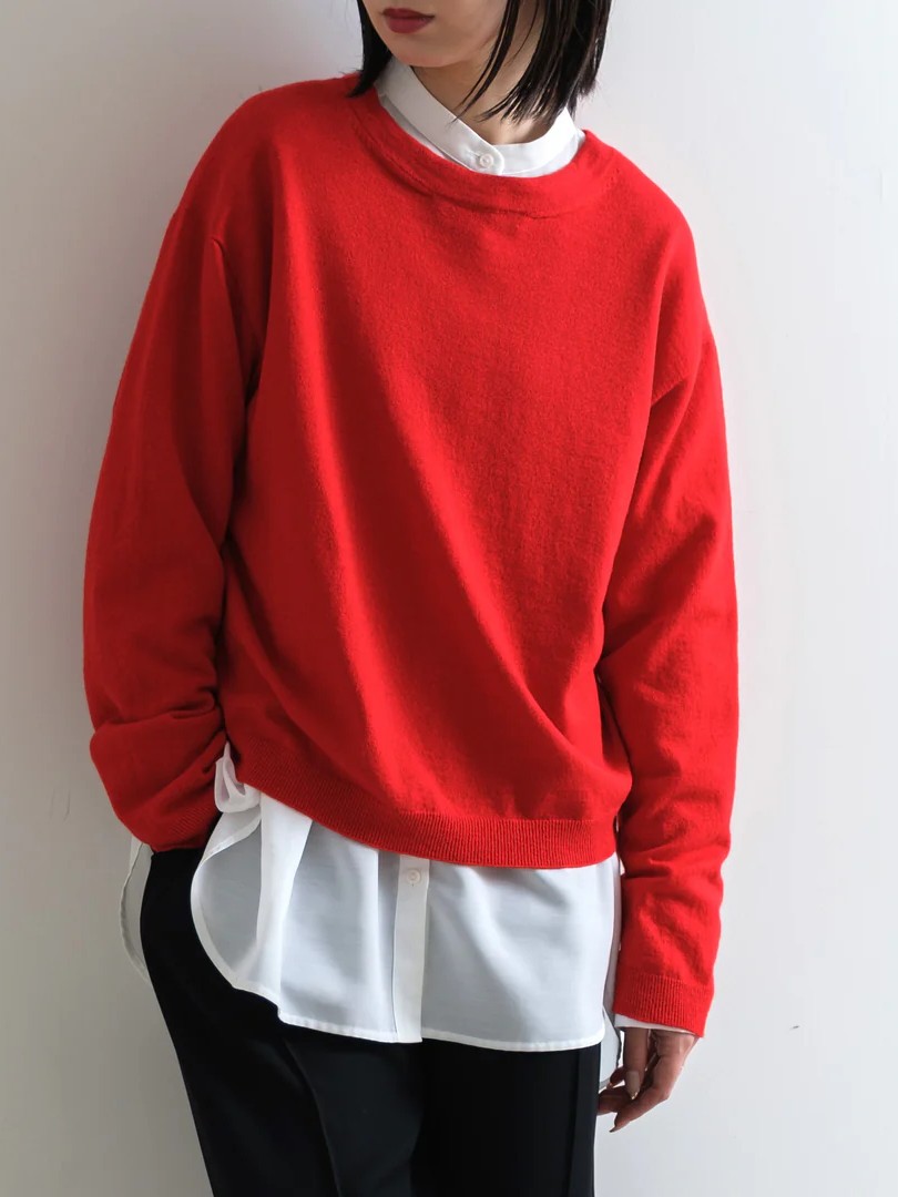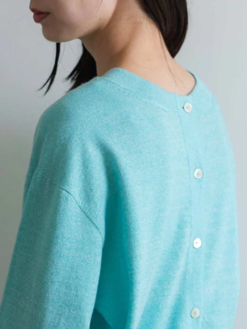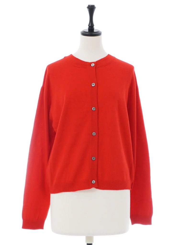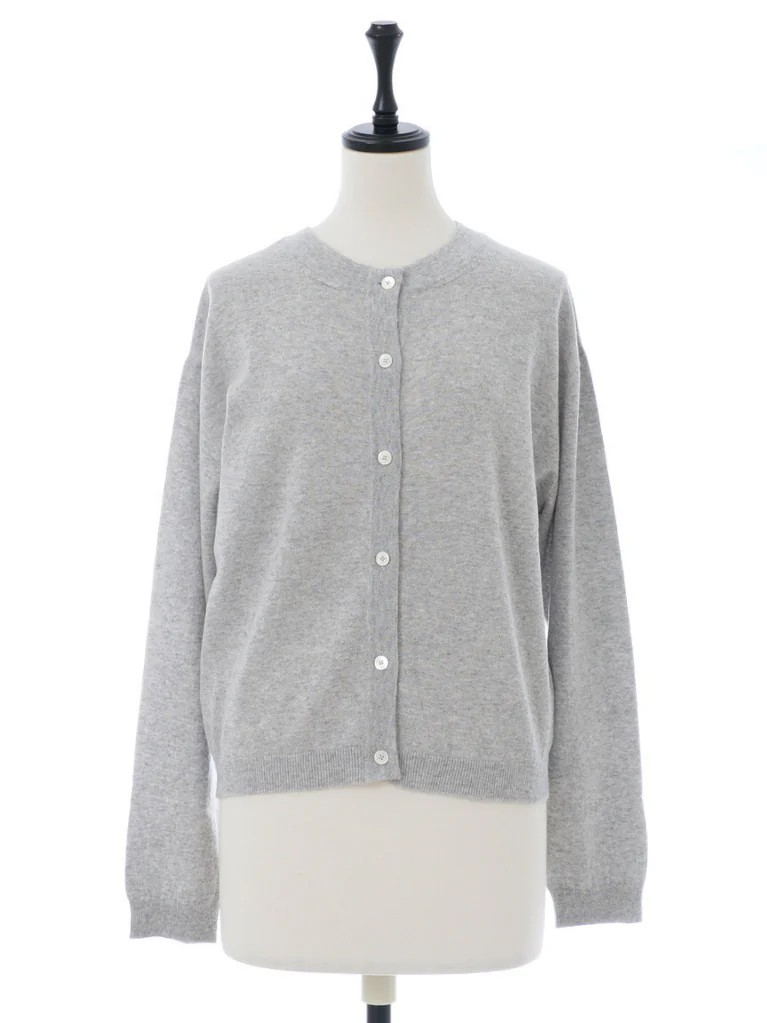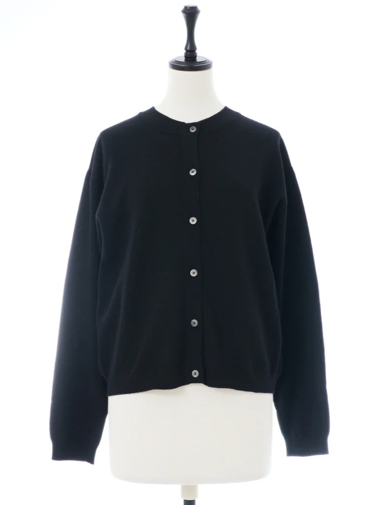 The BABY CASHMERE crew neck cardigan by Toyoboshi is made from delicate and fine baby cashmere, which is supple and soft. It provides a moist feeling and warmth. The texture changes with wear over the years, leading to a sense of ease and attachment. Although it is a basic crew neck cardigan, it is knit using the WHOLEGARMENT technique to achieve a clean silhouette that gently follows the body’s lines. This cardigan can be worn both frontwards and backwards.