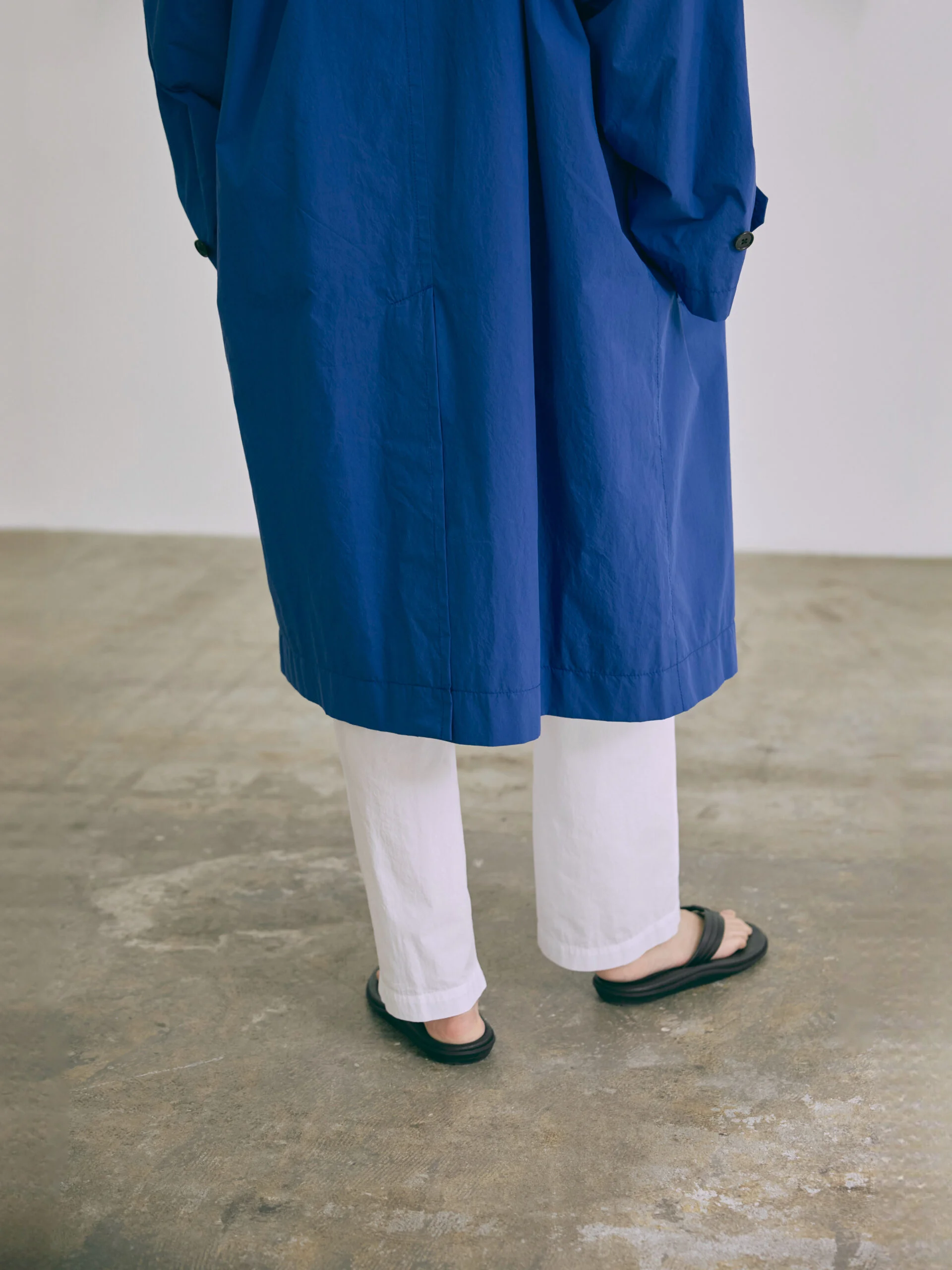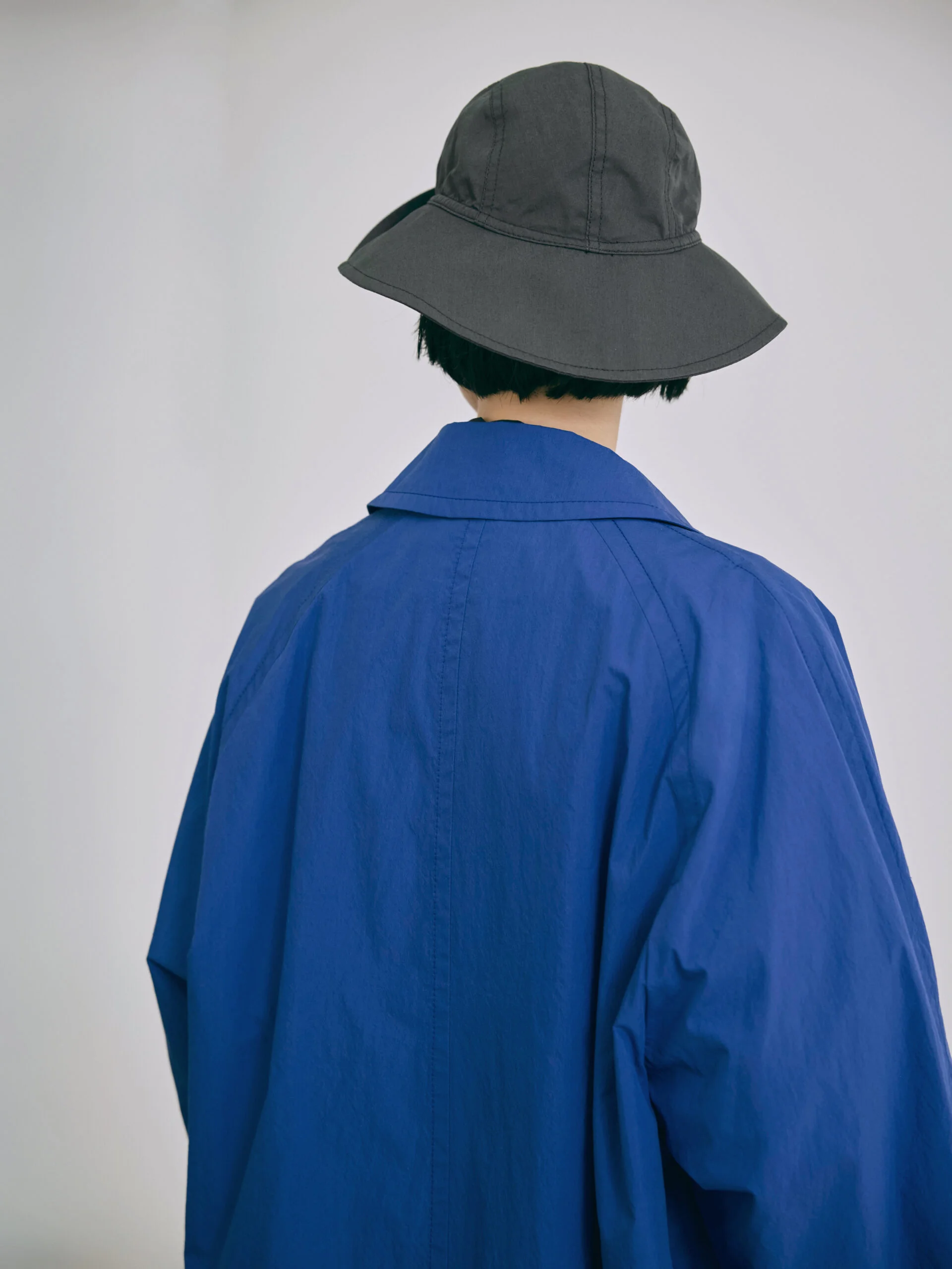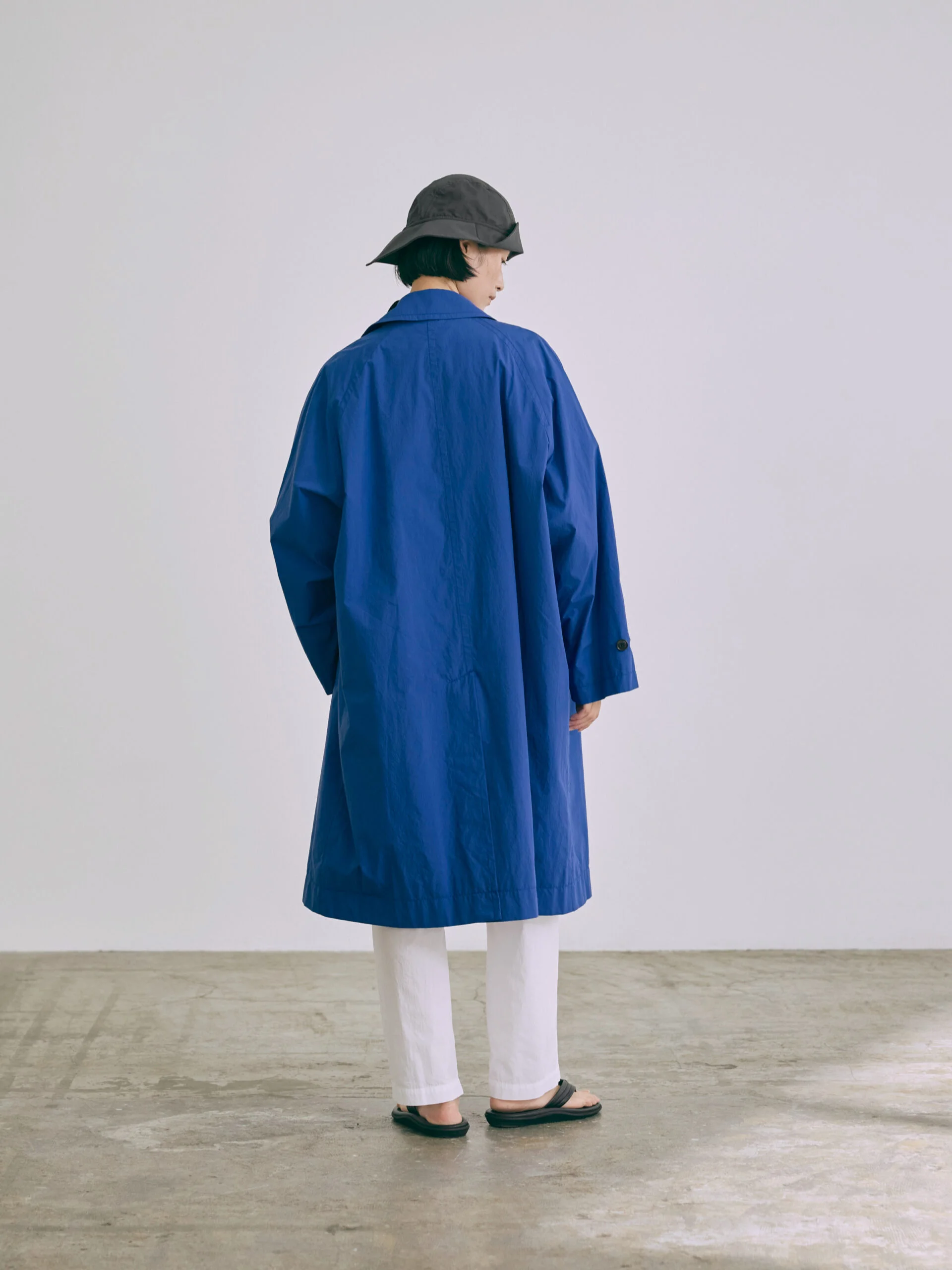 The design is characterized by its functional raglan sleeves and a versatile detachable chin flap, which provides a sophisticated technical accent to the overall aesthetic while maintaining the coat’s clean and timeless appeal.