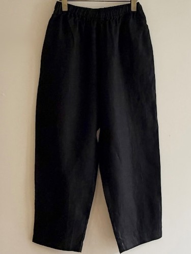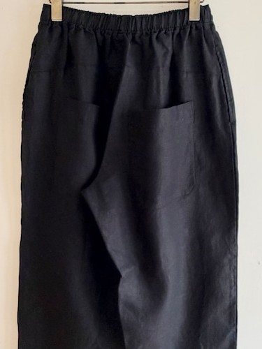 The Balloon Linen Twill Pants by Sarahwear are full-length, wide-leg trousers with a relaxed, slightly tapered silhouette. They feature a comfortable elastic waistband with an adjustable inner drawstring for a personalized fit and convenient side seam pockets and two patch pockets at the back.
