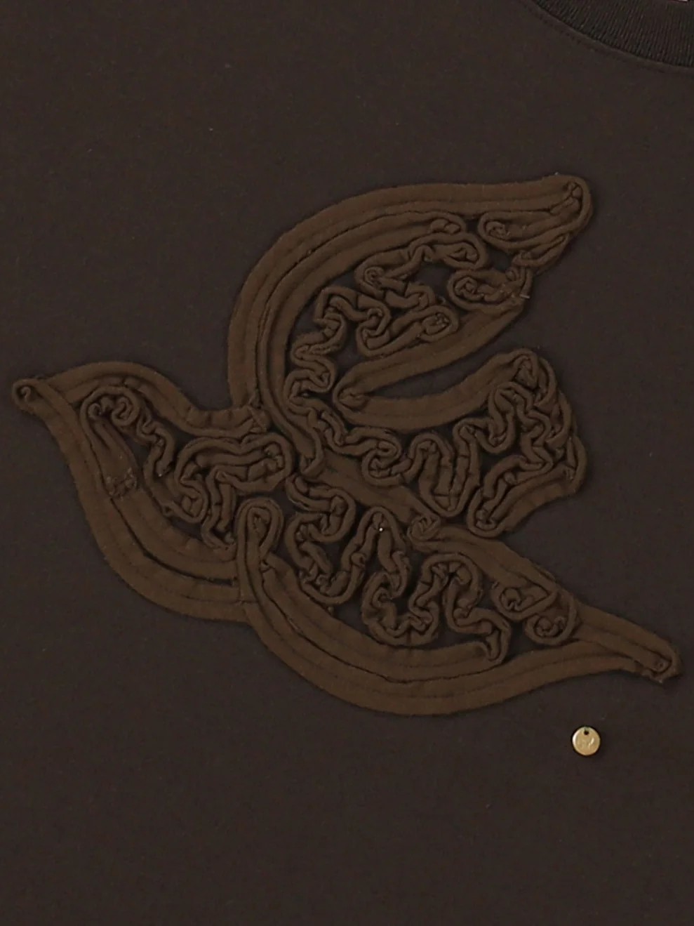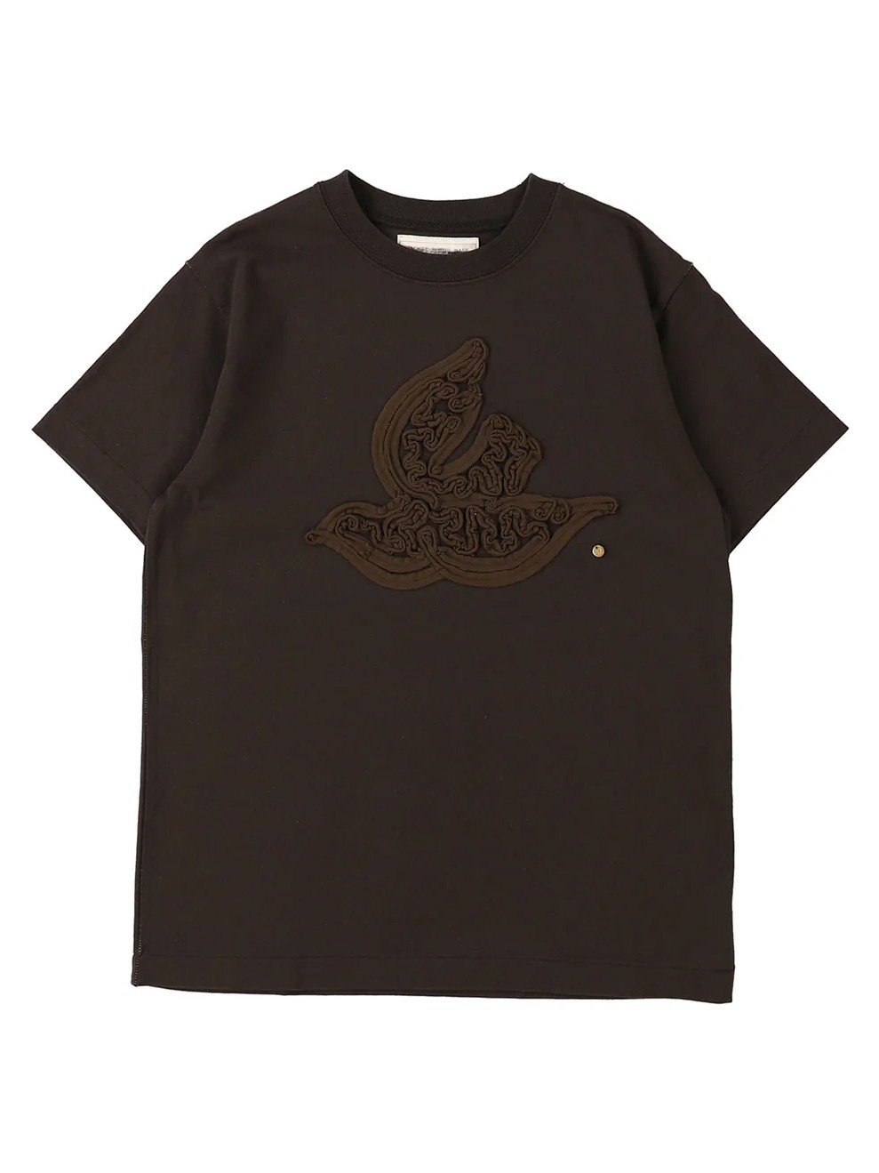 The Bird Tee by Go To Hollywood features a bird embroidered with tape, prominently displayed on the chest as a central design element. This peaceful piece is engineered to provide a sense of calm to the wearer, offering a unique tactile texture through its specialized embroidery technique.