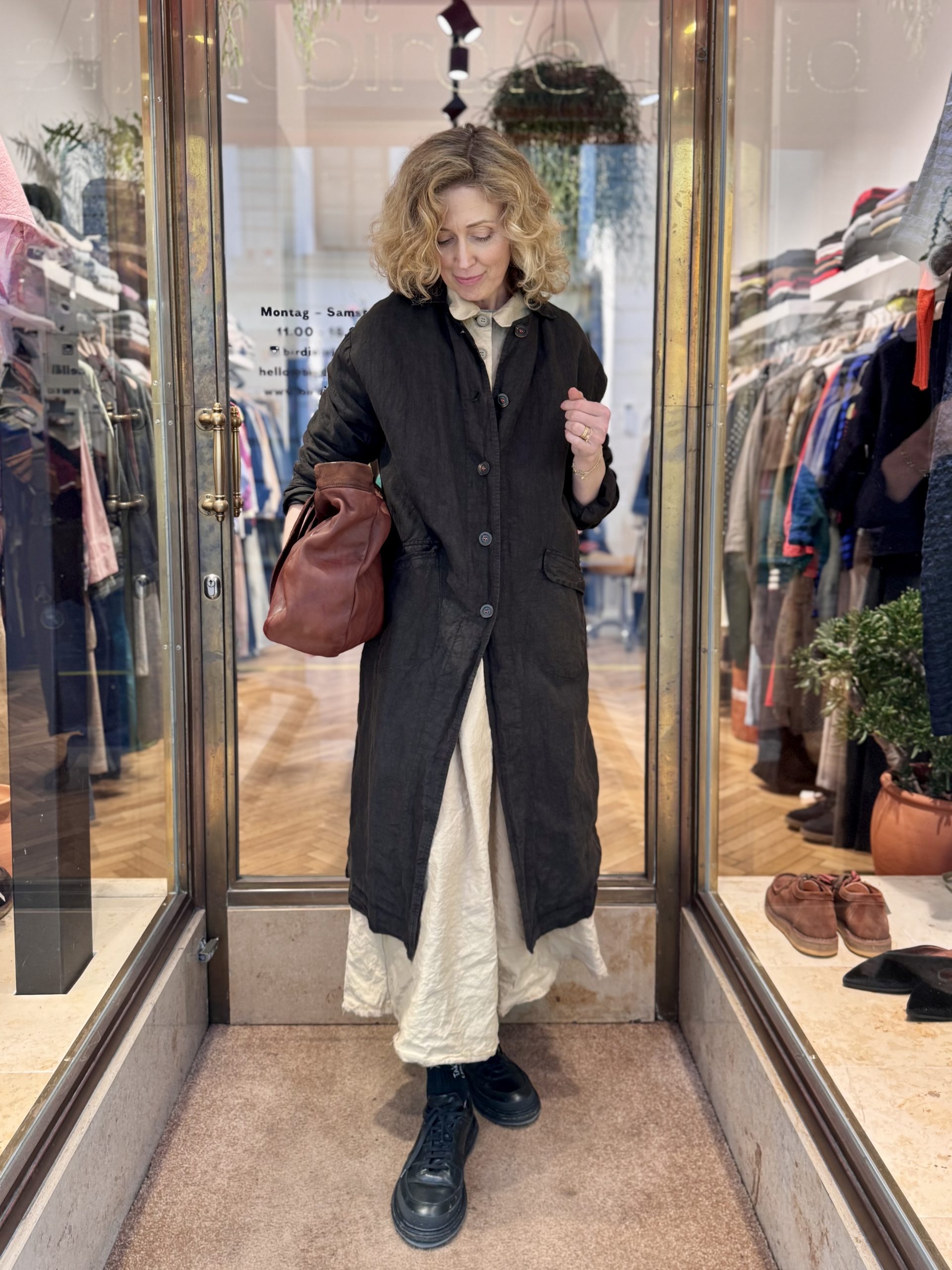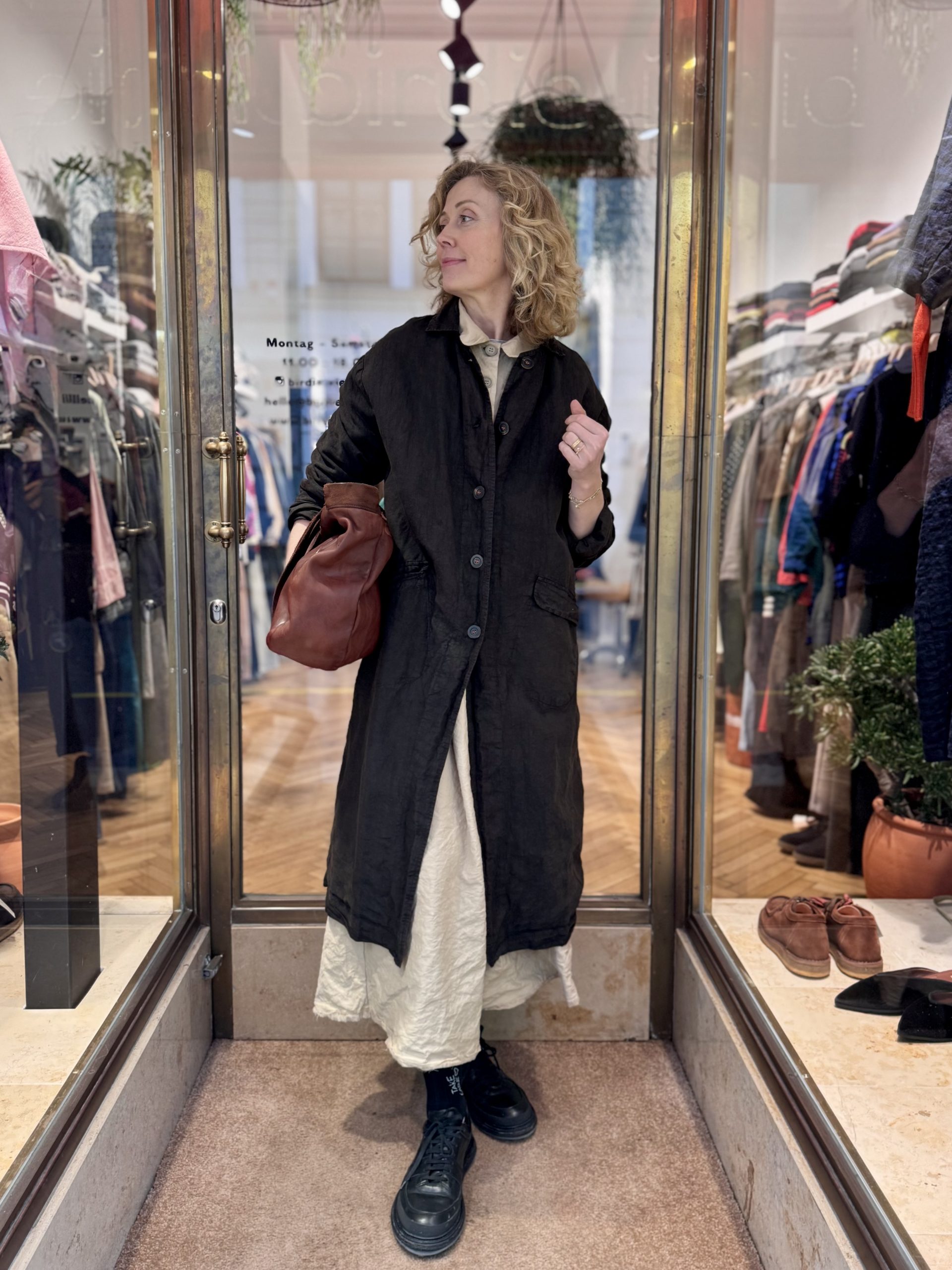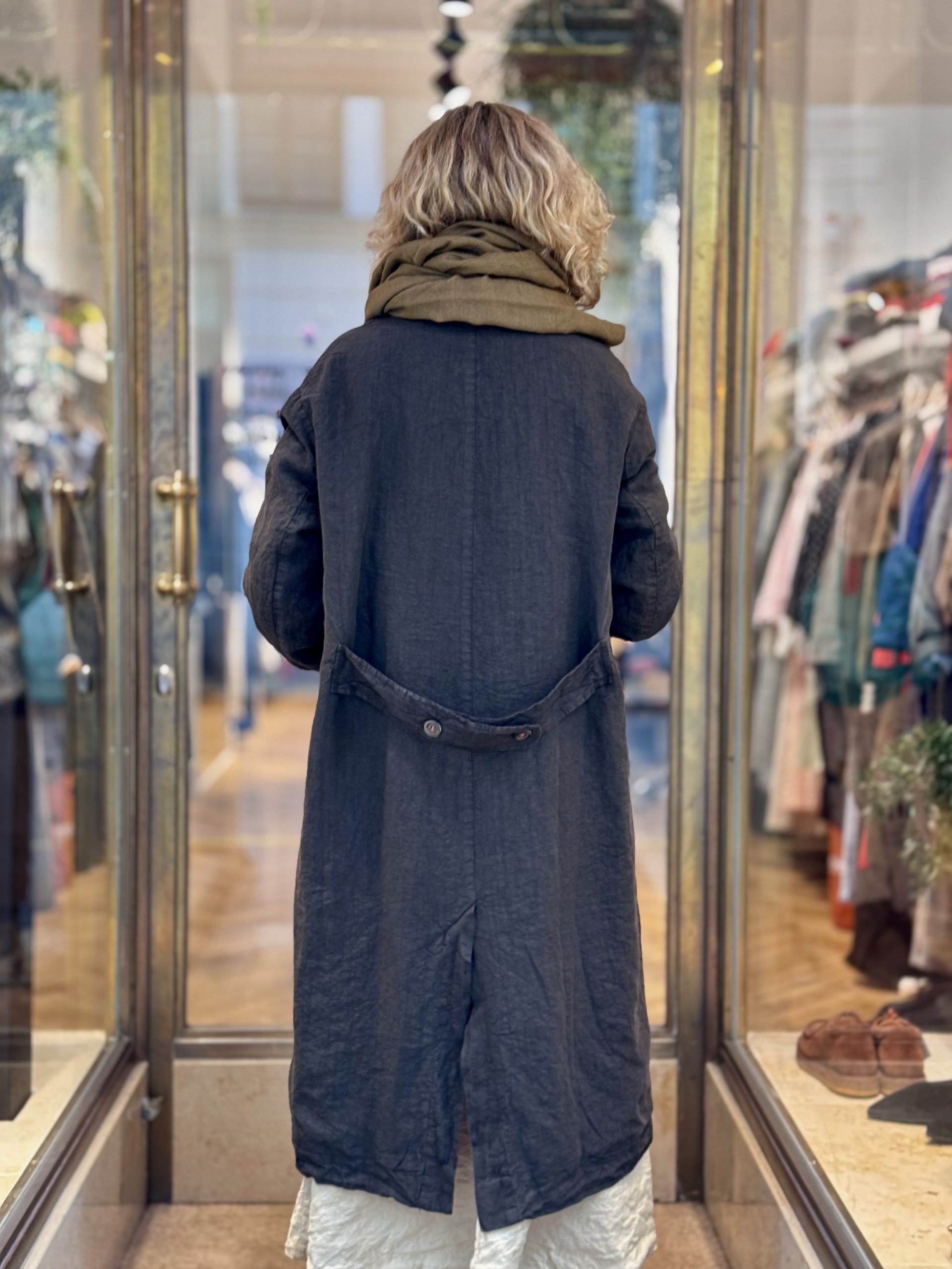 The Camila Coat by H+ Hannoh Wessel is a refined spring linen coat featuring a spread collar. It is fully lined in comfortable cotton, offering a luxurious feel against the skin. Functional front flap pockets add a touch of practicality, while a back slit ensures ease of movement.