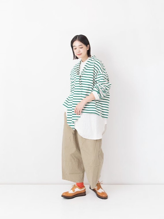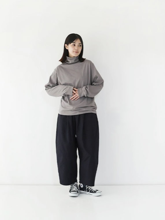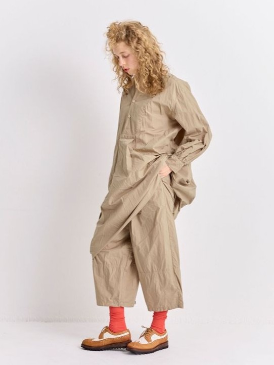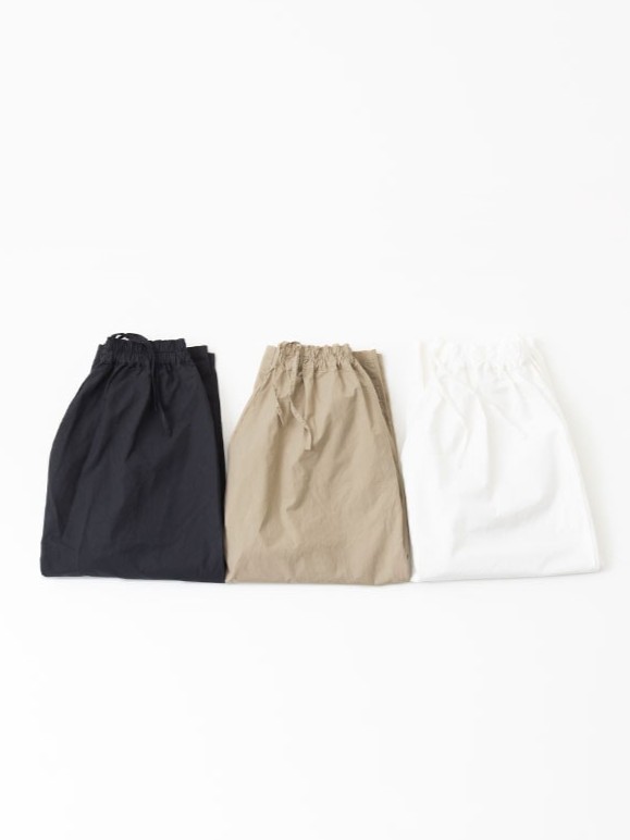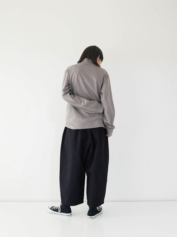 The Cocoon Pants by Veritecoeur feature a distinctive, rounded cocoon silhouette created by a seam at the hem. They have a relaxed fit with tucks at the front to allow extra room around the waist. The waist is designed for ease of wear with elastic and a drawstring. The material is a firm, mid-weight cotton weathercloth woven from thick, high-density yarn, which helps give the silhouette a three-dimensional appearance. A product dye finish provides a casual look that suits being washed and worn.