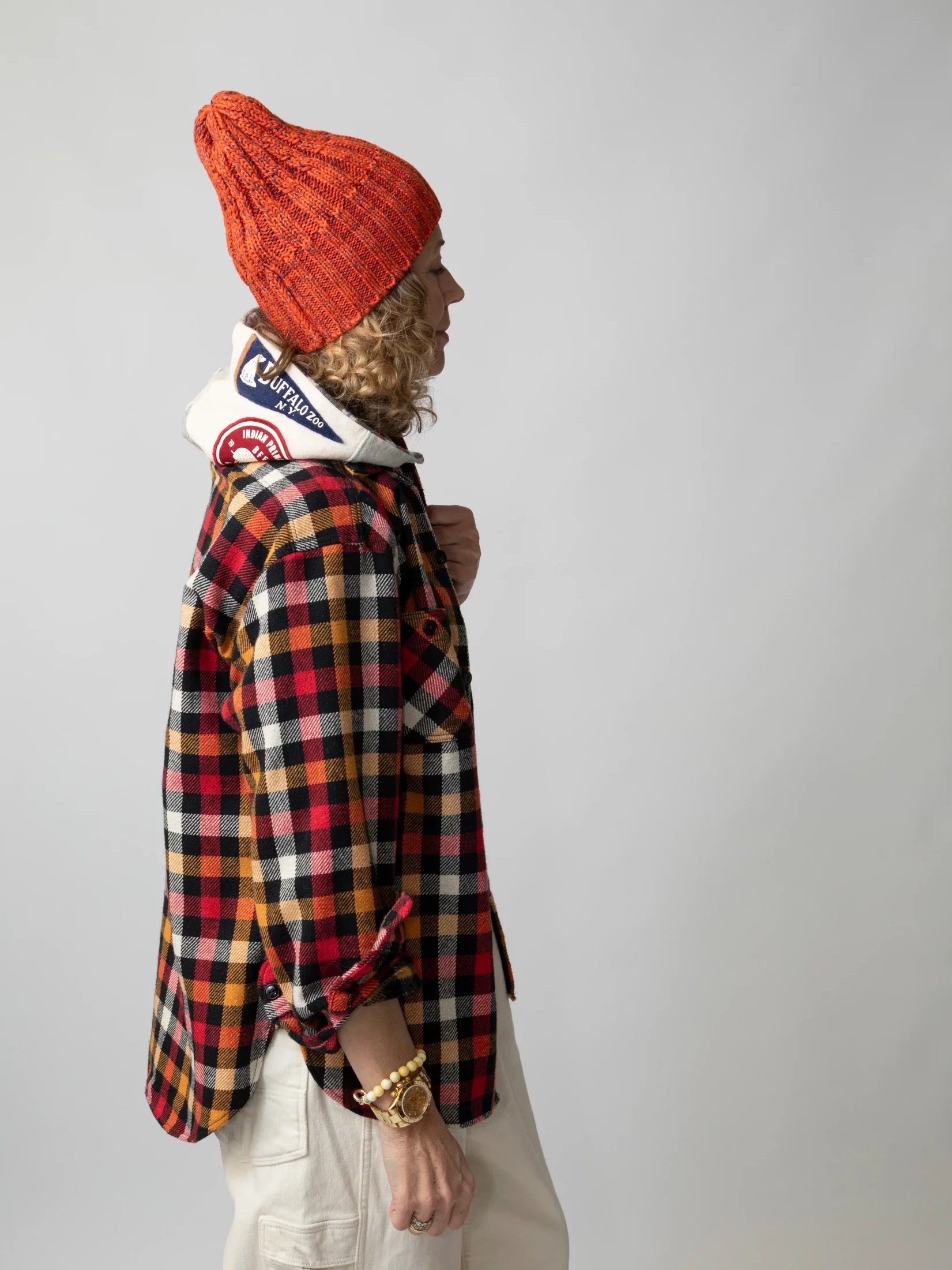 A long-sleeved checkered shirt made of original fabric using a blend of cotton and polyester yarn.