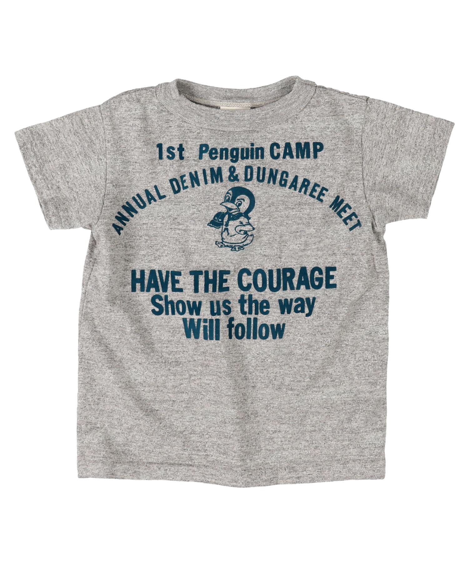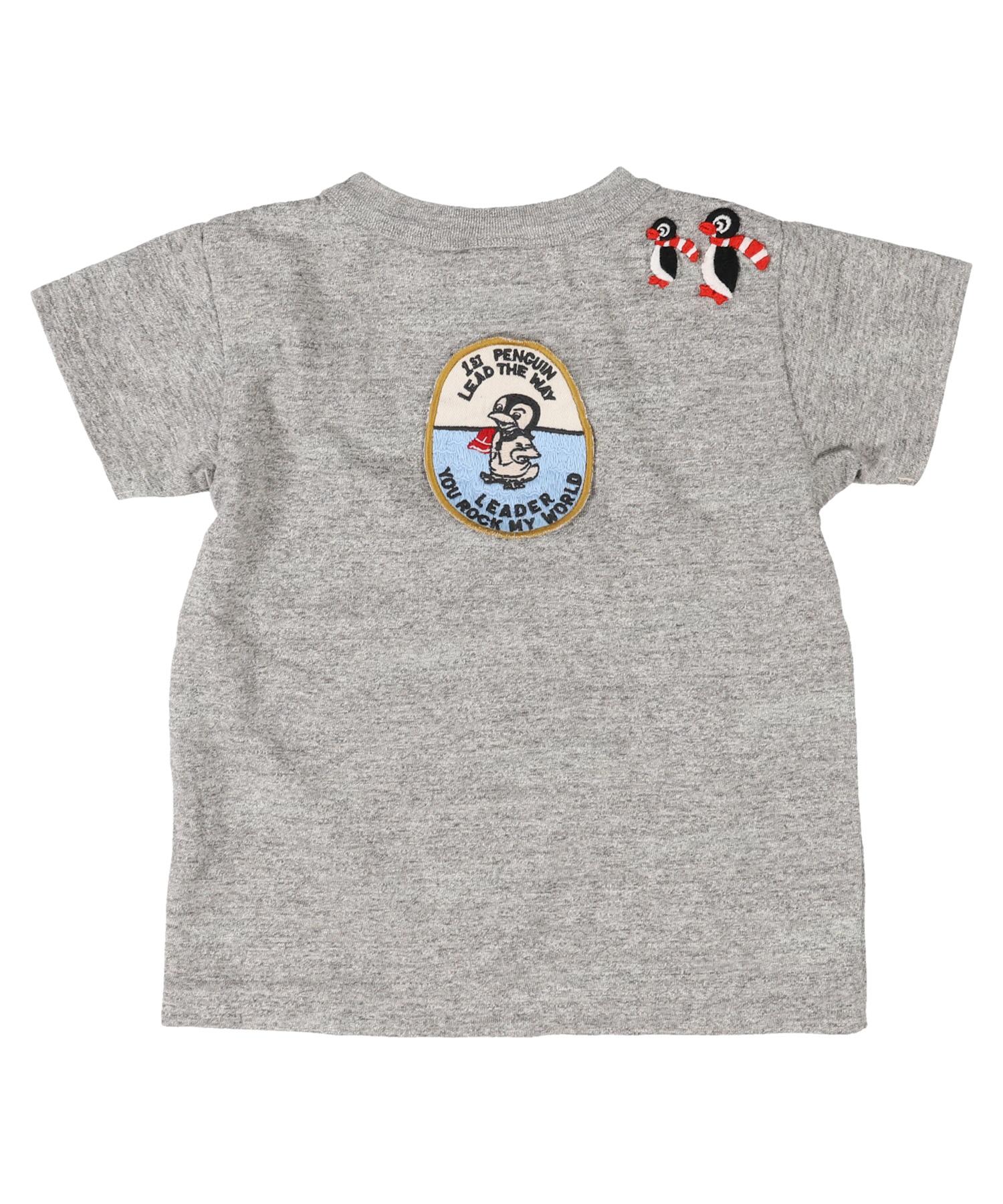 The Tompkin Plain Stitch 1st by Denim Dungaree is a short-sleeved t-shirt in a gray marl fabric. It features a large embroidered patch and two small, stitched penguin appliques on the back. The front of the shirt has a printed graphic featuring a penguin illustration and curved text. This t-shirt is a funny and easy choice for everyday wear.
