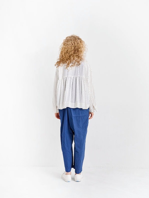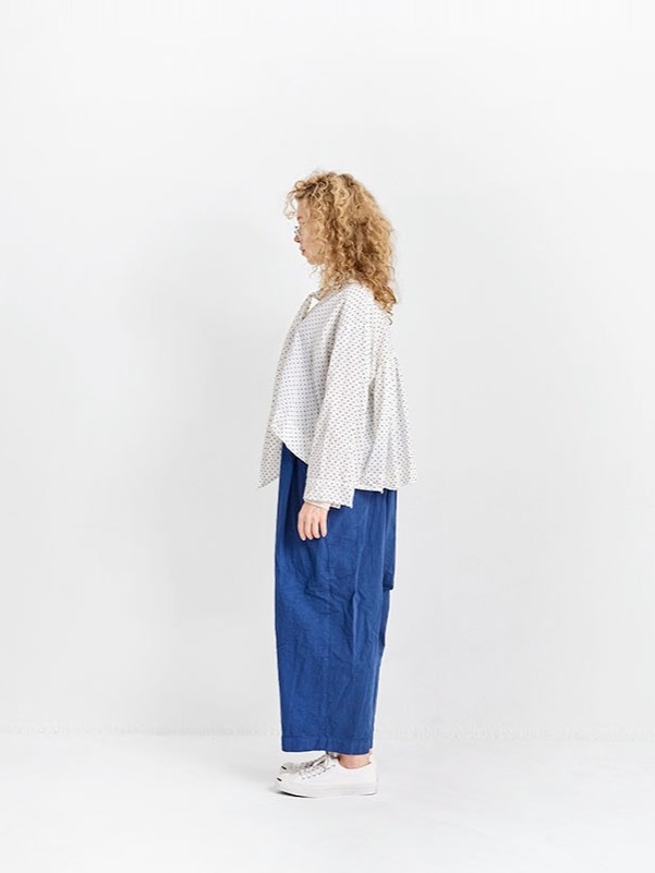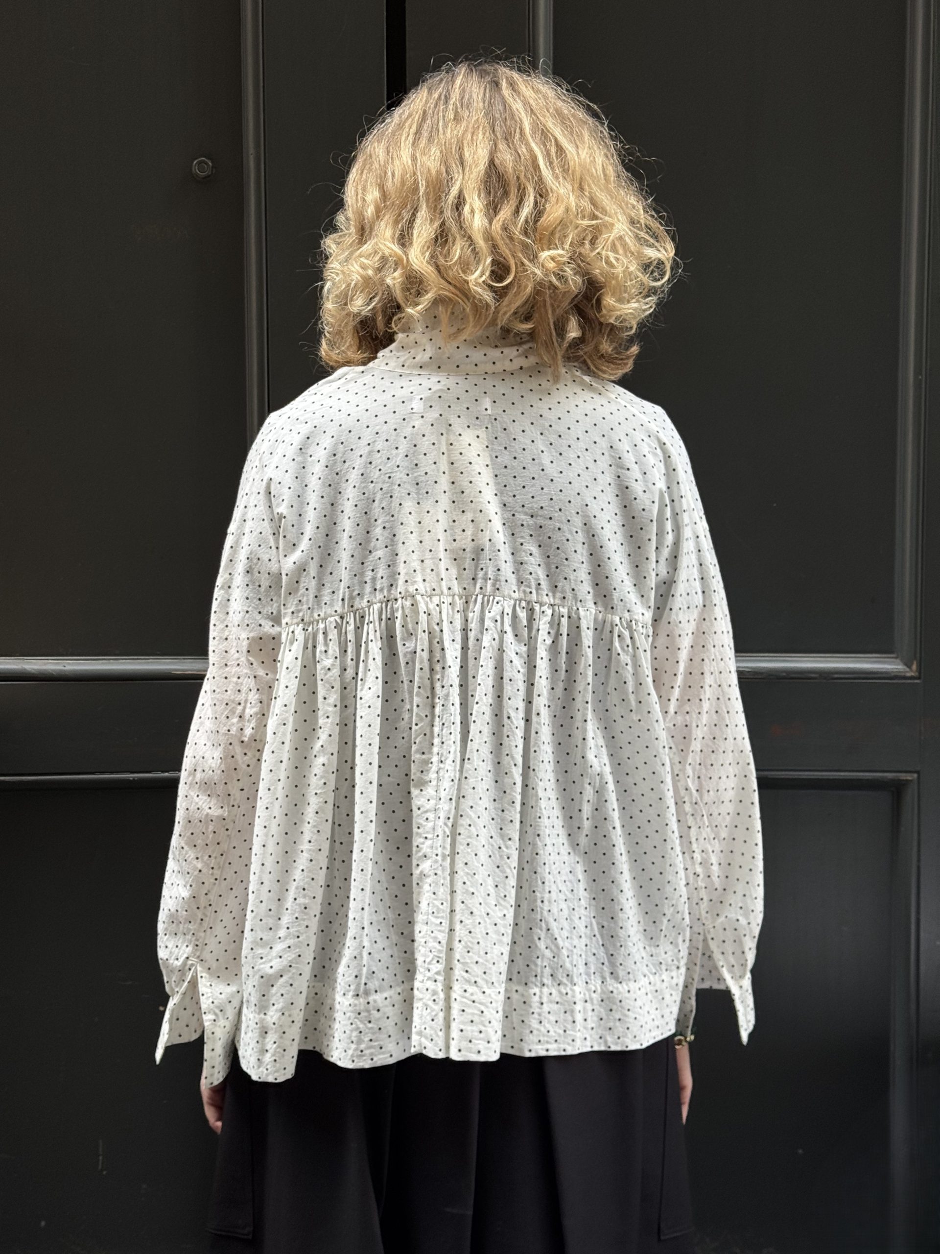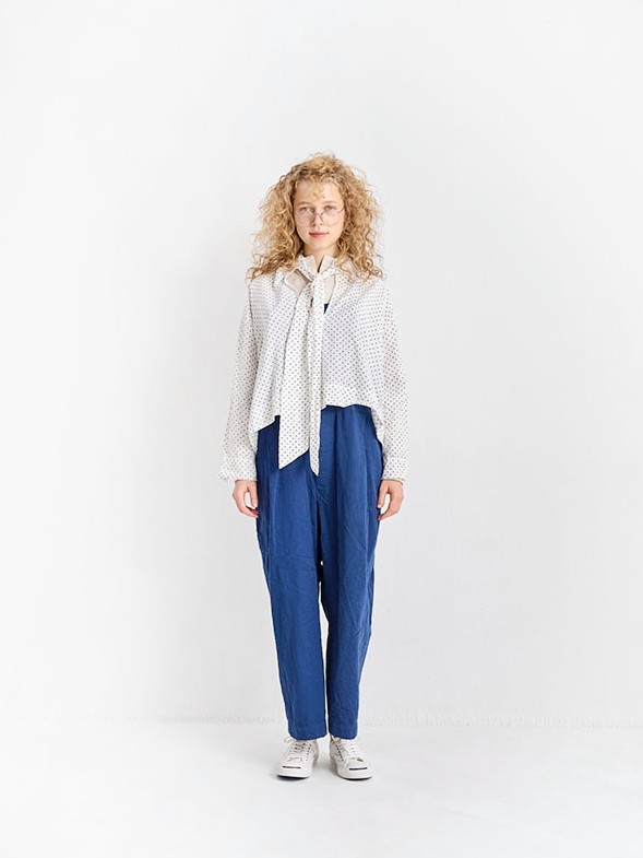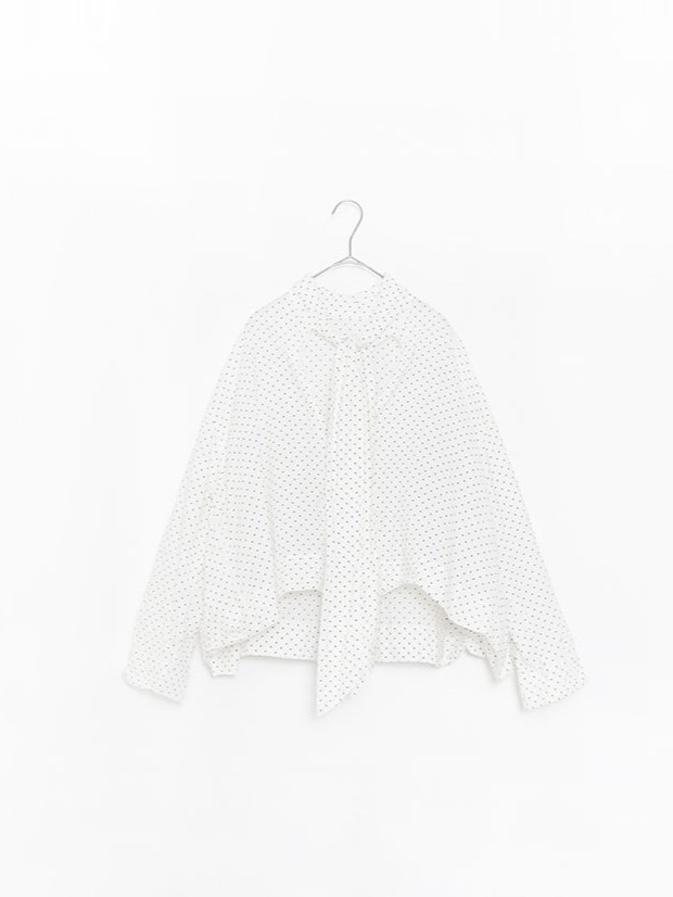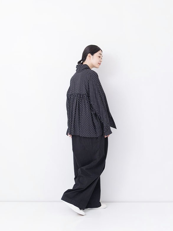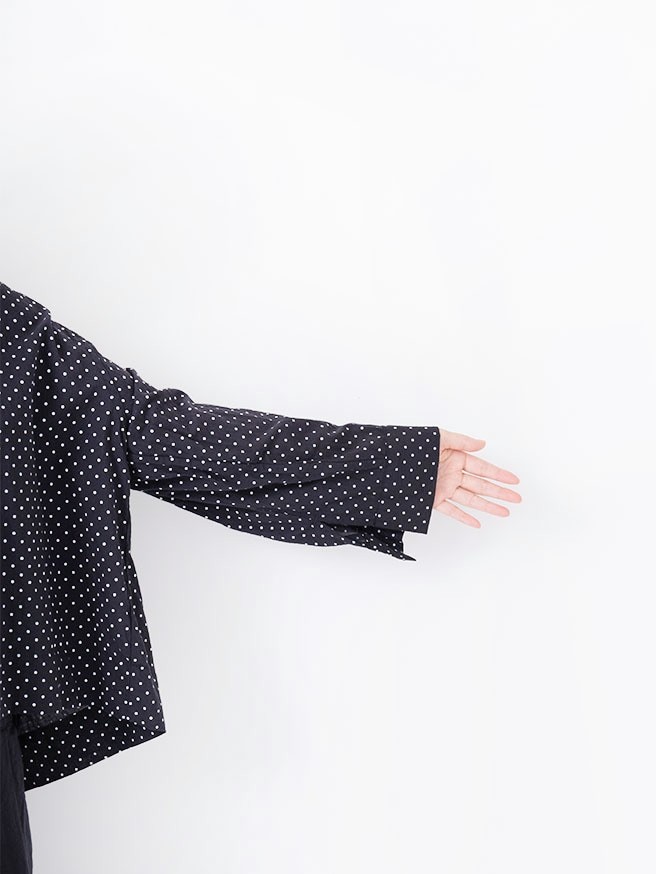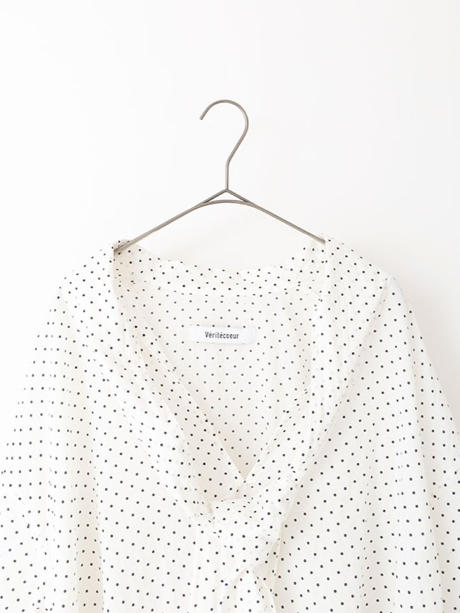 The Dot Tie Collar Blouse by Veritecoeur is made from a thin lawn material that combines fine cotton and silk. This tie-collar blouse has a compact length and can be styled in different ways by changing how the tie is worn. The front has shirt sleeves, while the back features gathered yoke sleeves, which creates a different look from the front to the back.