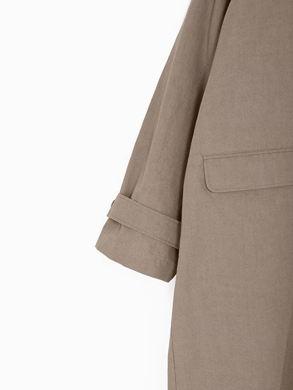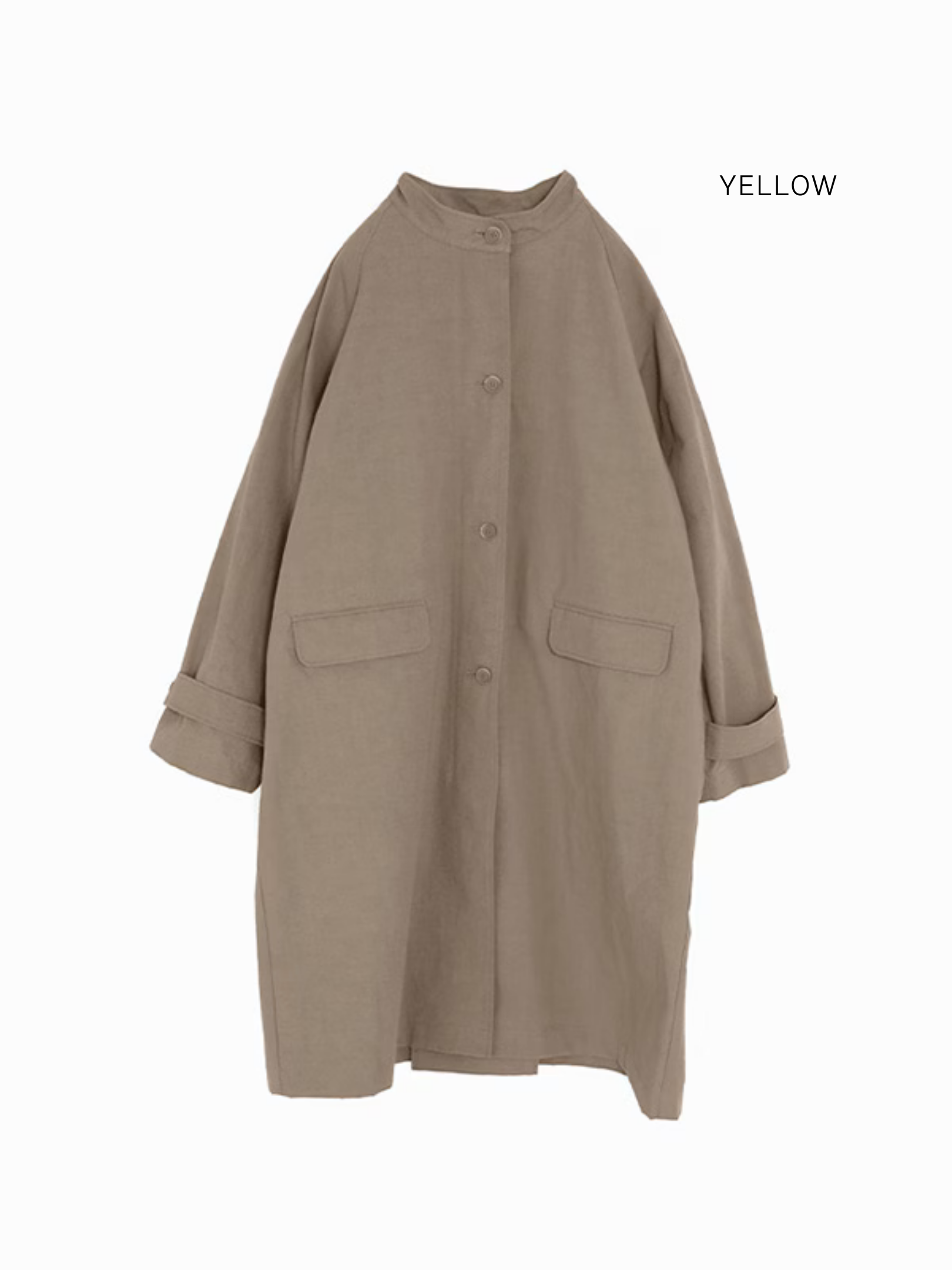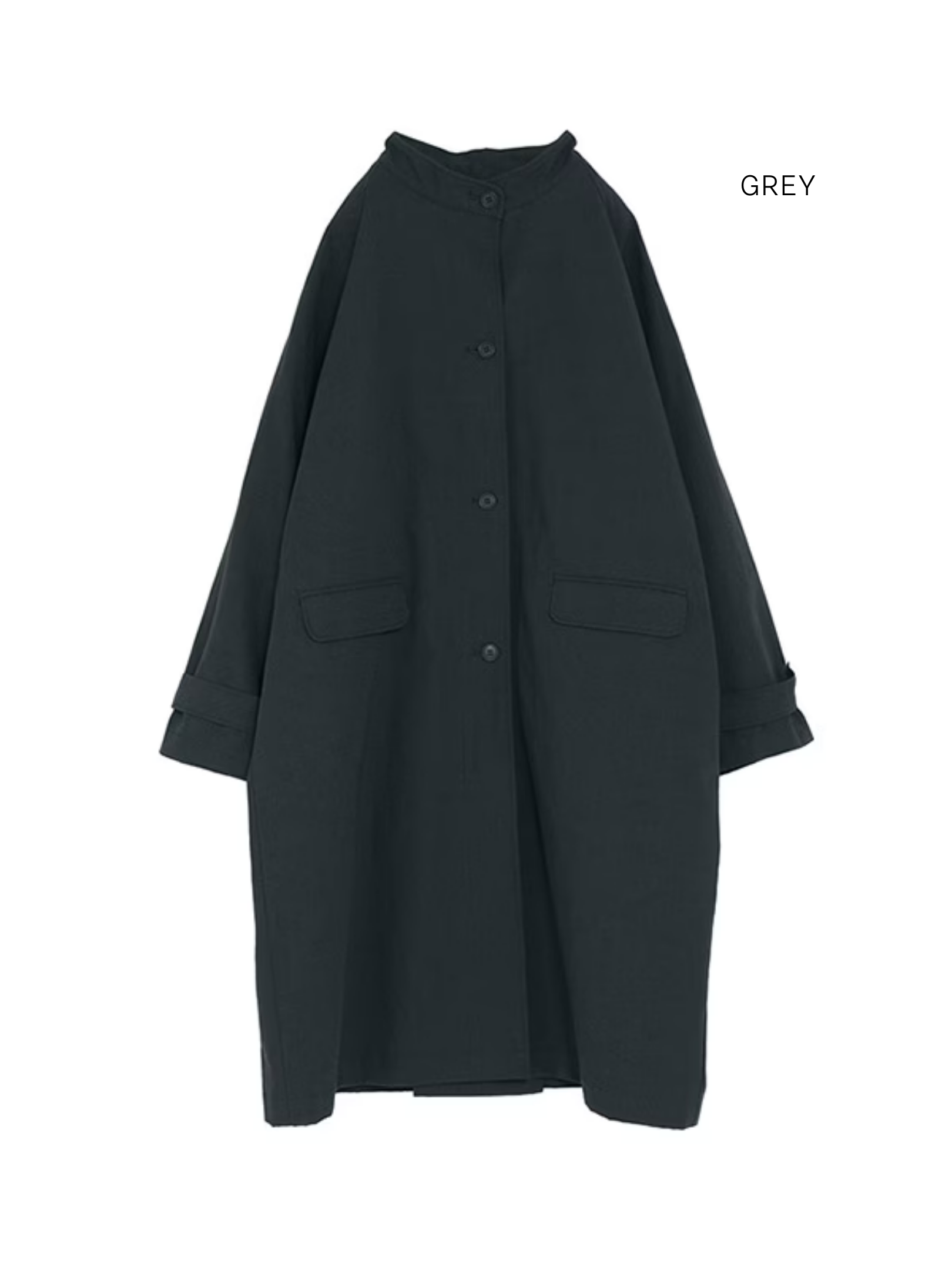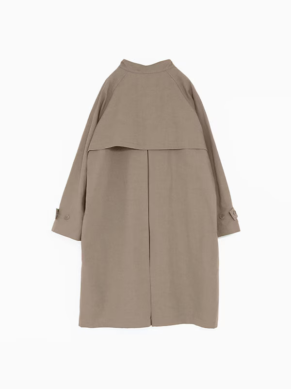 It is designed with raglan sleeves that drape naturally from the shoulders to create a relaxed silhouette, complemented by a stand-up collar for a clean and elegant look. This coat combines a high-quality yet casual feel, making it suitable for a variety of situations both on and off the job.
