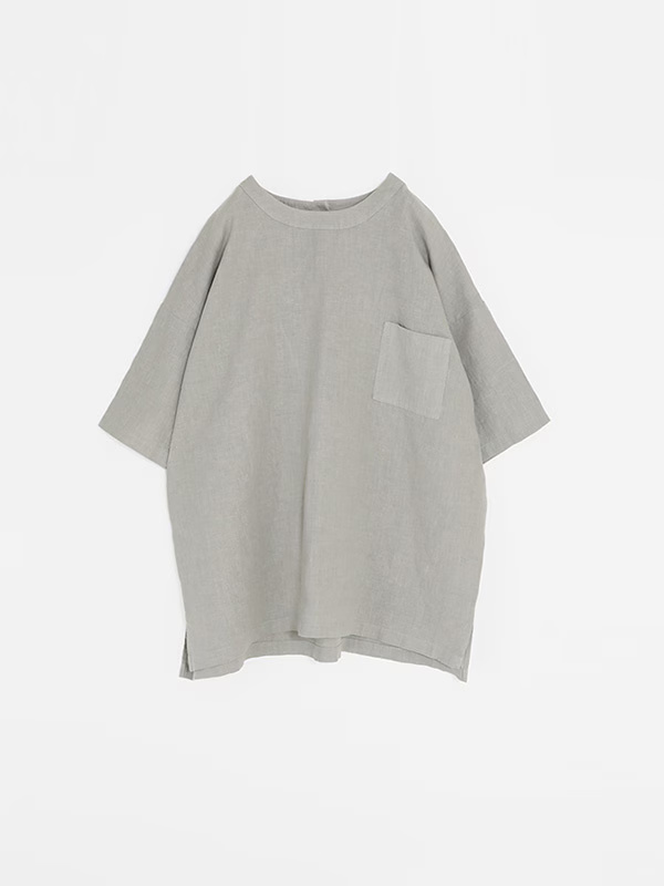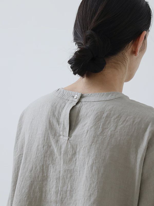 The Linen HS Pullover by Evam Eva is constructed from water-twisted linen, a high-quality fabric created by slowly twisting yarn through water to tighten the fibers for a naturally smooth and durable finish. This wrinkle-resistant material is designed for frequent use from spring through autumn and features warm seasonal colors that distinguish it from winter iterations.