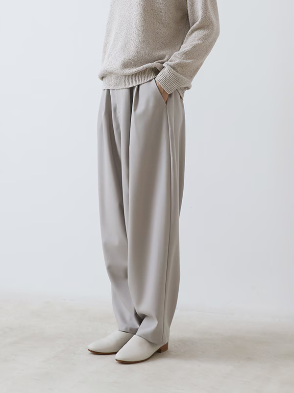 The Wool Volume Pants by Evam Eva feature an elegant luster and the characteristic drape of wool, providing a wrinkle-resistant quality suitable for use in any season. These pants are designed with a voluminous, curved silhouette that offers a comfortable fit and is recommended for both women and men. They can be coordinated for a relaxed appearance or paired with accessories like a belt to achieve a clean, mannish look.