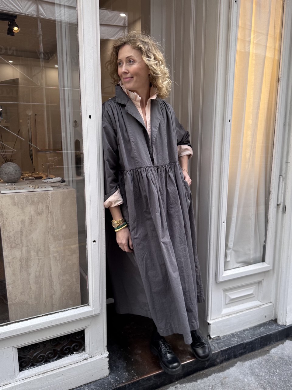 The Favorite Dress by Veritecoeur is a voluminous A-line dress with generous gathers at the waist. It has a relaxed feel with an open collar and a buttonless front. The dress is made from cotton twill that features a crisp wrinkled texture from a catch-washer process, applied to a high-density weave of fine combed yarn. The manual nature of this finishing process creates unique, individual wrinkles.