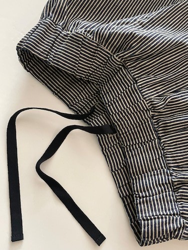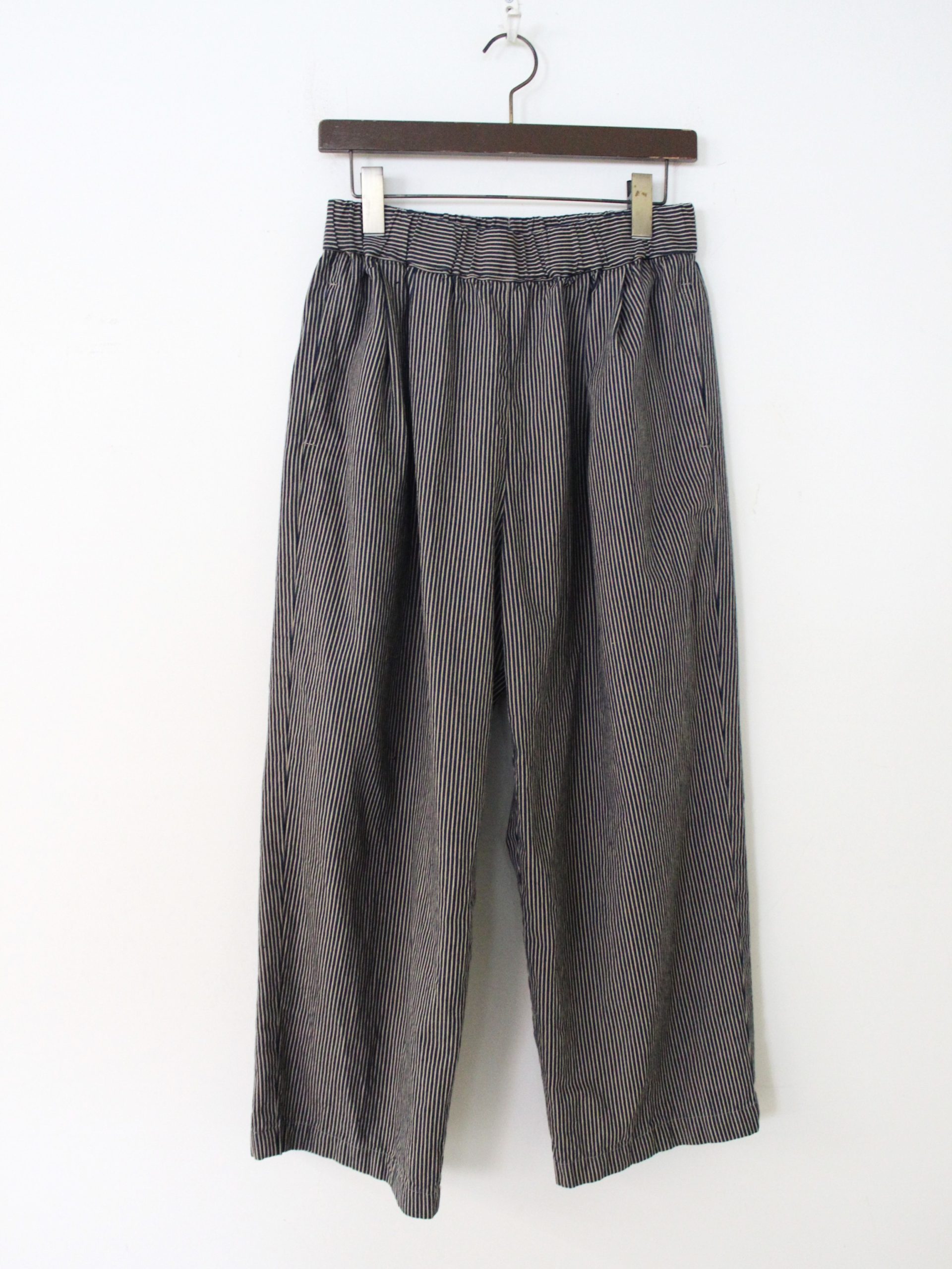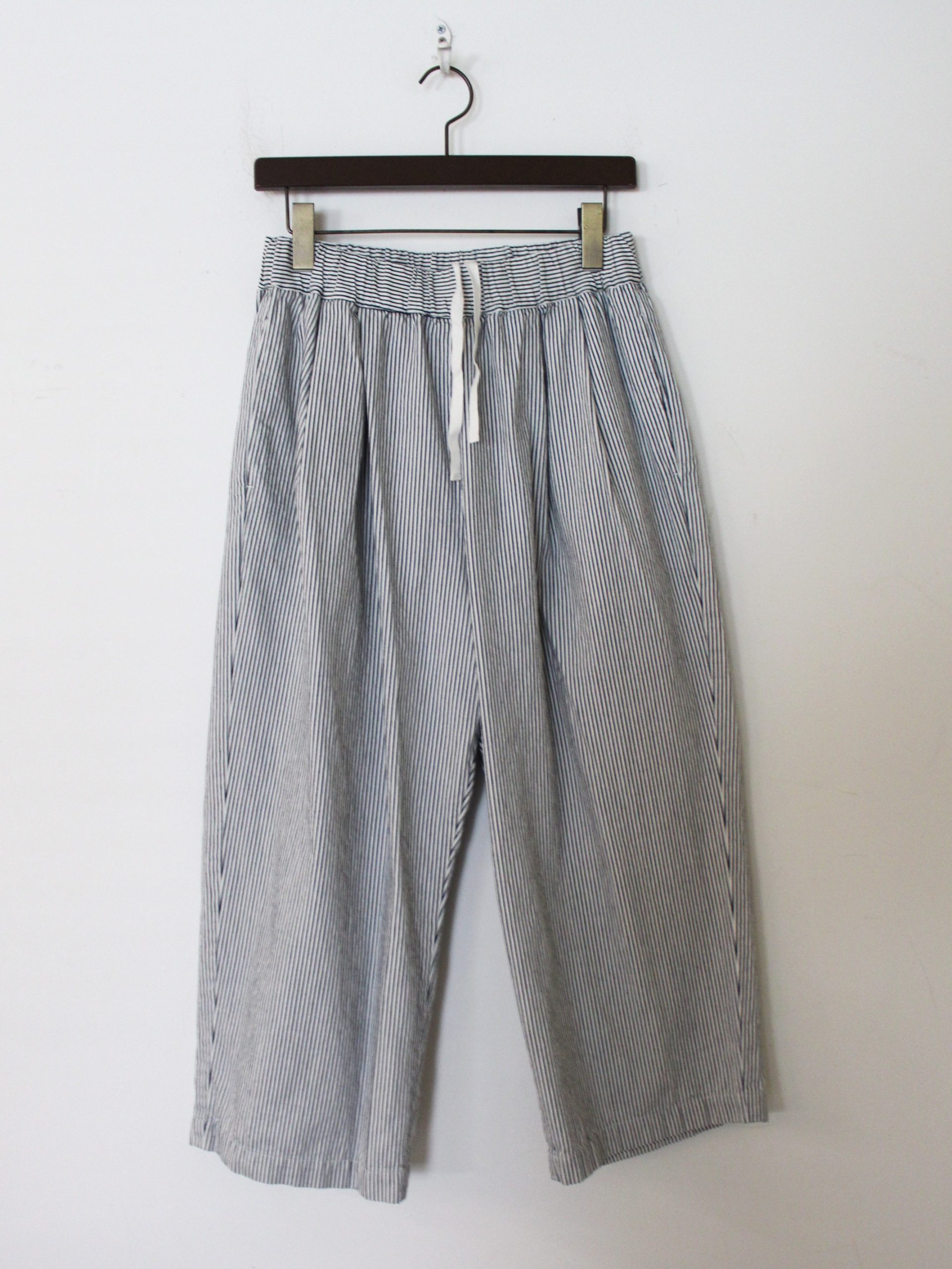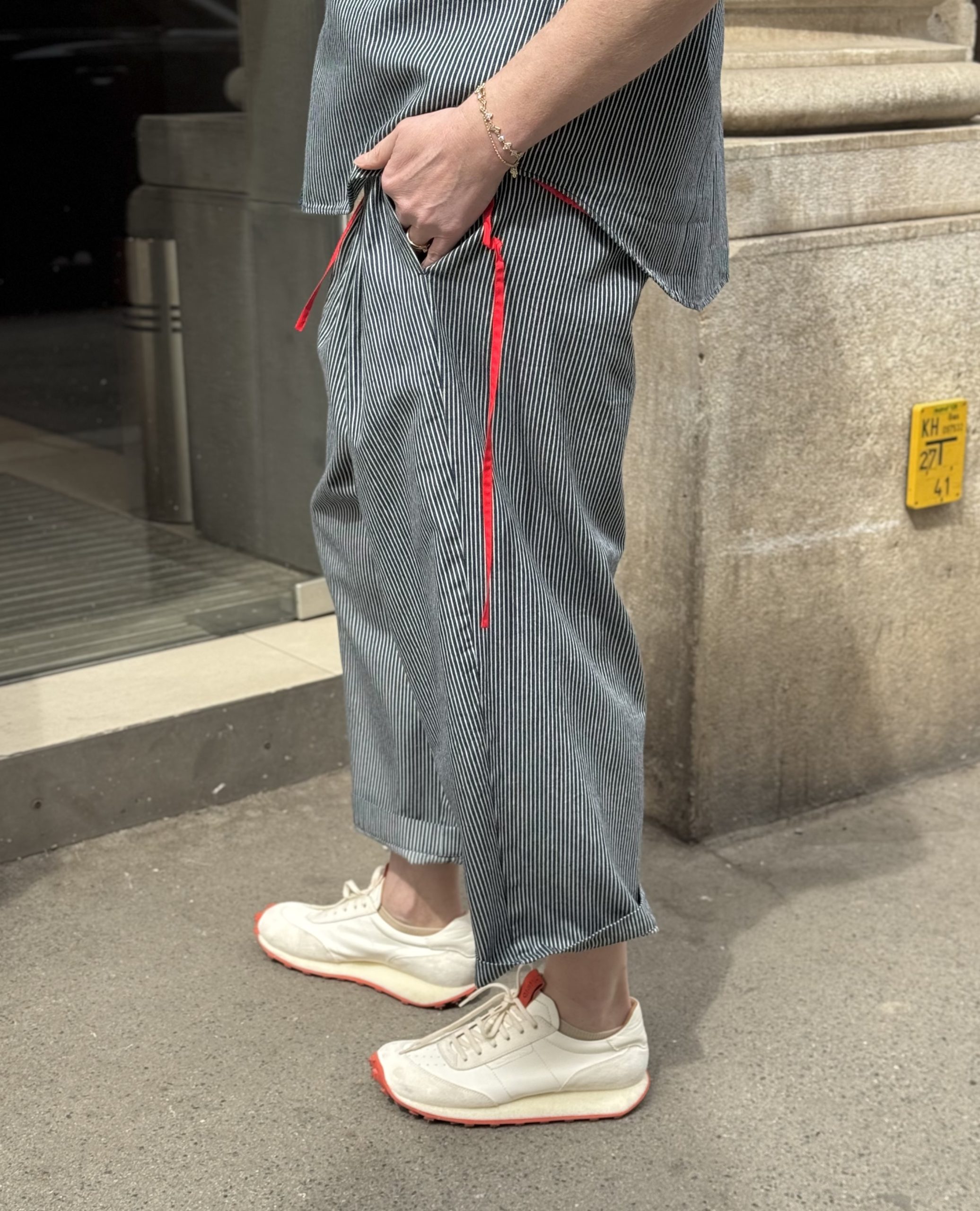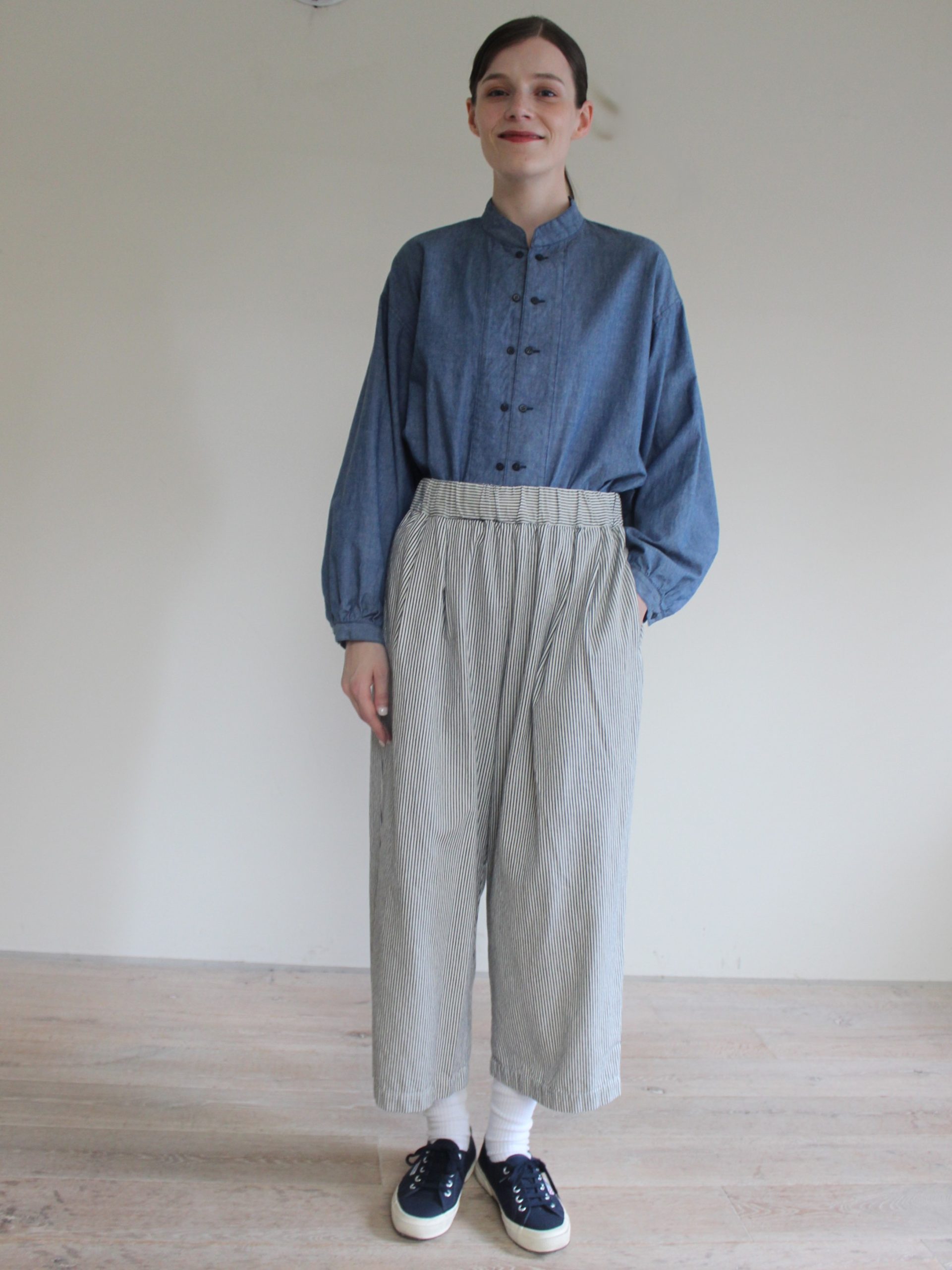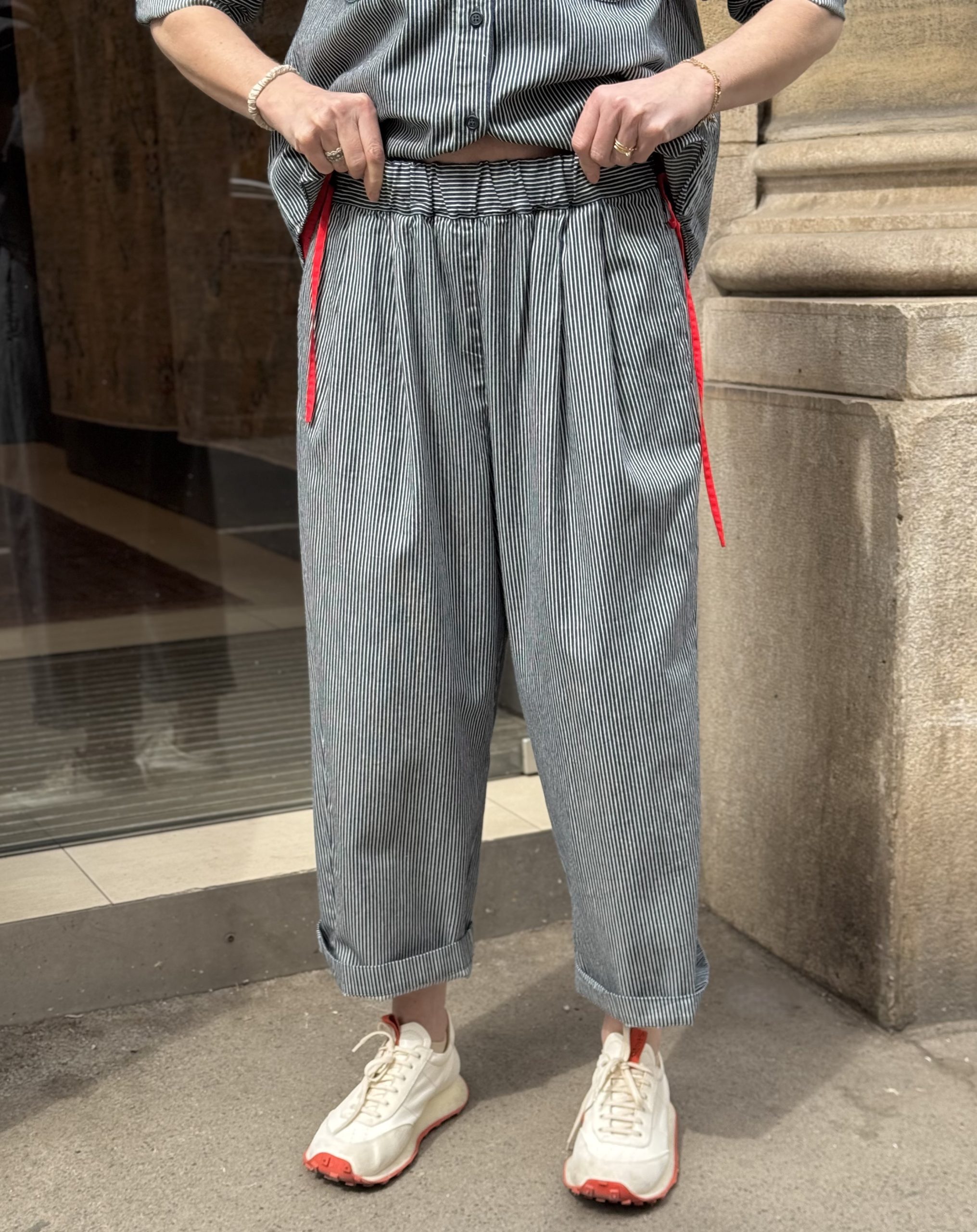 The Fine Hickory Cozy Pants by Sarahwear are high-rise cropped pants inspired by the loose-fitting silhouettes of the 80s. They are crafted from a specialized hickory fabric that is remarkably light, supple, and soft to the touch.