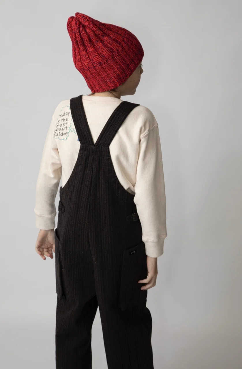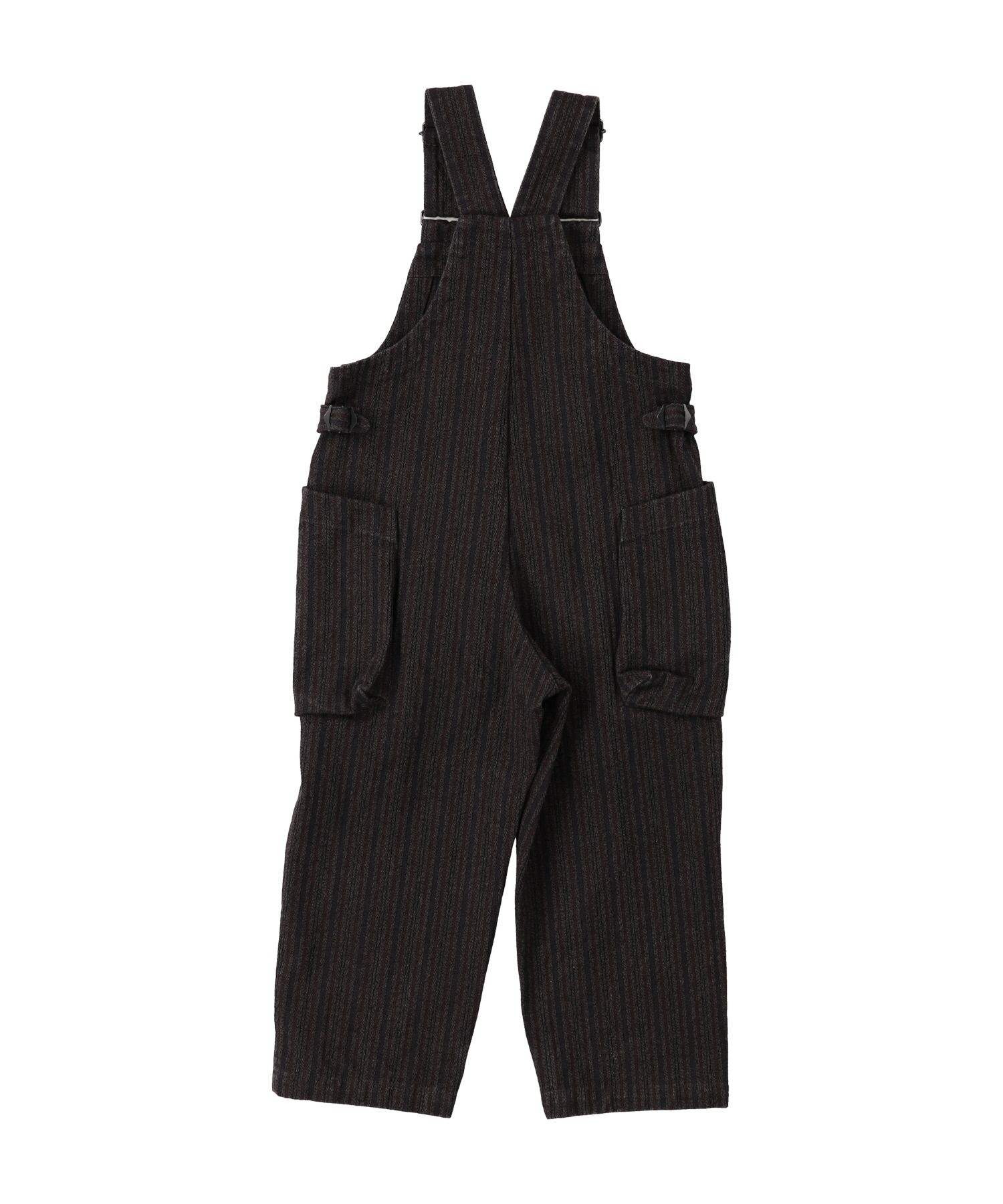 Overalls pants made of fabric woven into a striped pattern using dobby weave using 16/2 warp thread, 16/2 weft thread, and 8/1 thick thread. The base part has an elaborate striped pattern with double threads of 16/1 in different colors and heathered threads. The threads are thick and dense, making it a sturdy and strong fabric similar to denim. It has a roomy wide silhouette and a large nut button that enhances its presence. Adjustable with shoulder straps.