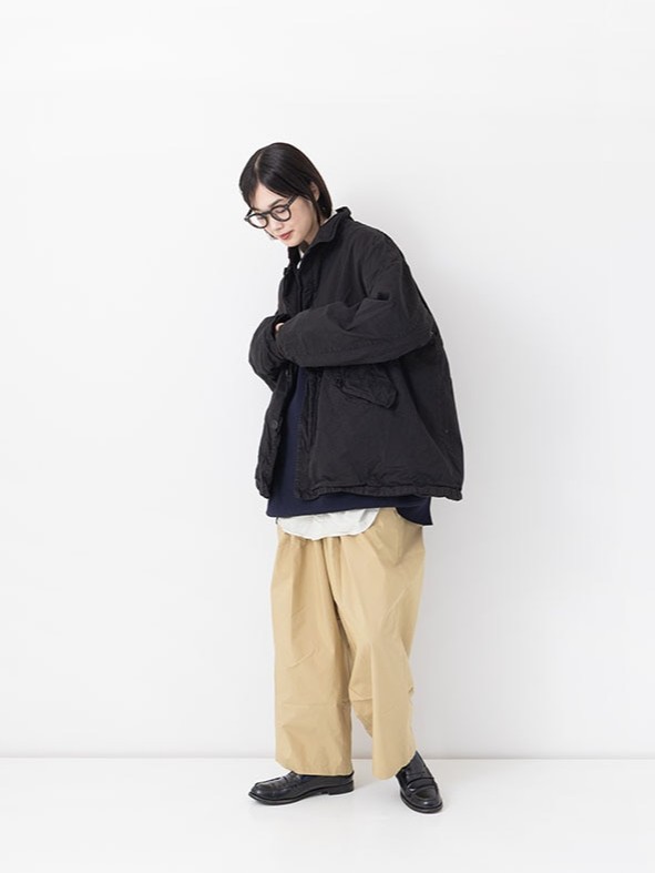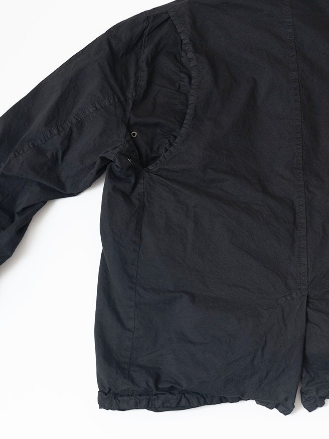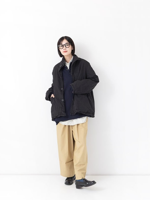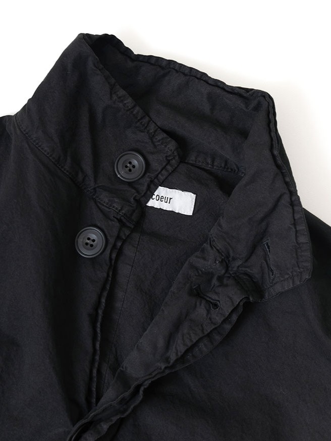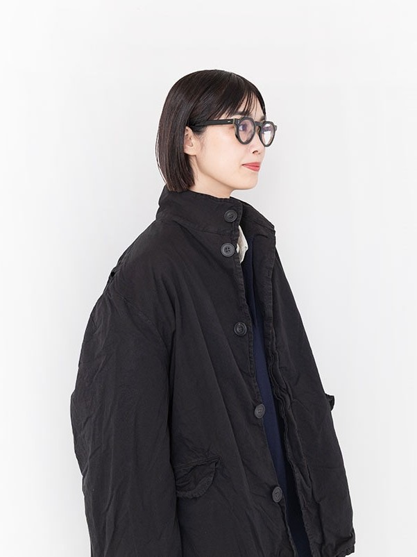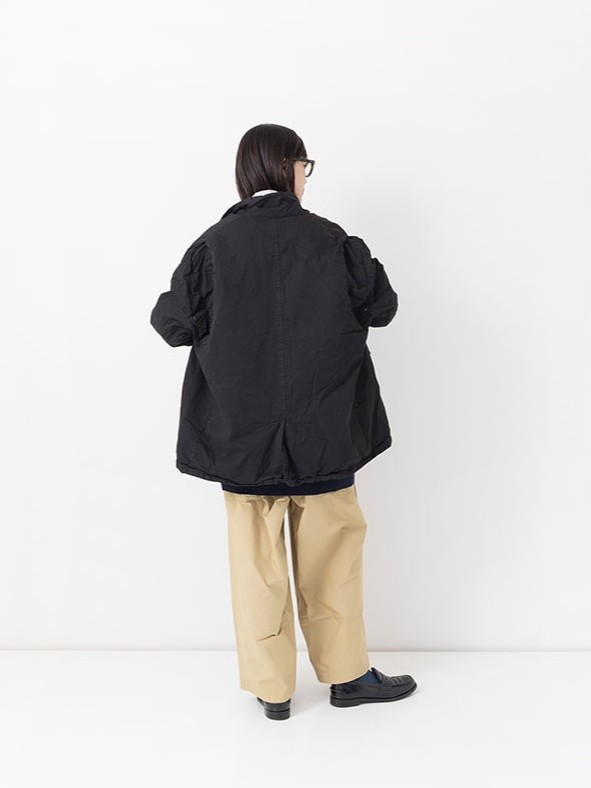 The Garment Dye Short Coat by Veritecoeur is a coat made from a thick, high-count cotton twill fabric.