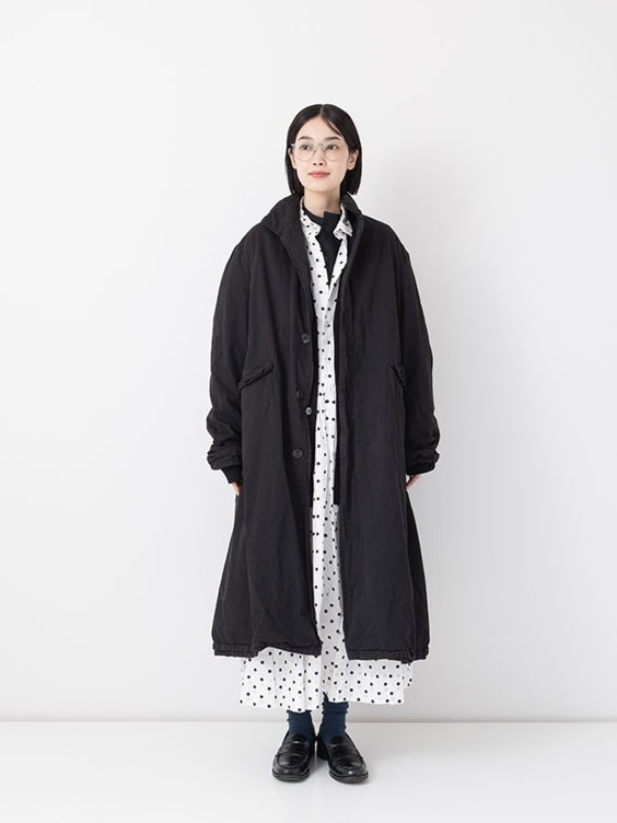 The Garment Dyed Coat by Veritecoeur is made from a thick, high-count cotton twill fabric. The garment dyeing process creates a casual, puckered look and gives the coat a unique depth of color from the natural dyes. The coat is double-layered with a thin cotton lining.