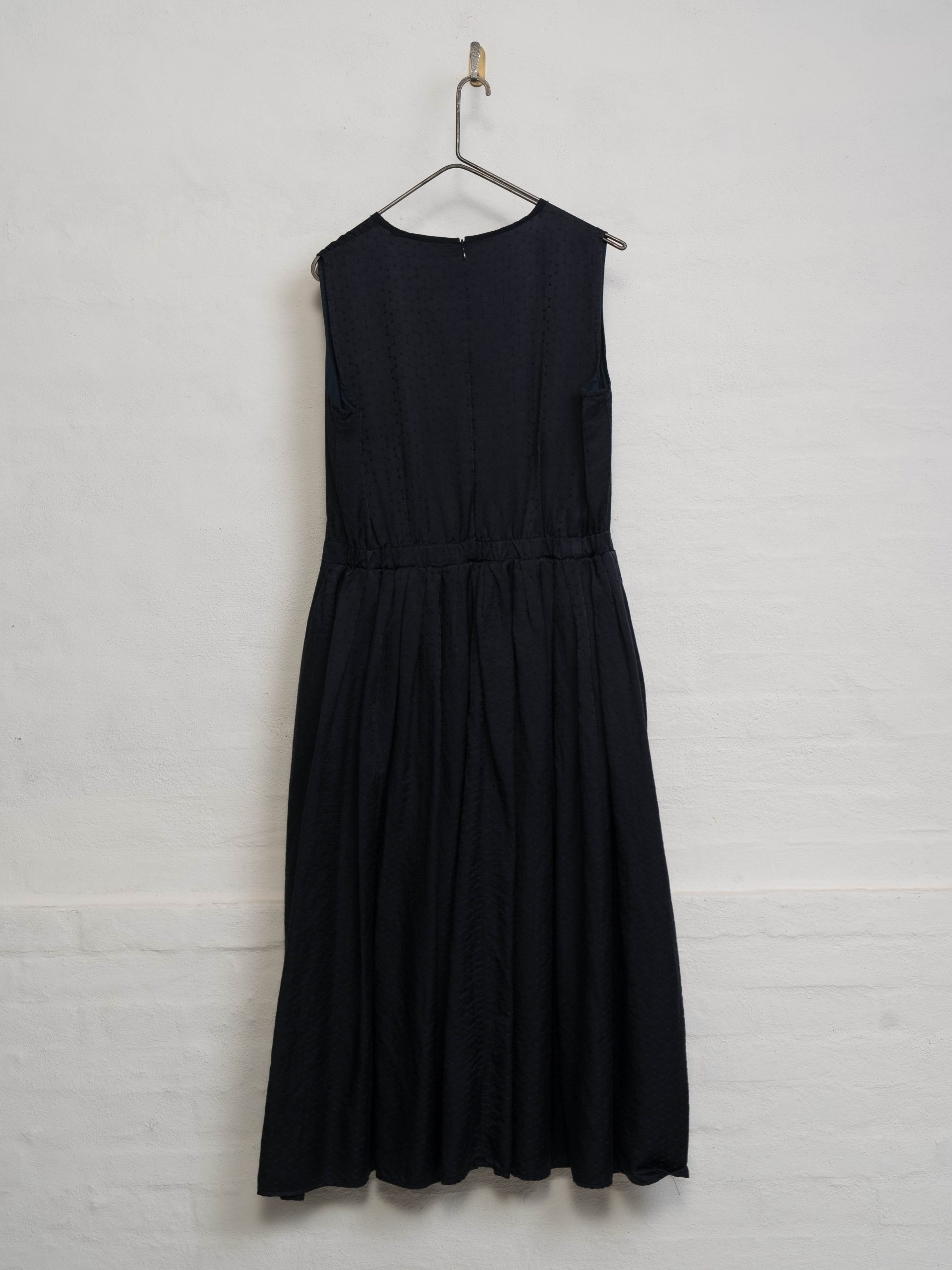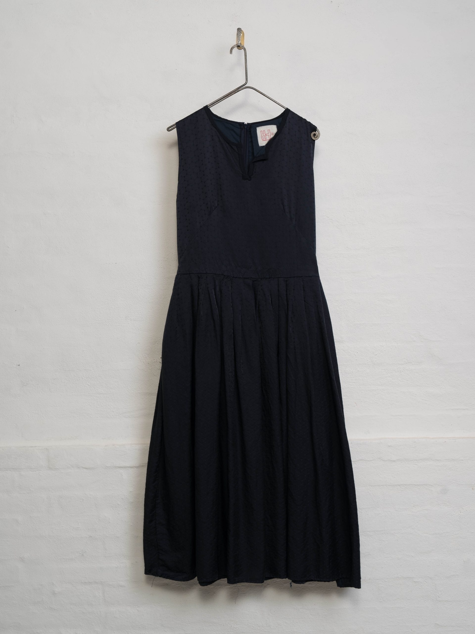 The DENLEY Dress by H+ Hannoh Wessel is a v-neck, midi-length dress featuring a silk-dot patterned motif. It includes an elasticated waistband that defines the silhouette by gathering the fabric at the natural waist, and a concealed invisible zip closure on the backside of the dress to ensure a streamlined fit.