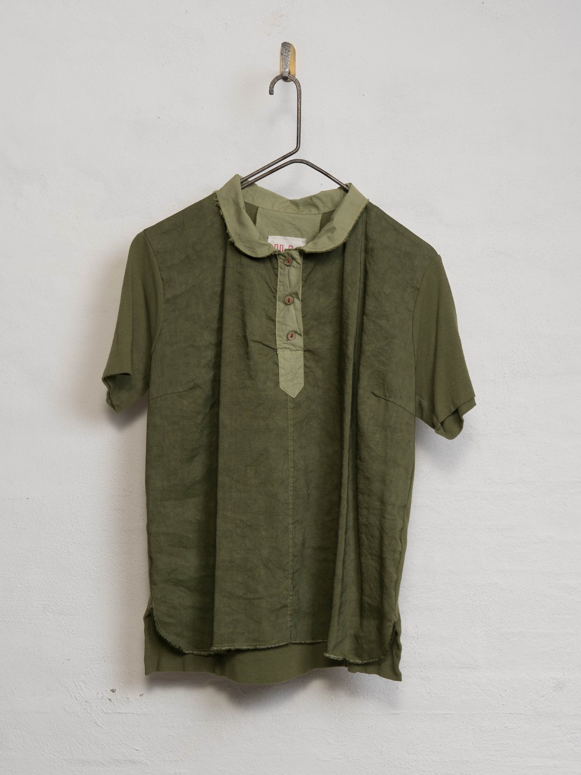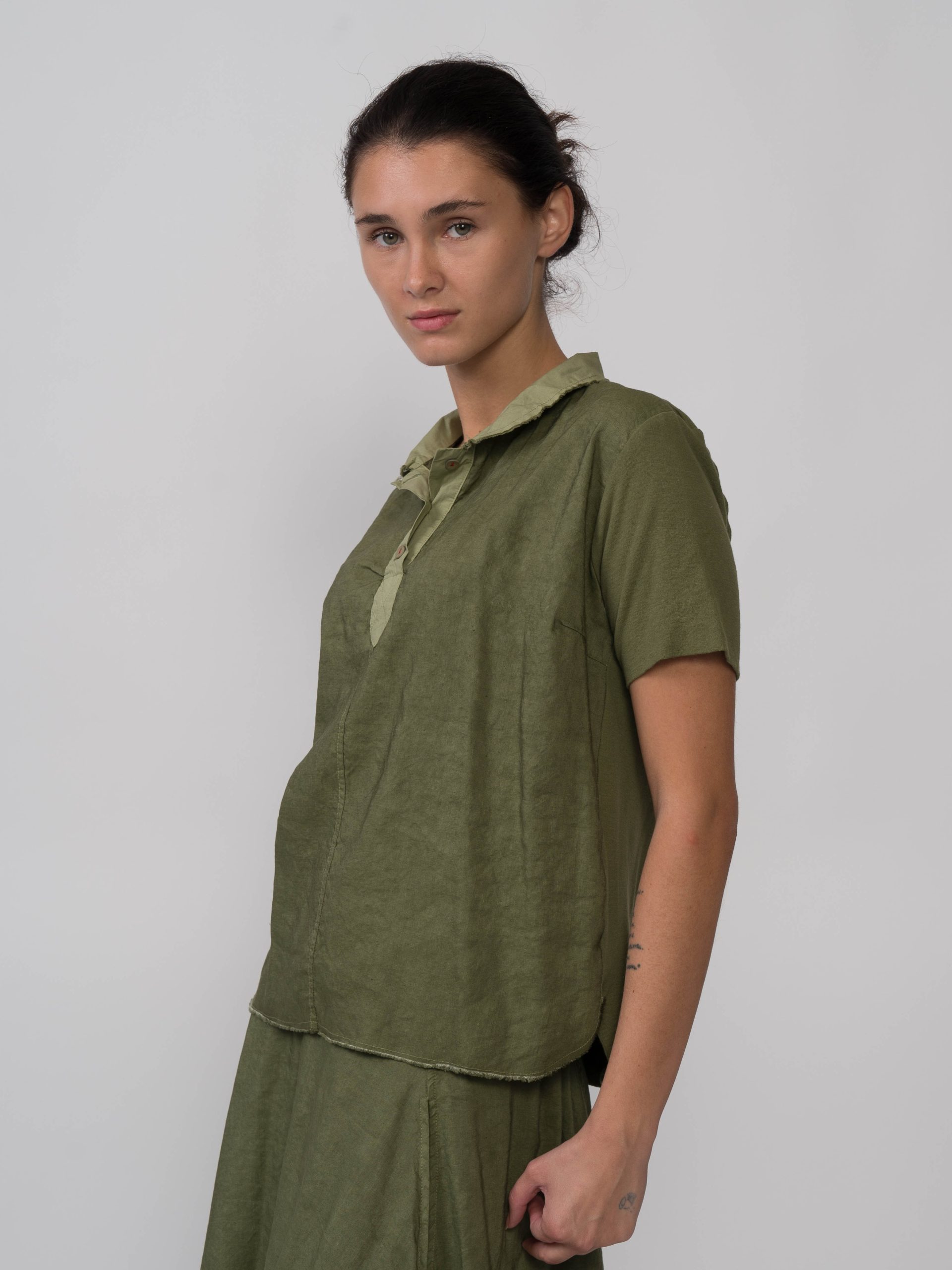 The SARAH Shirt by H+ Hannoh Wessel is a long-sleeved button-up top crafted from a premium silk/linen blend. It is designed with a relaxed, straight-cut silhouette and features a classic pointed collar with dropped shoulders.