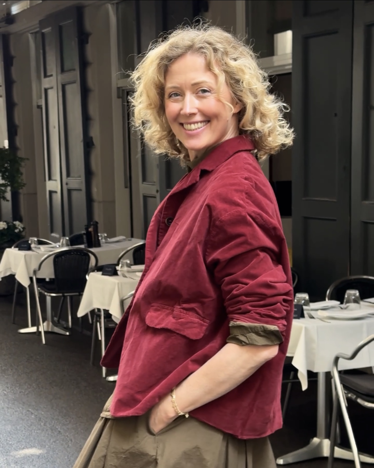 The Viatrix Cotton Jacket by Hannoh Wessel is a red jacket with a notched lapel collar. It has a button-front closure with three buttons, two front flap pockets, and long sleeves. The jacket has a relaxed, boxy fit.
