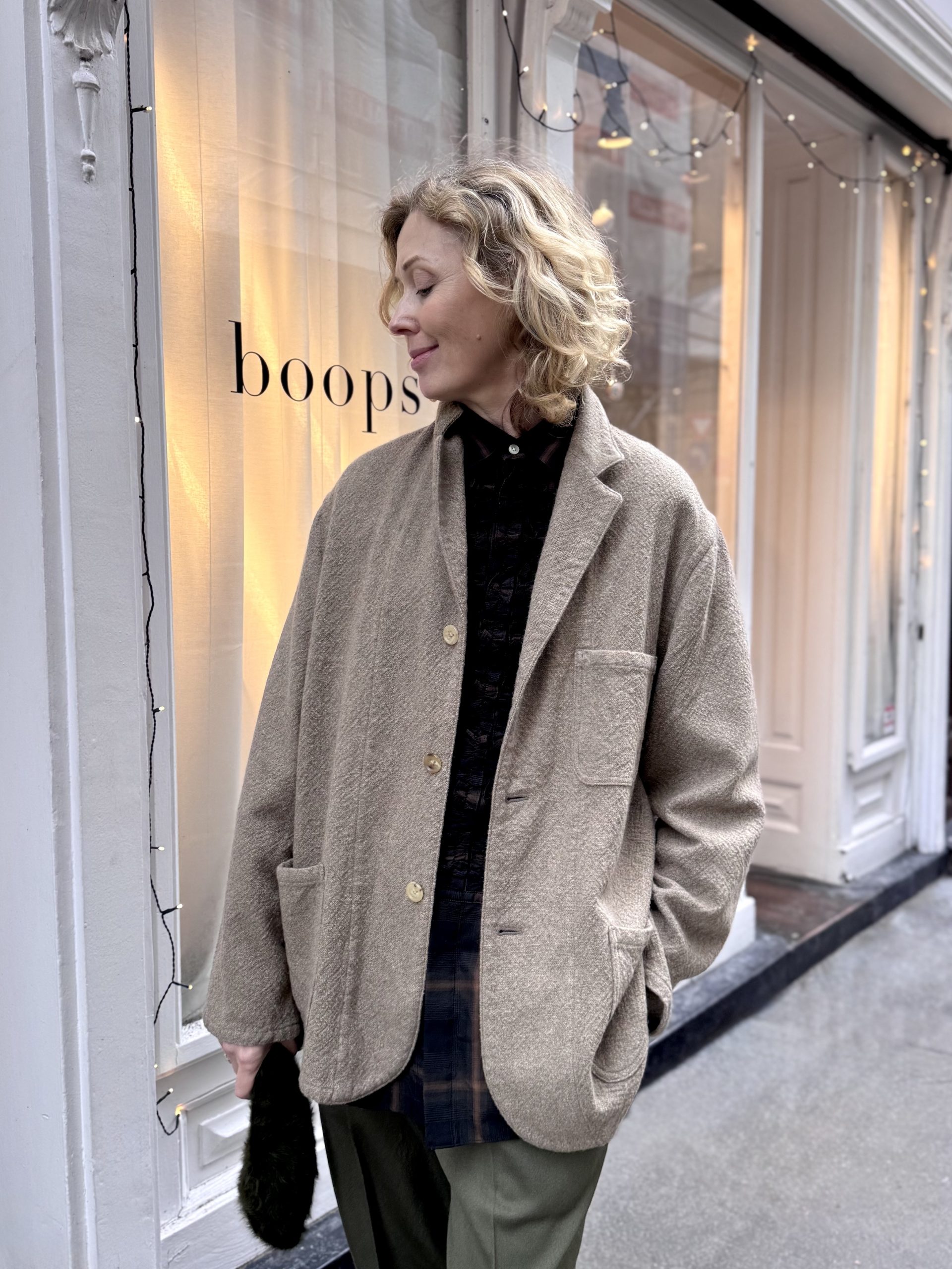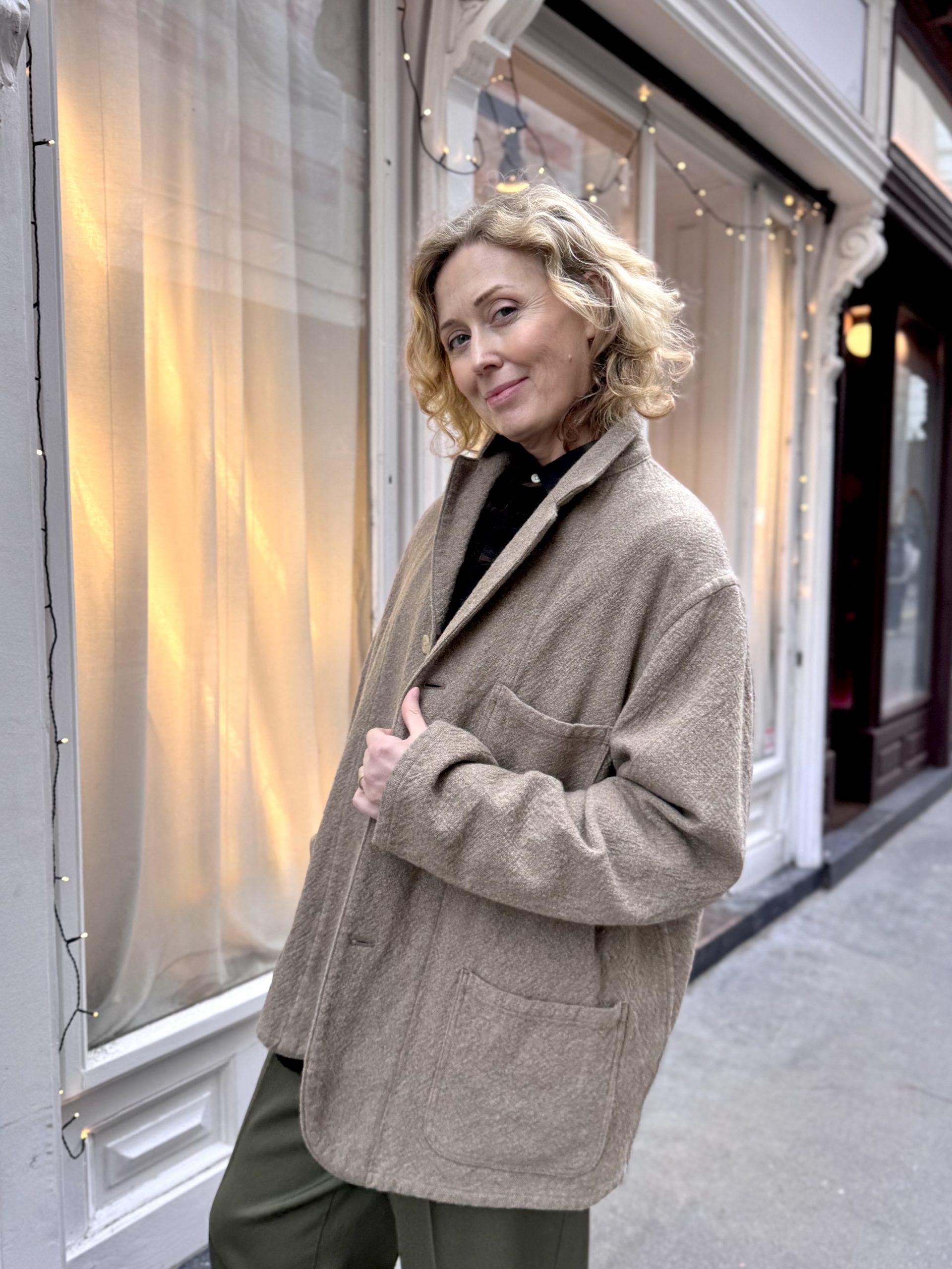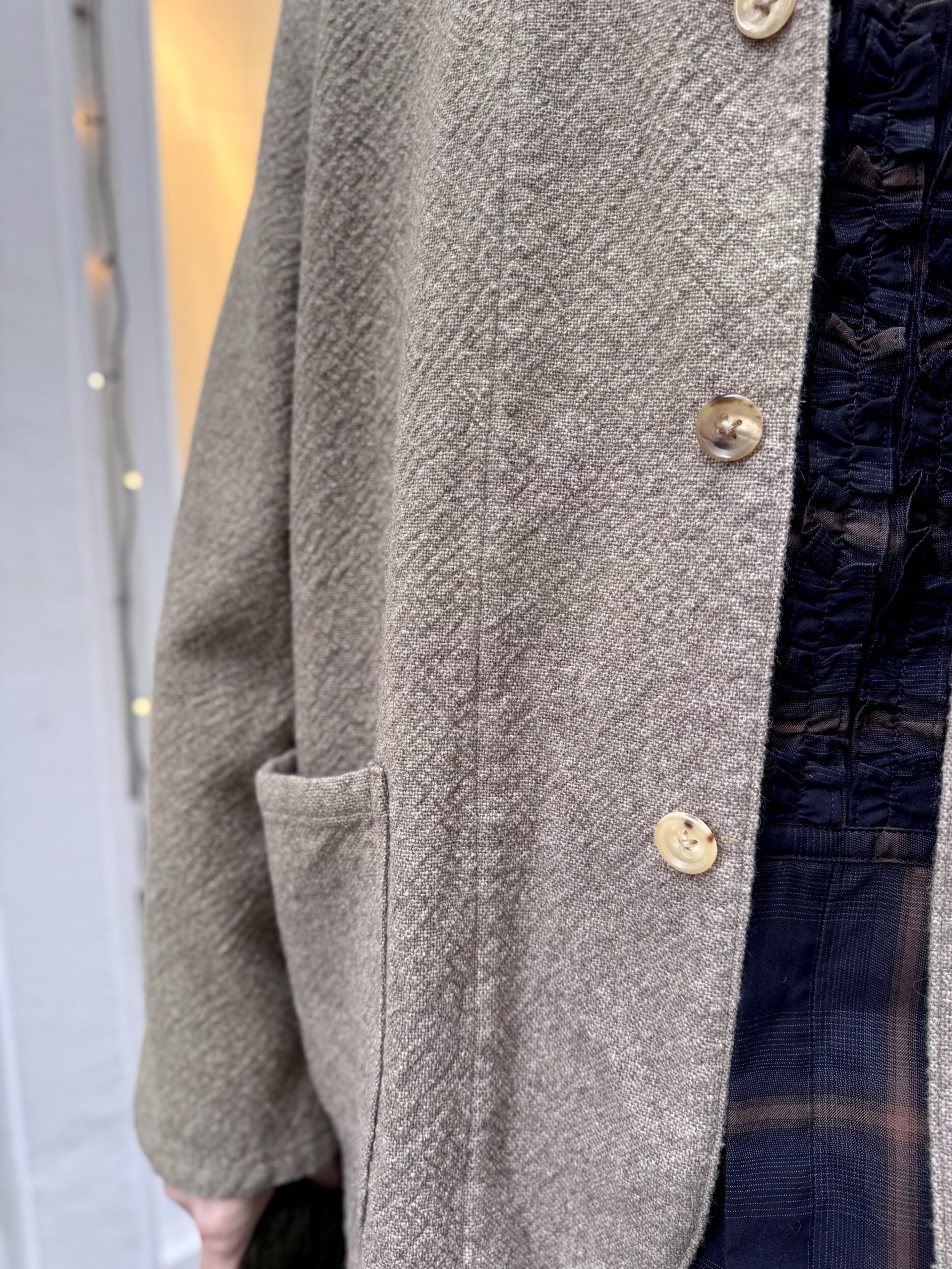 The Rigid Cashmere Work Jacket by HERILL is a modern take on a classic work jacket, crafted from a unique rigid cashmere fabric. Design features include large bellows and hand pockets. The jacket is constructed for a good fit that avoids a boxy or overly vintage silhouette.