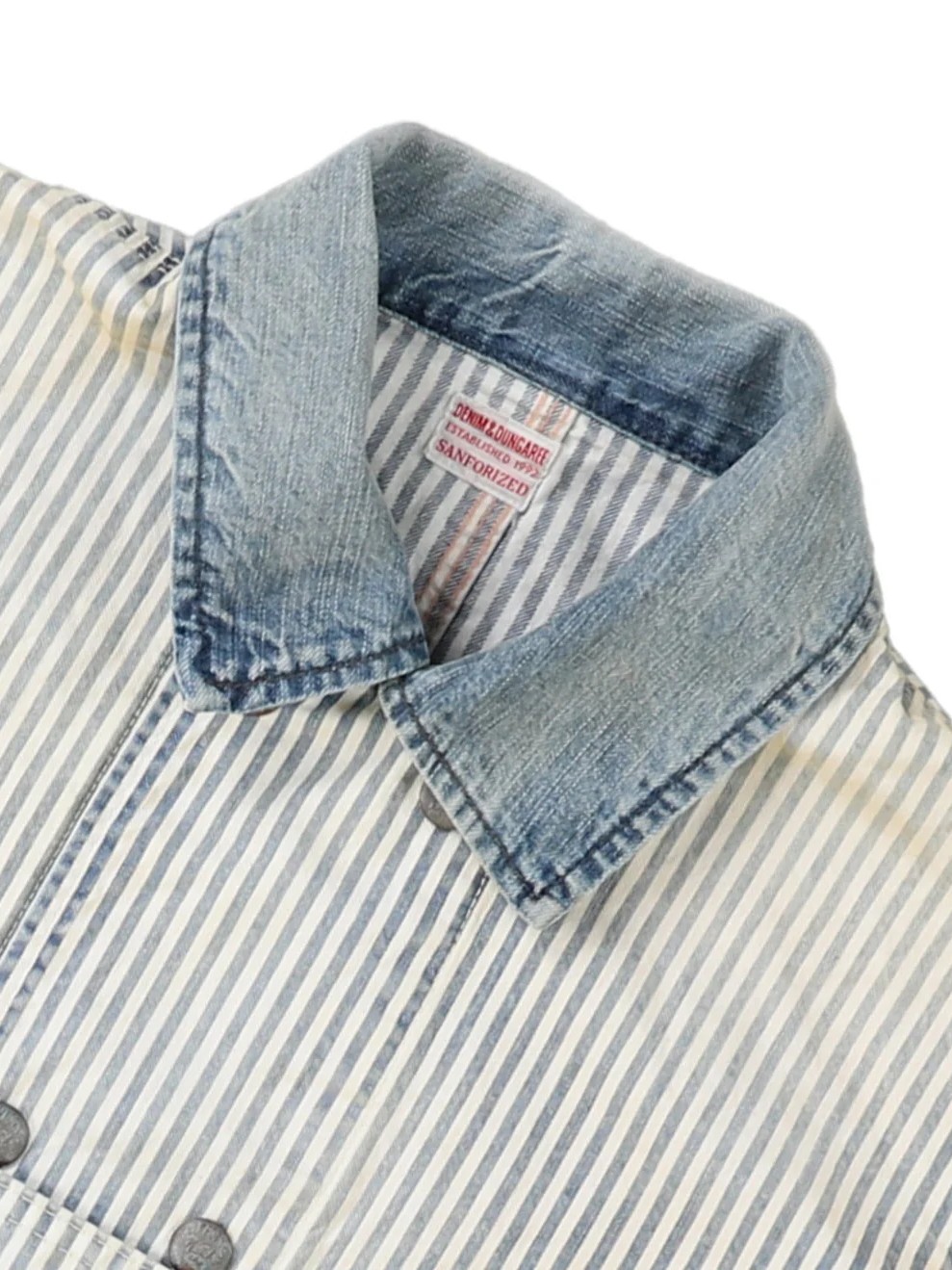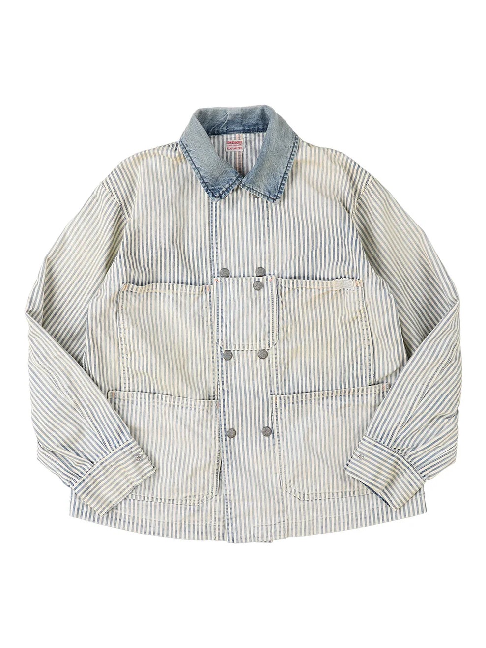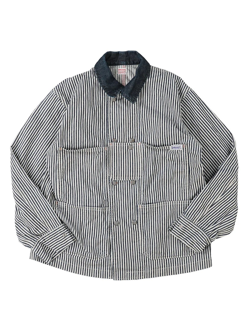 The Hickory Coverall Jacket by Denim Dungaree is a double-breasted jacket inspired by the functional outerwear worn by railroad workers in the 1950s. This jacket features a traditional hickory stripe pattern accented by striking red embroidery that is designed to look as if it were hand-stitched. Combining a historic industrial silhouette with artisanal decorative details, this jacket offers a unique and authentic look. For essential daily utility, the design includes functional pockets on both sides.