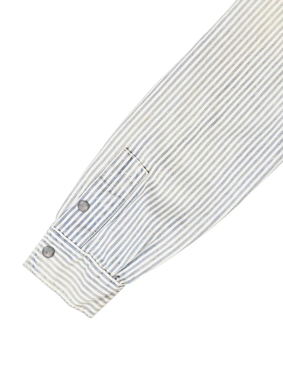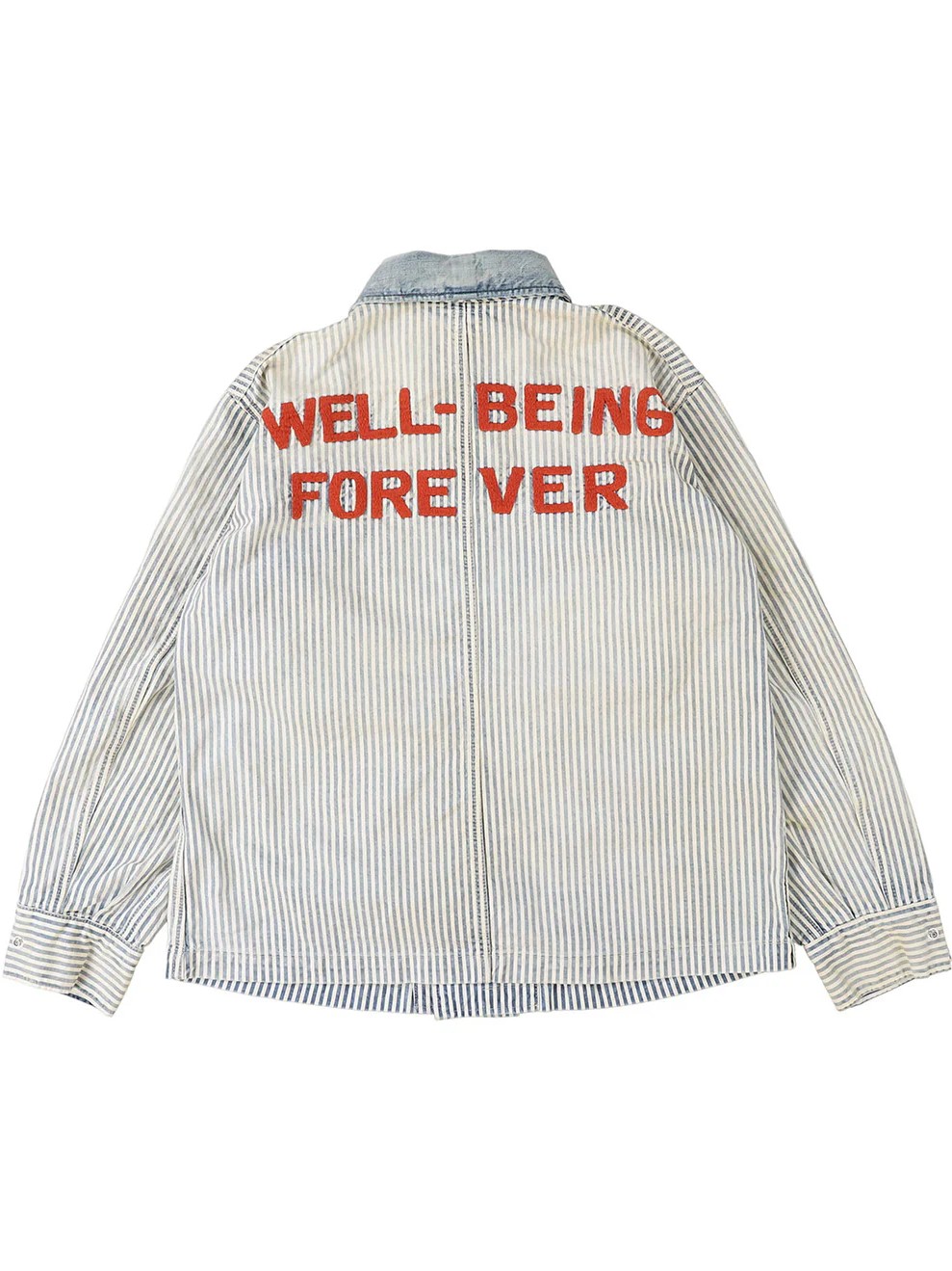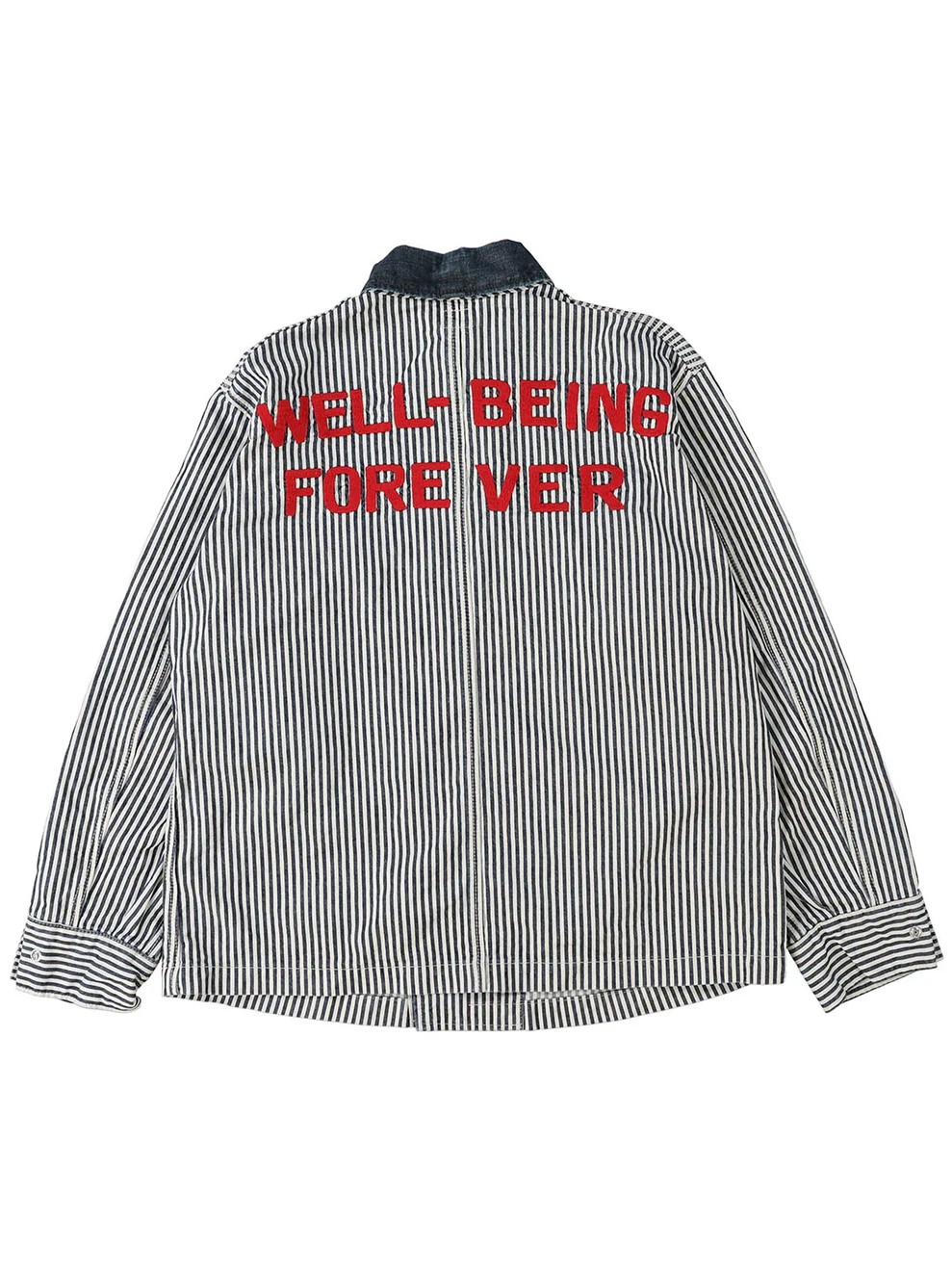 The Hickory Coverall Jacket by Denim Dungaree is a double-breasted jacket inspired by the functional outerwear worn by railroad workers in the 1950s. This jacket features a traditional hickory stripe pattern accented by striking red embroidery that is designed to look as if it were hand-stitched. Combining a historic industrial silhouette with artisanal decorative details, this jacket offers a unique and authentic look. For essential daily utility, the design includes functional pockets on both sides.