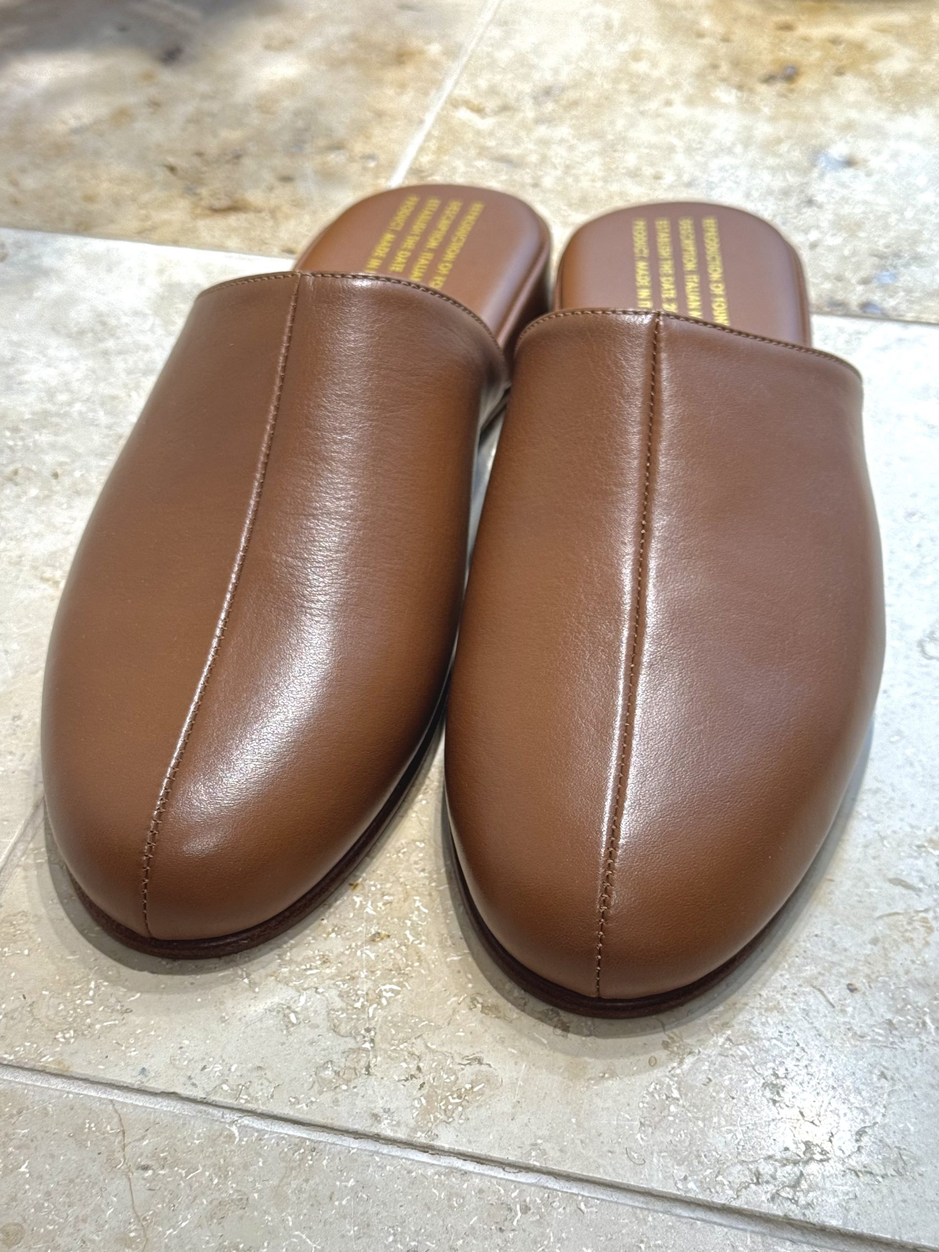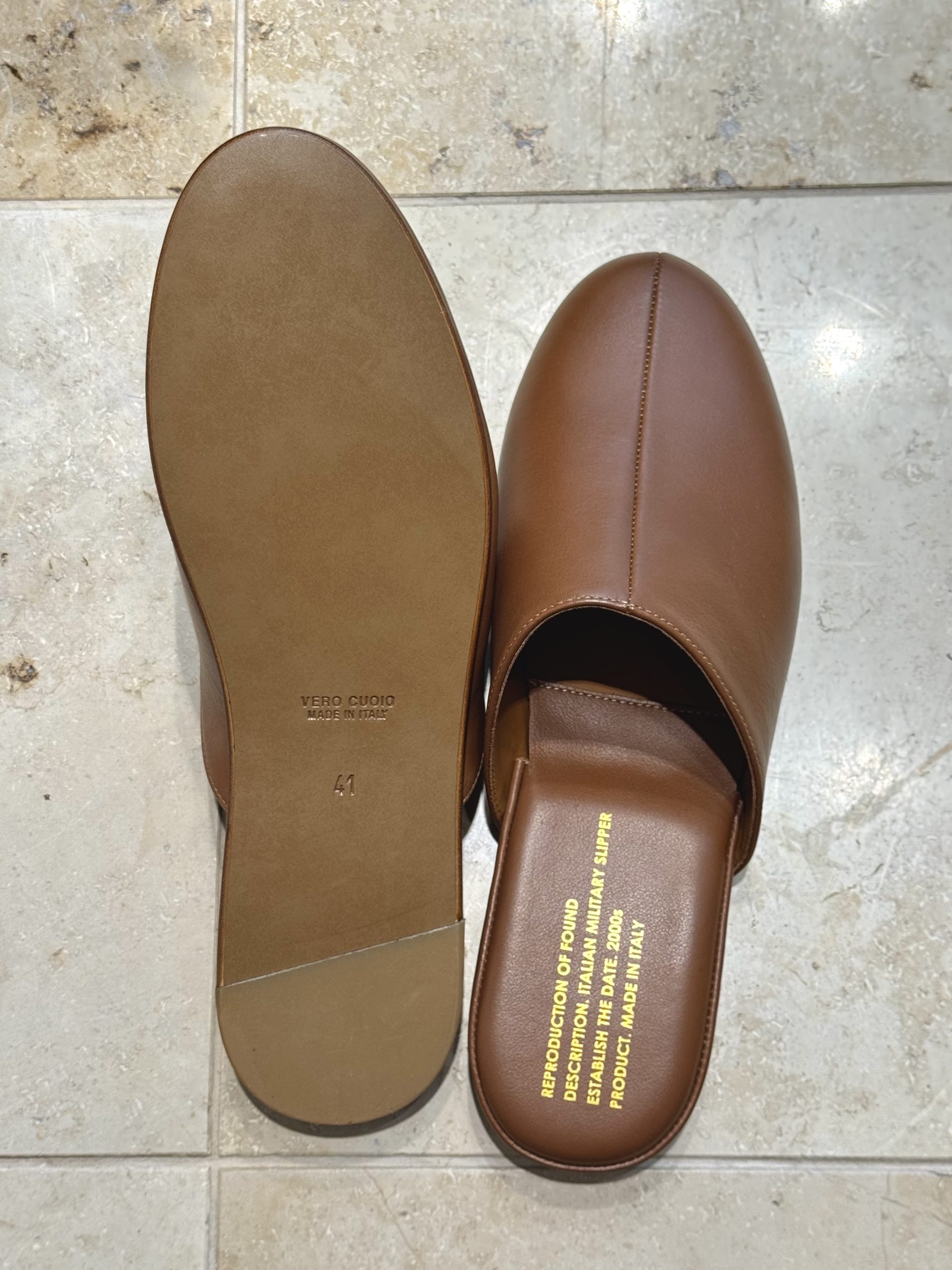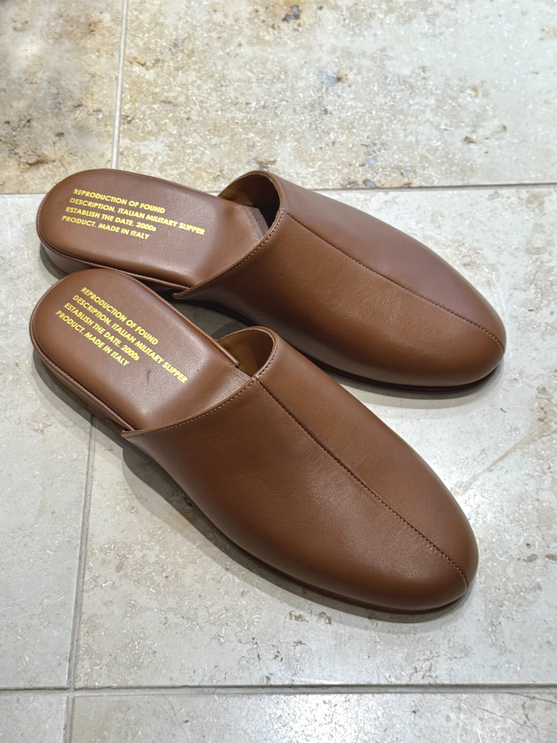 The ITALIAN MILITARY SLIPPER 775FDL by Reproduction of Found is crafted from smooth light brown leather and features a soft pigskin lining for enhanced comfort. Made in Italy by manufacturers with a history in military footwear, this slipper offers a balance of utility and refined aesthetics for everyday use. This construction ensures a durable yet comfortable footwear option that utilizes historical production expertise for a functional daily application.