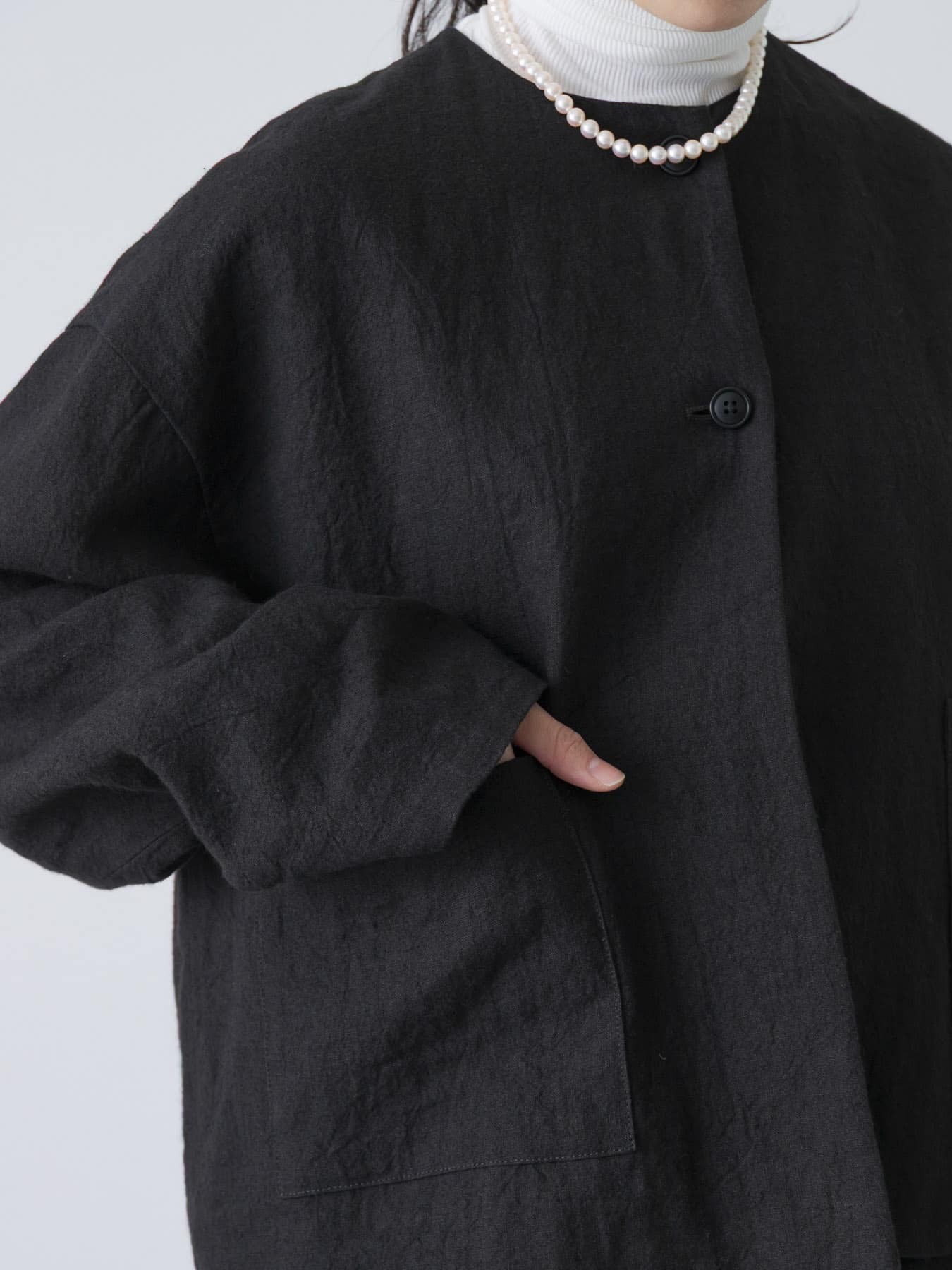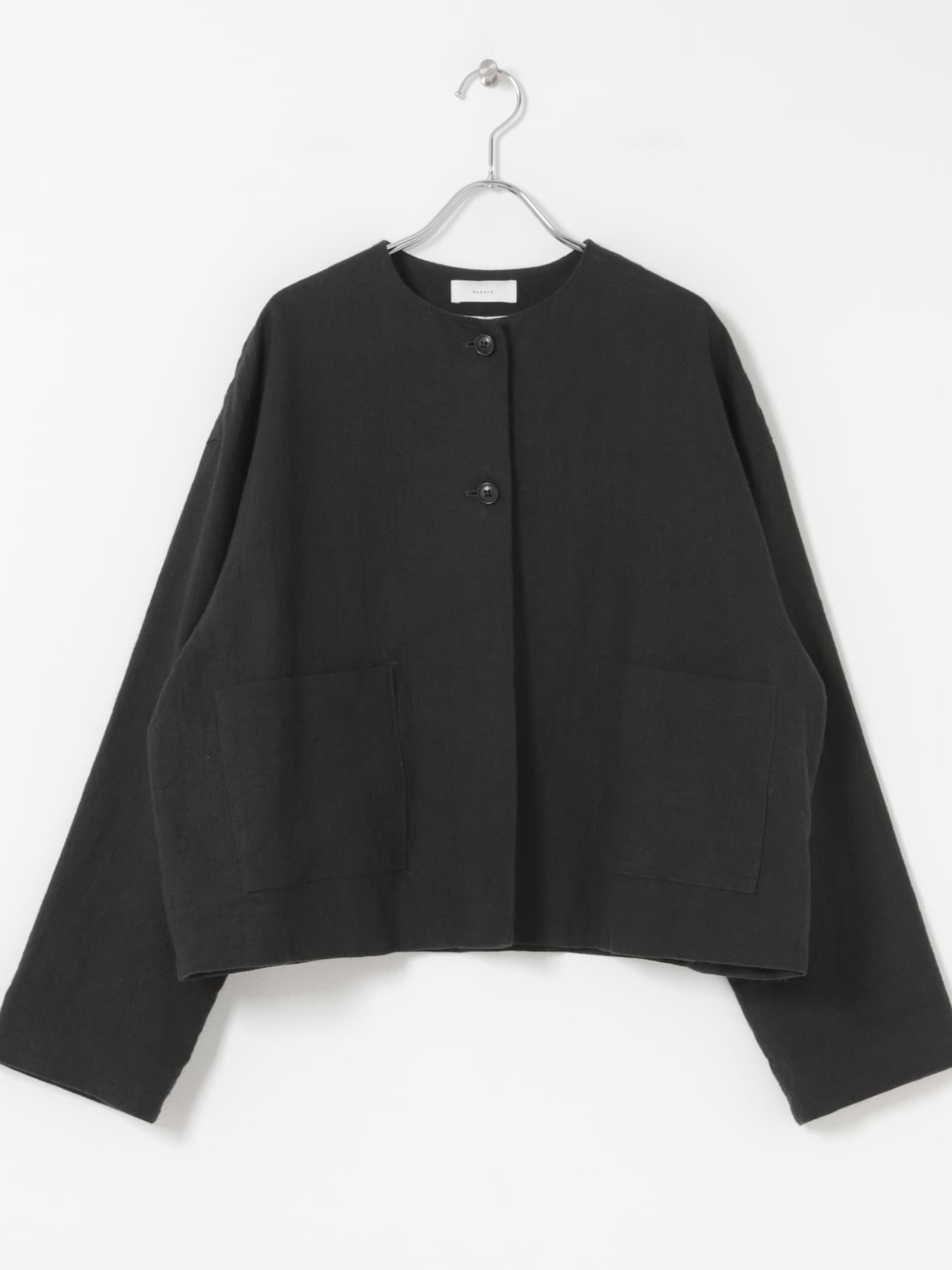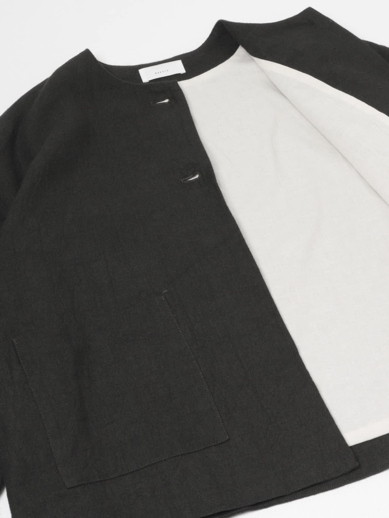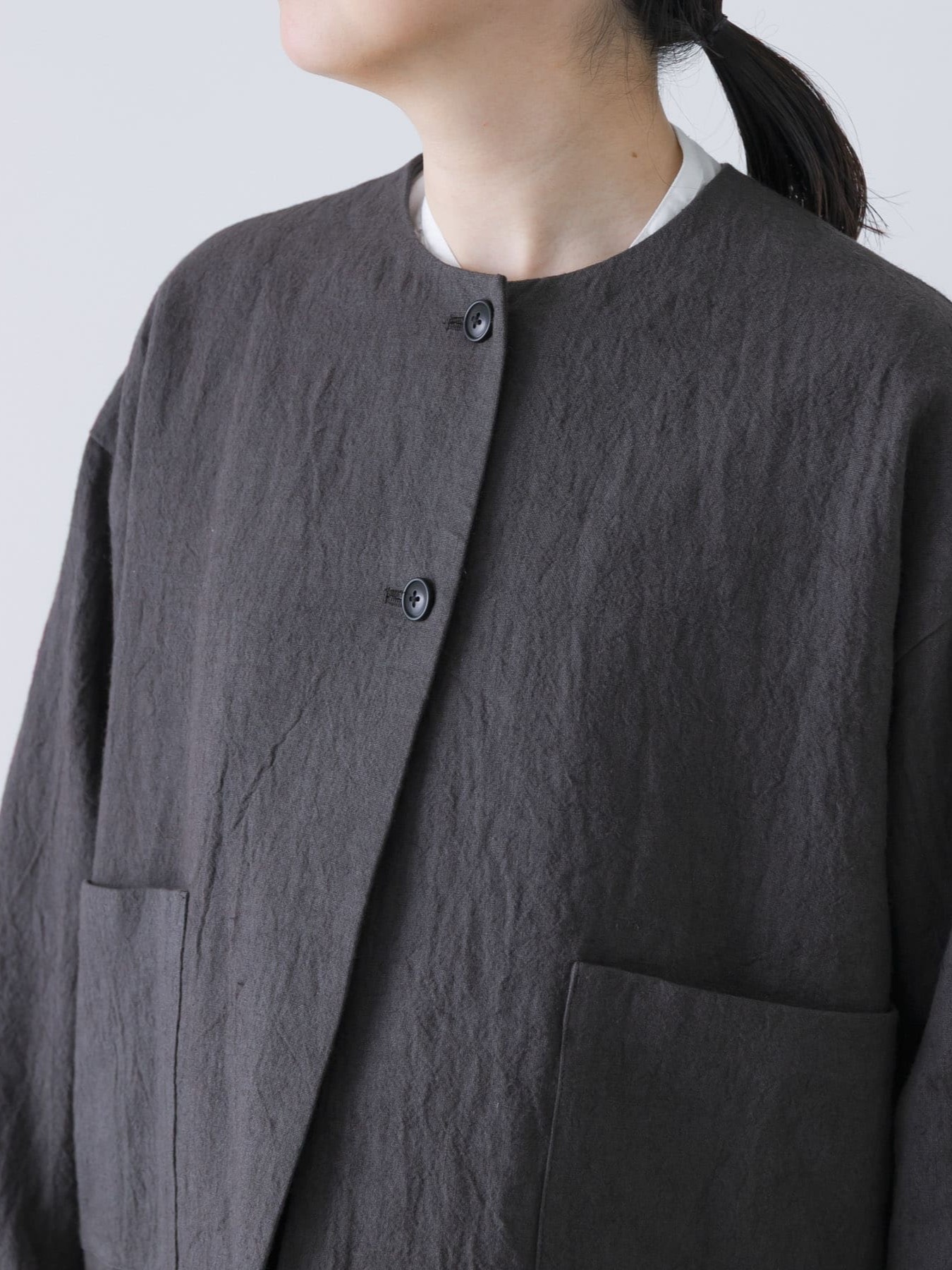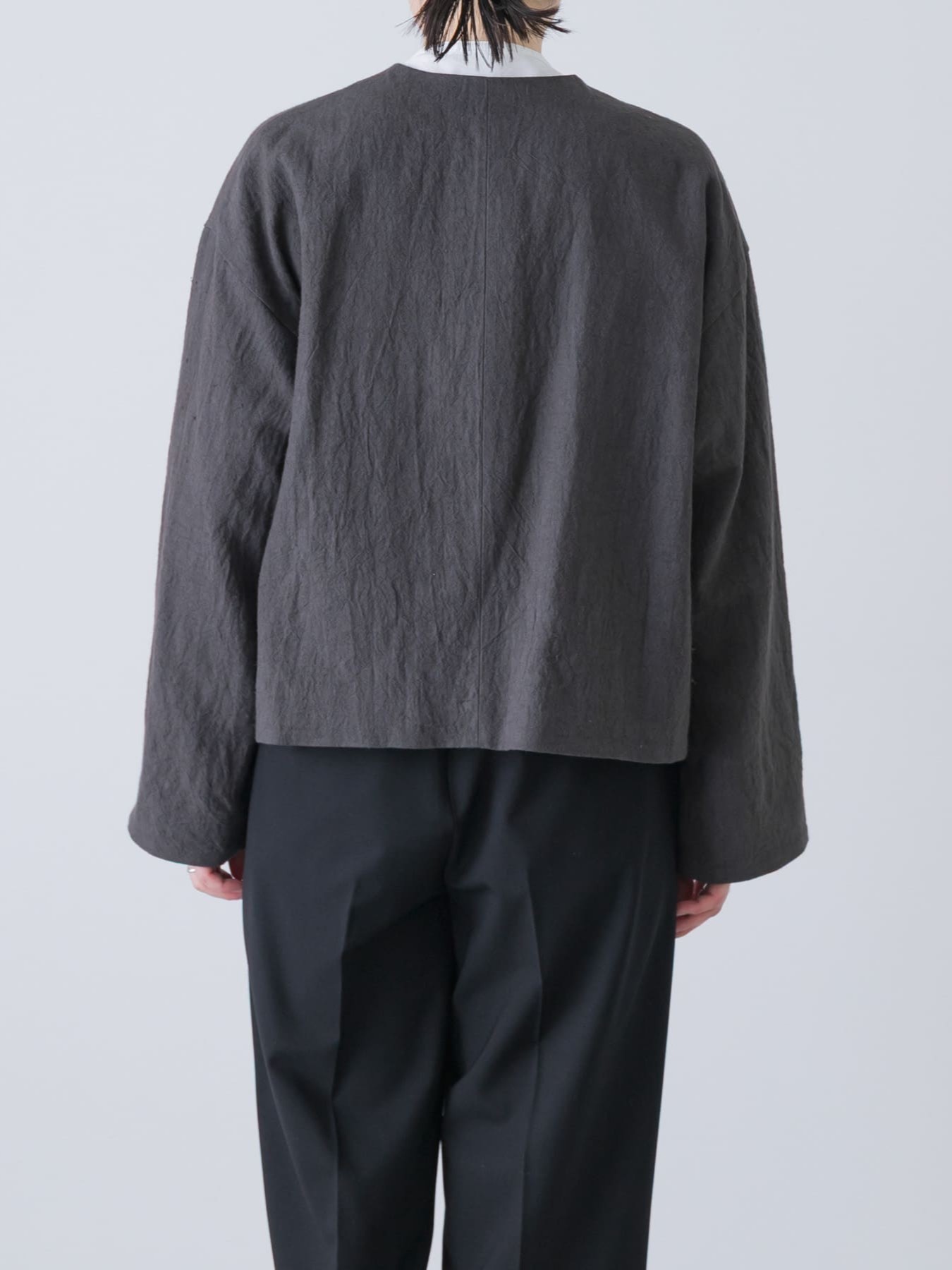 The Collarless Jacket by KAGURE is a versatile jacket crafted from a blend of ramie and linen, balancing firmness with suppleness. The fabric is dyed slowly and carefully to minimize strain, resulting in a rich texture with a natural washer effect that adds depth.