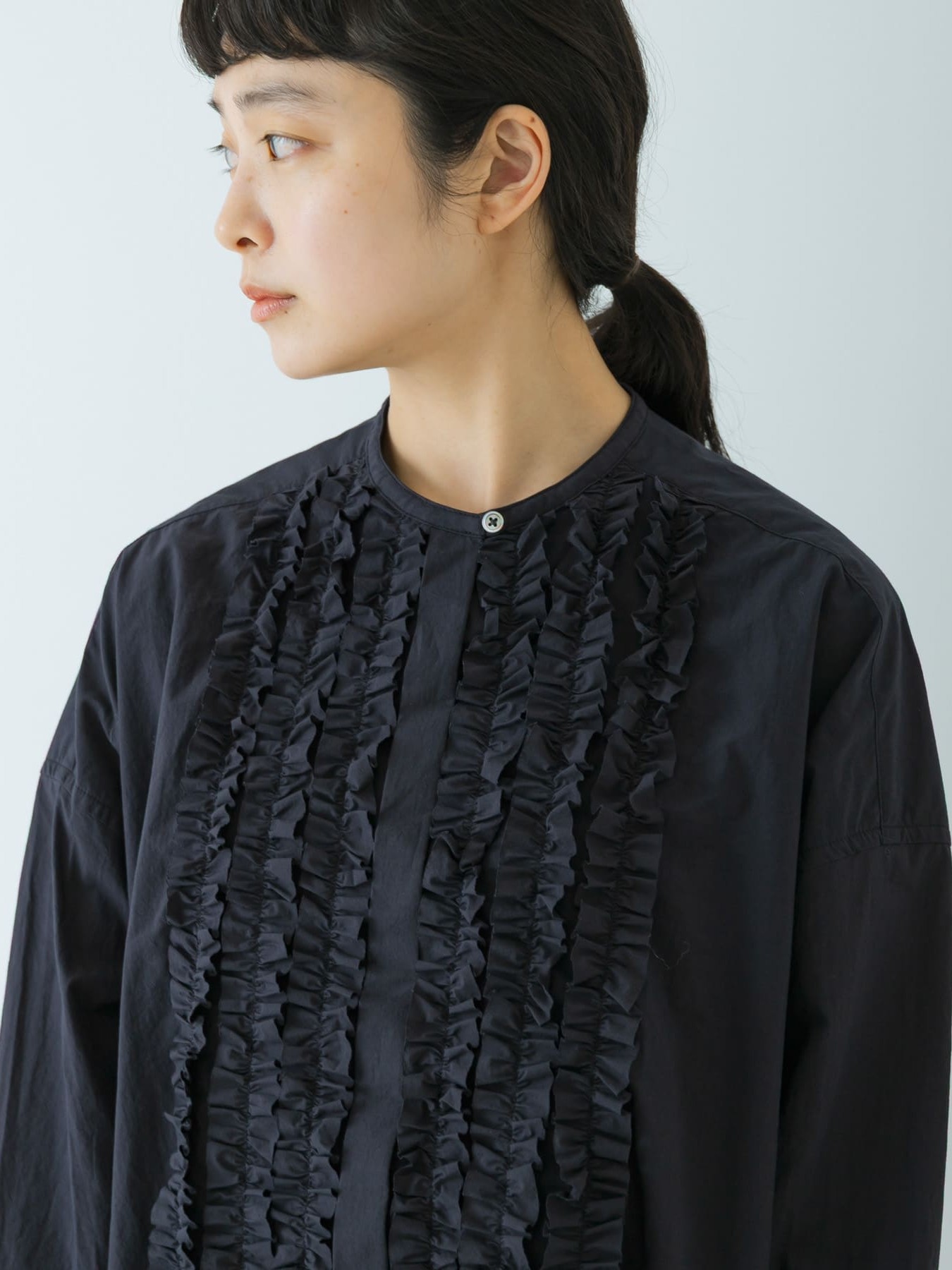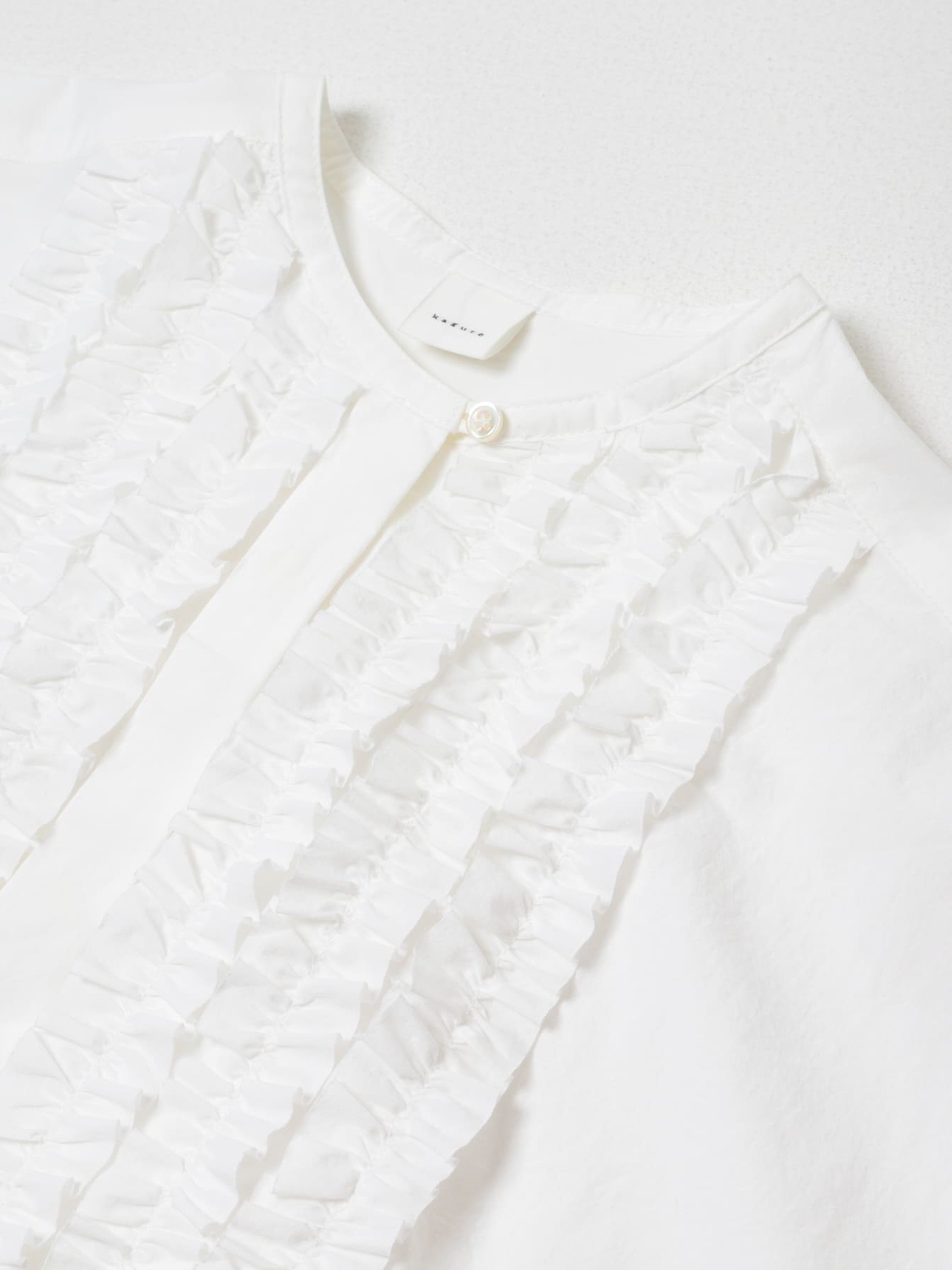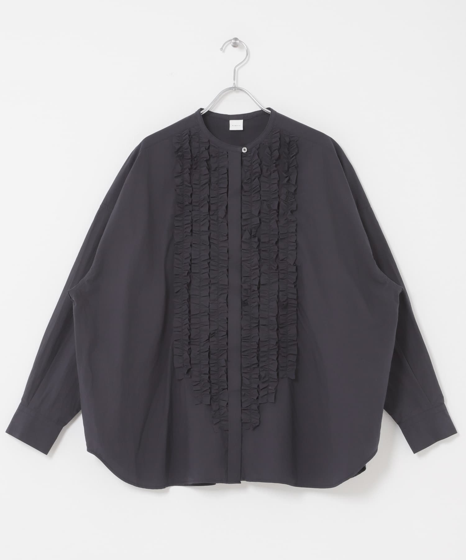 The Cotton Frill Wide Shirt by KAGURE is a collarless, wide-cut garment constructed from high-density woven Omi Sarashi fabric, which features a natural grain for a textured feel.