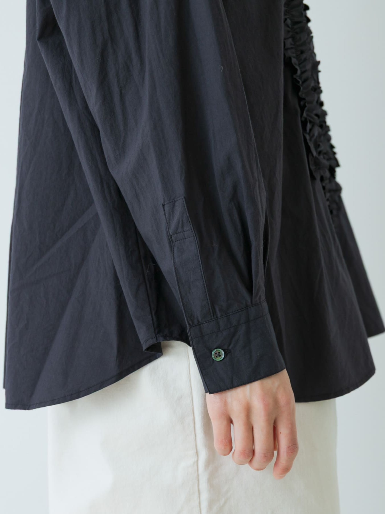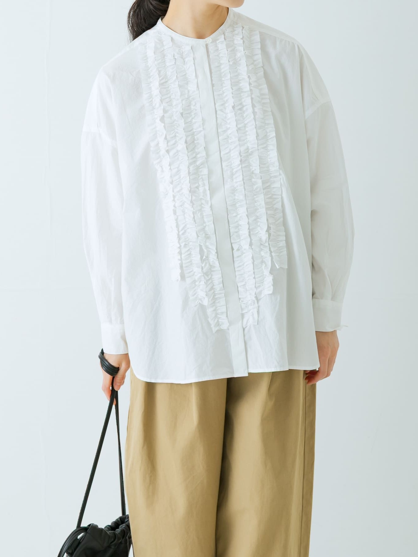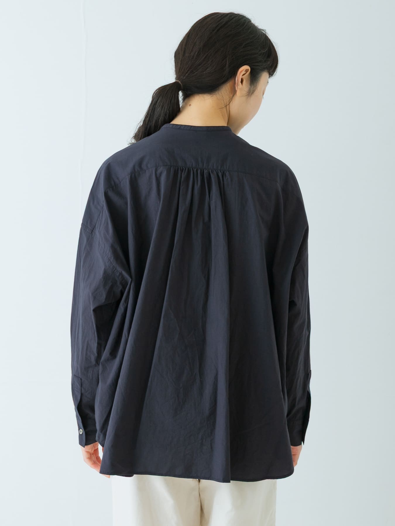 The Cotton Frill Wide Shirt by KAGURE is a collarless, wide-cut garment constructed from high-density woven Omi Sarashi fabric, which features a natural grain for a textured feel.