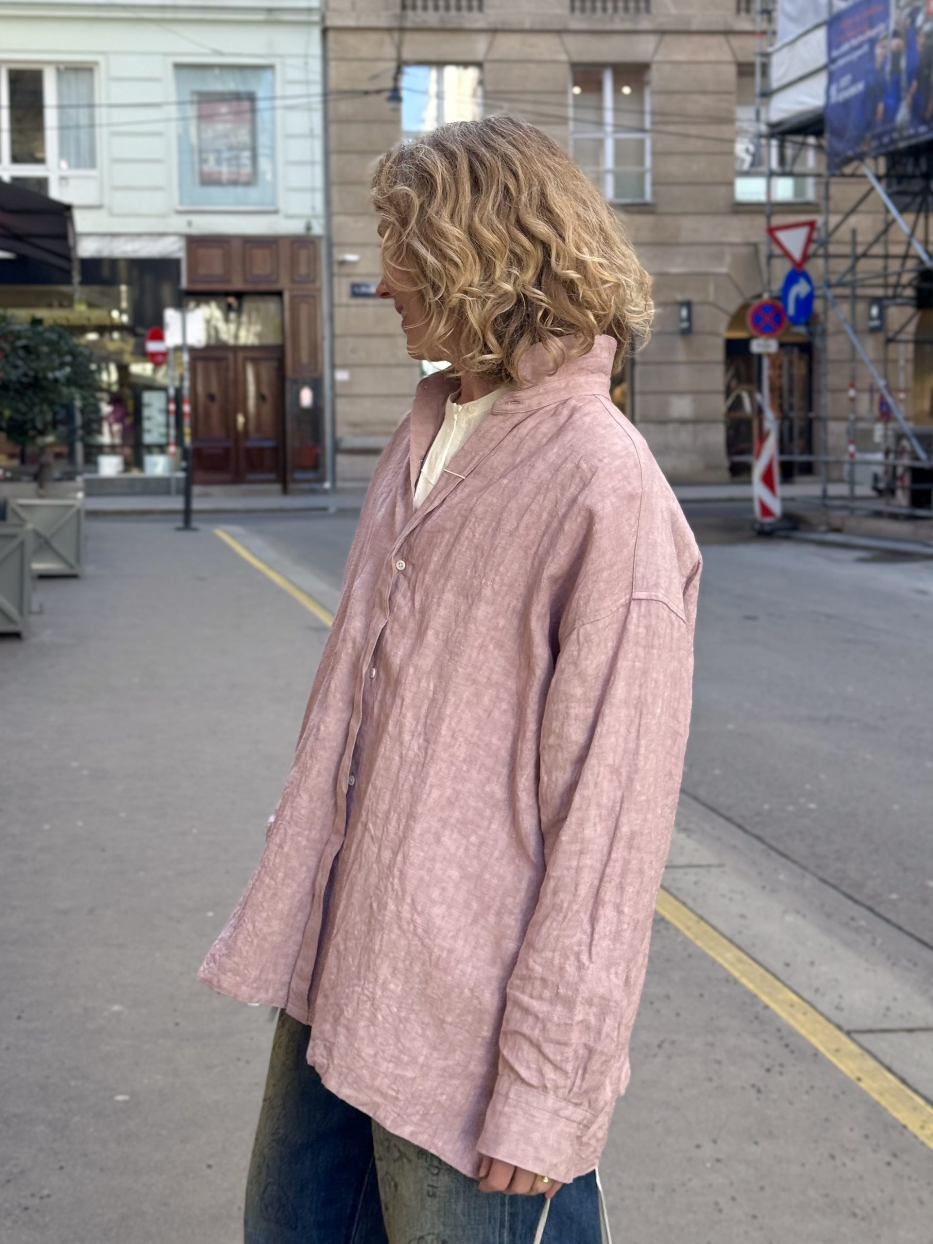 Shown here with the Kagure Collarless Oversized Shirt and Airy Denim Scribble Easy Pants
