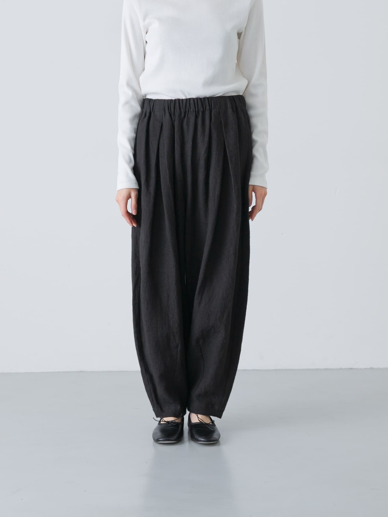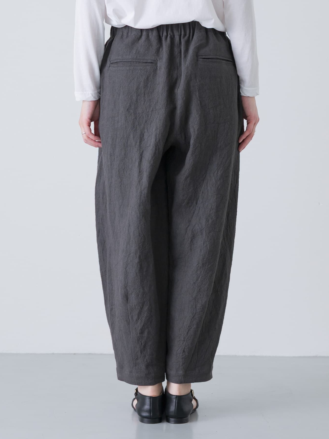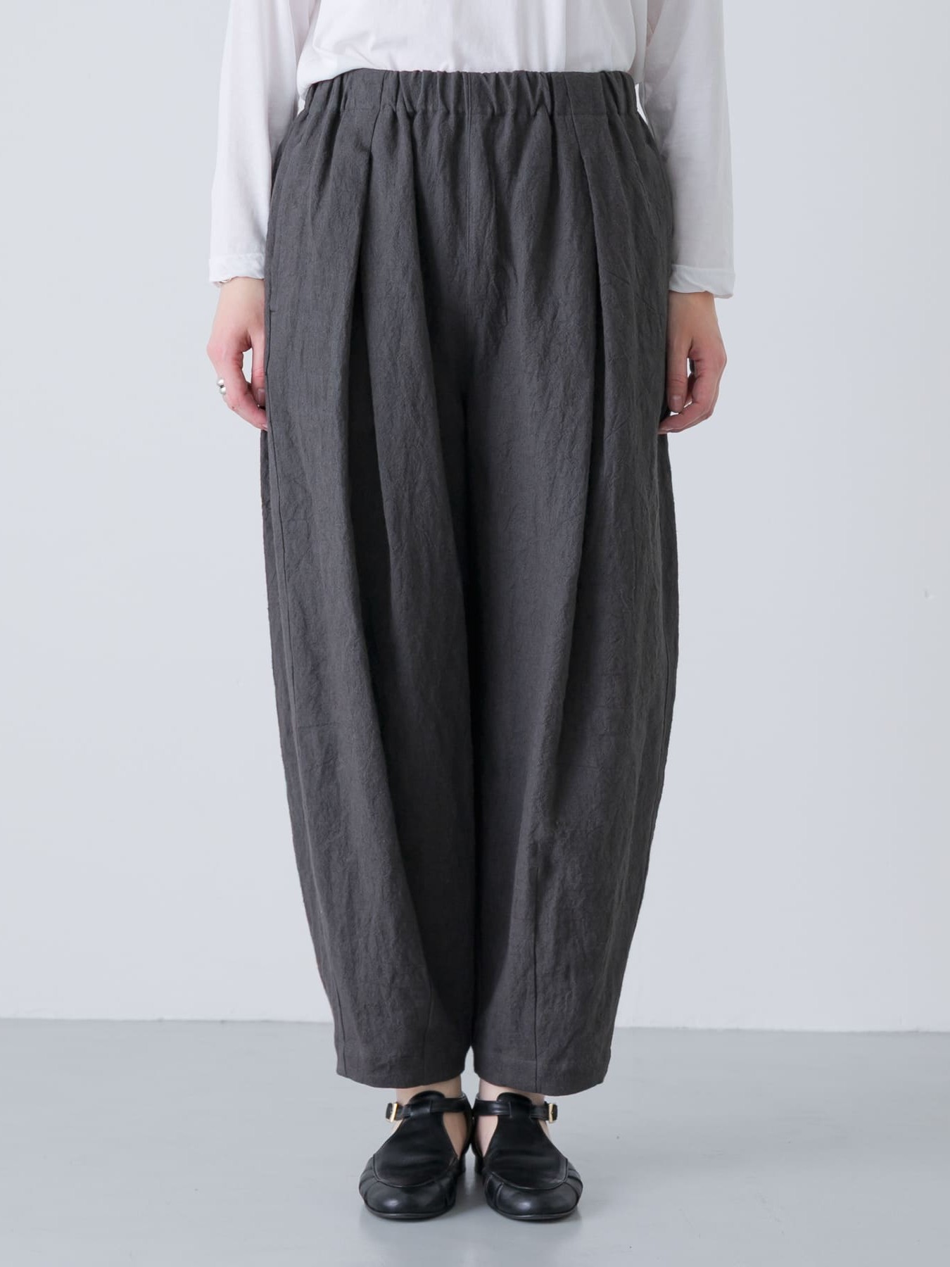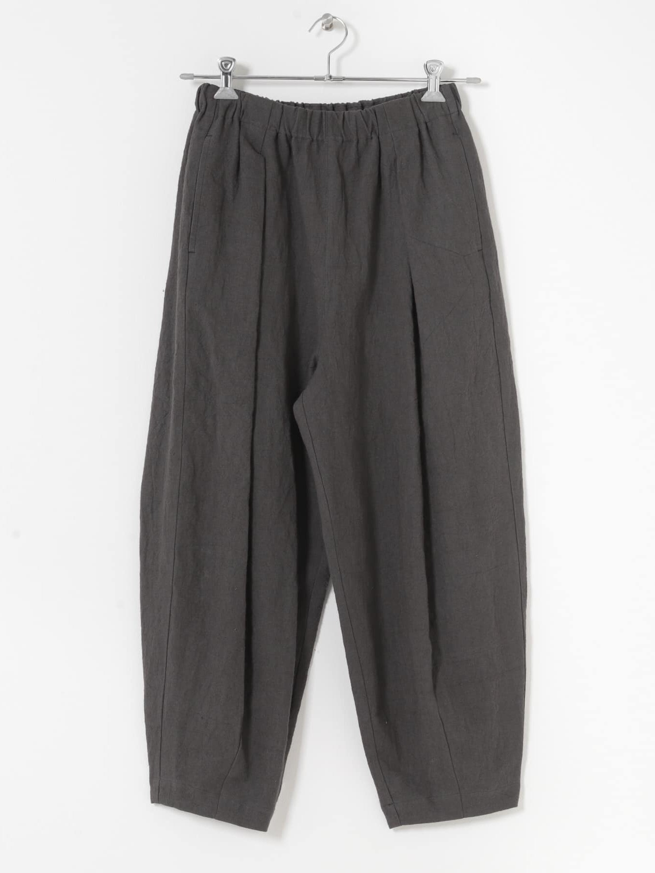 The Tucked Tapered Pants by KAGURE feature a loose cocoon silhouette with crossed tucks on the front. The fabric is a blend of ramie and linen, combining the firmness of ramie with the suppleness of linen to create a soft, expressive natural texture with a natural washer effect.
