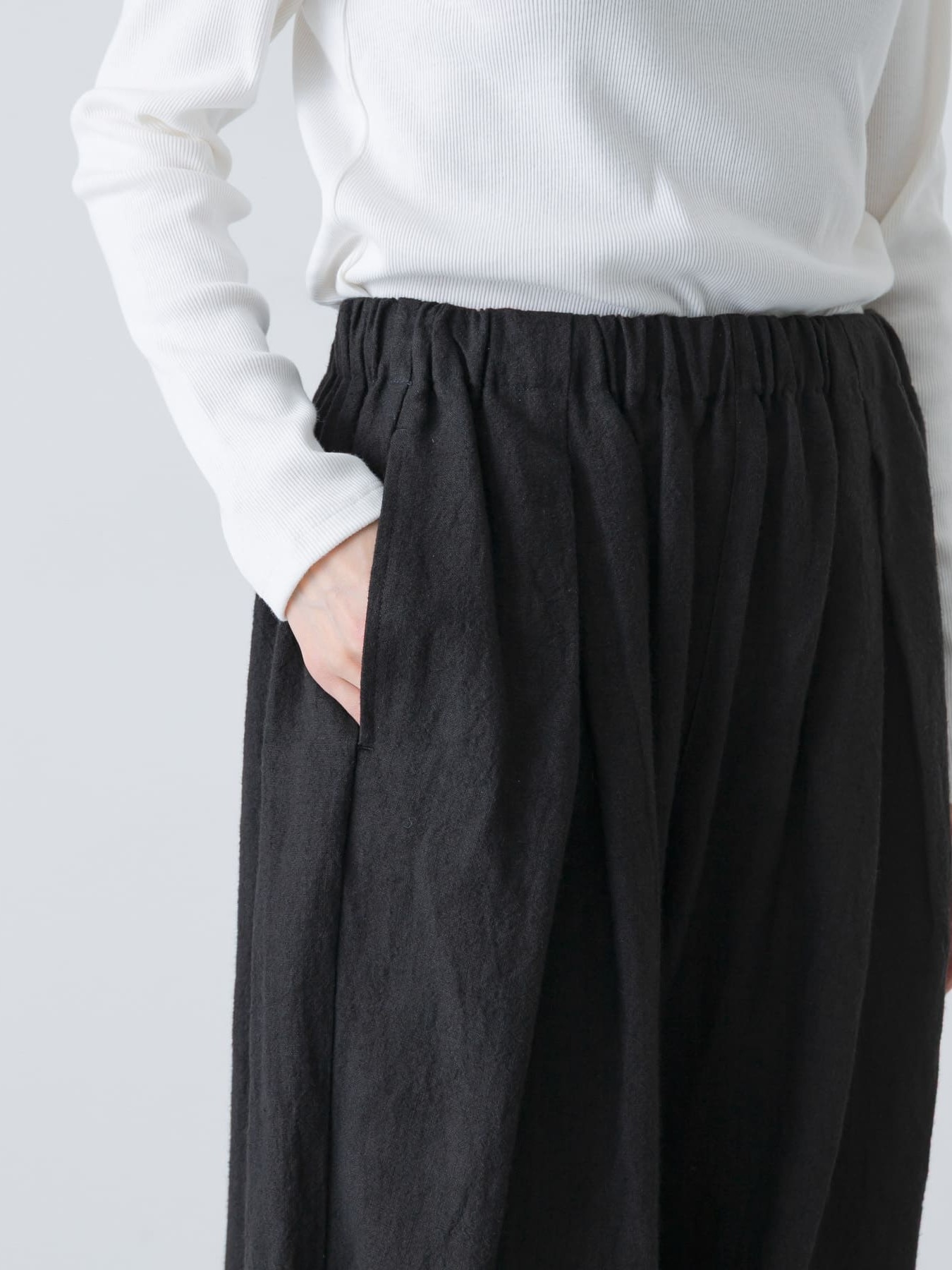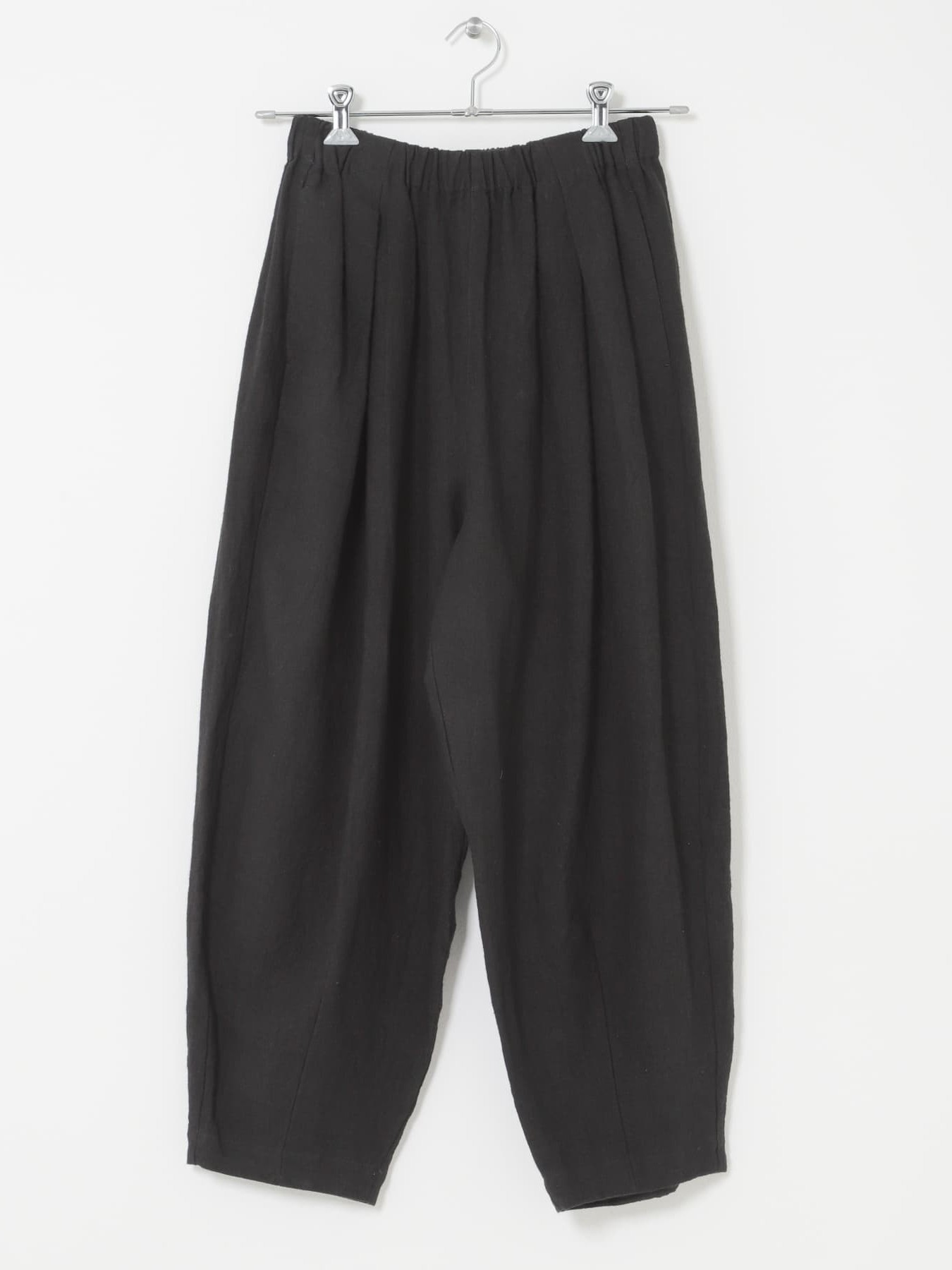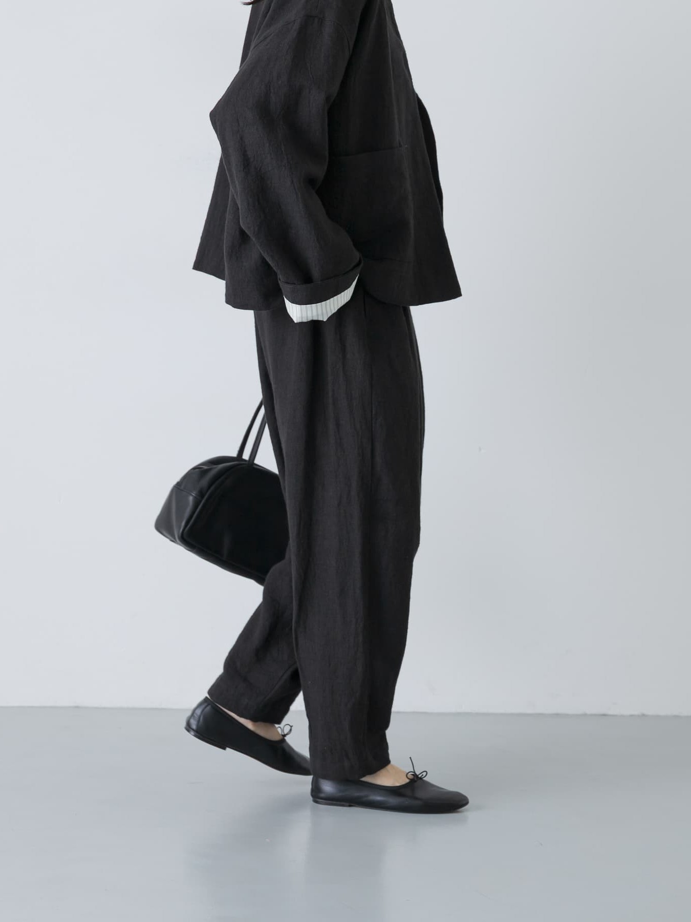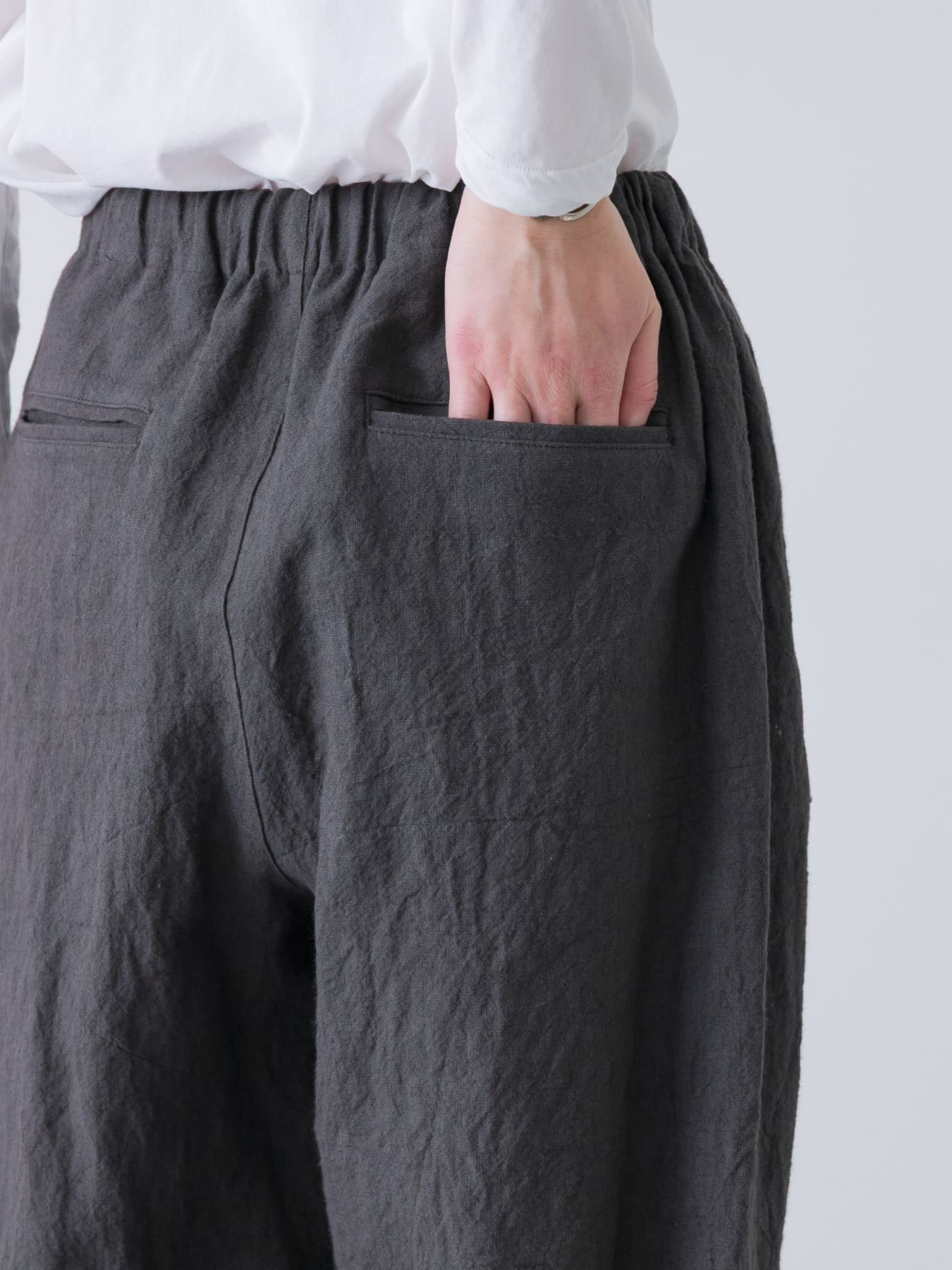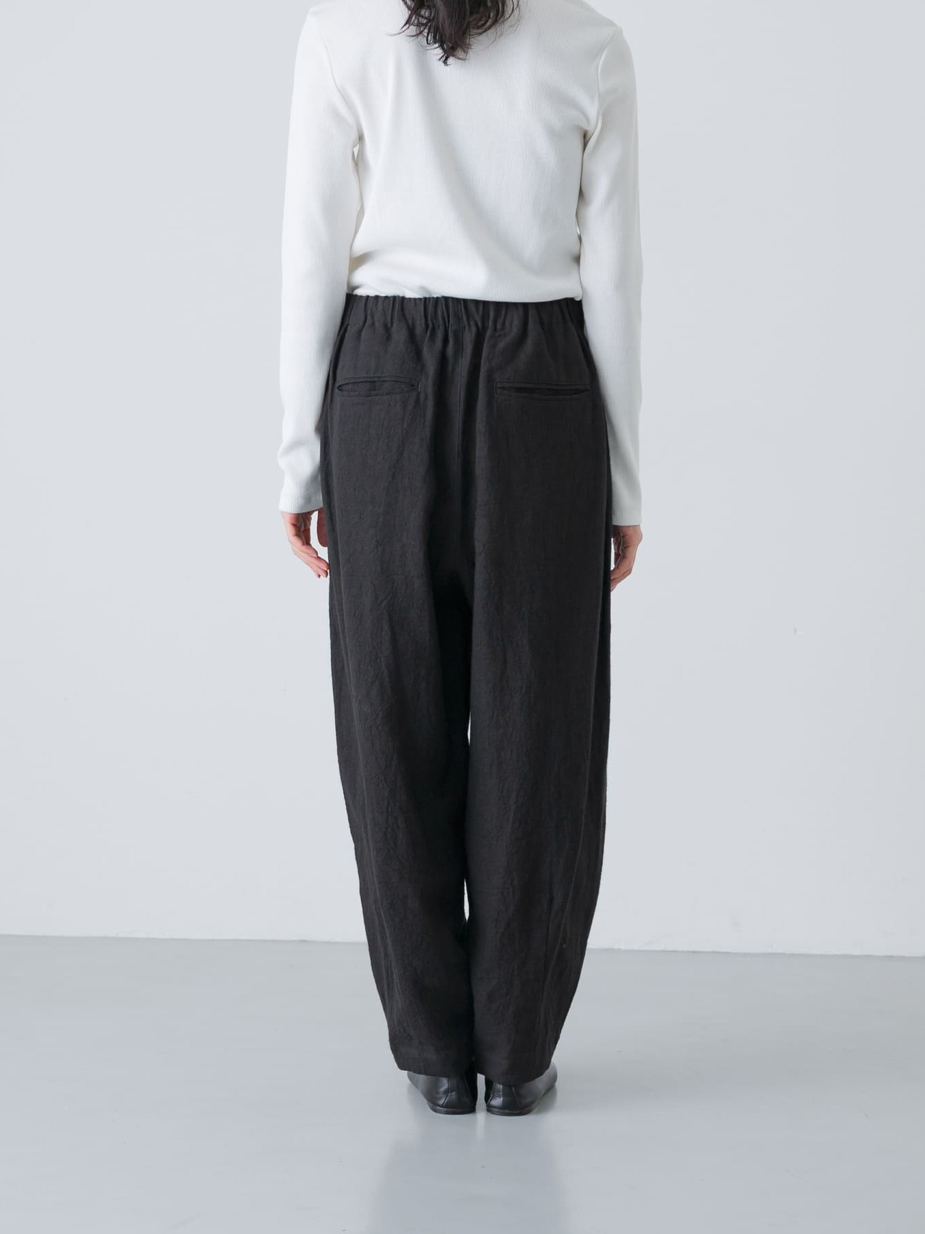 The Tucked Tapered Pants by KAGURE feature a loose cocoon silhouette with crossed tucks on the front. The fabric is a blend of ramie and linen, combining the firmness of ramie with the suppleness of linen to create a soft, expressive natural texture with a natural washer effect.