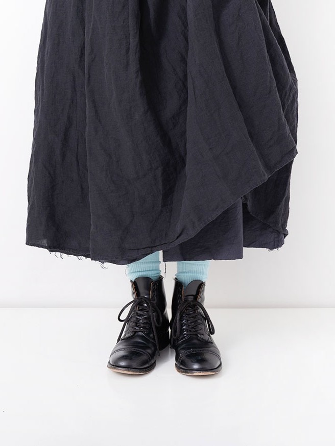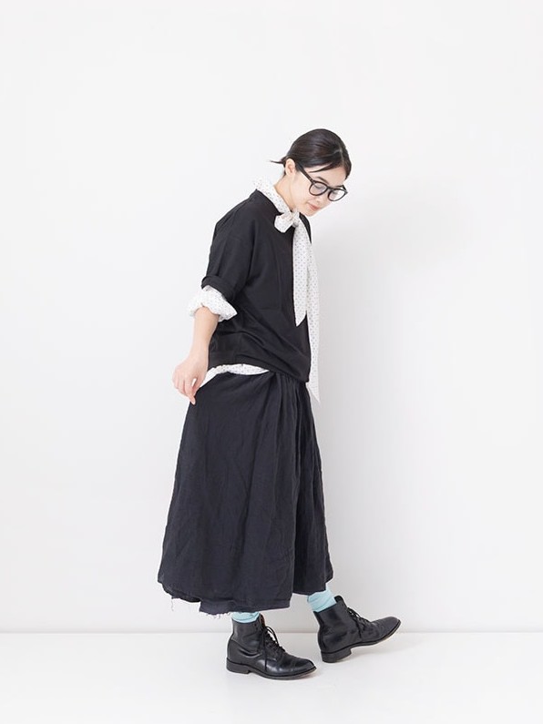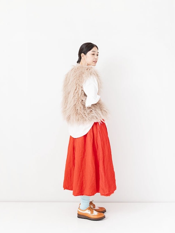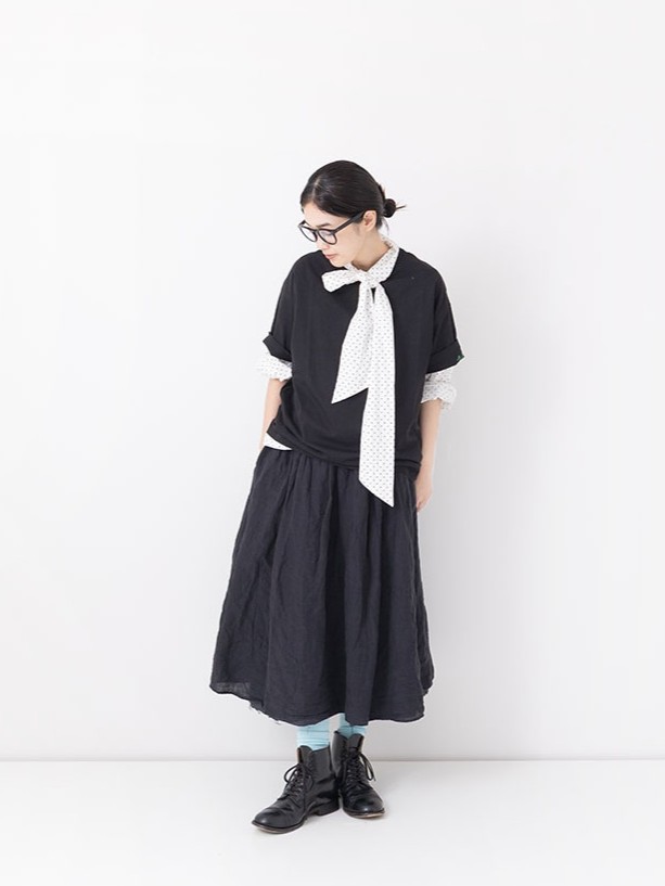 The Linen Reversible Skirt by Veritecoeur is a skirt that can be worn two ways. The outer side is made of rich linen with tucks and gathers at the waist. The reverse side is made of crinkled fabric with tucks for a moderate volume.