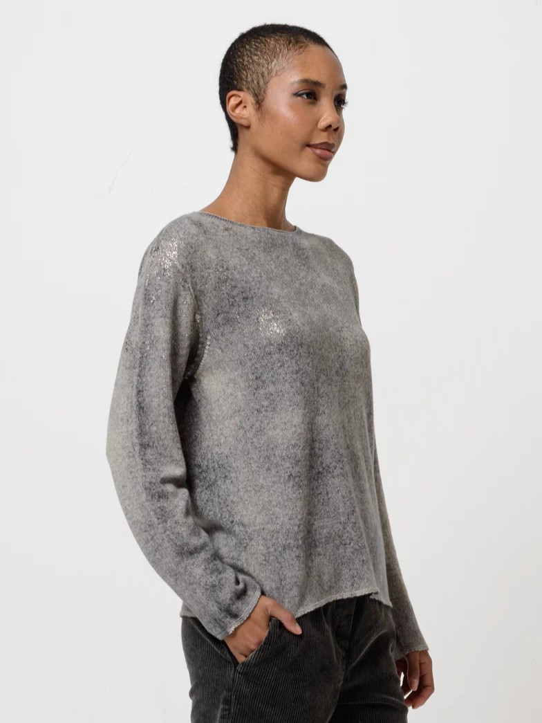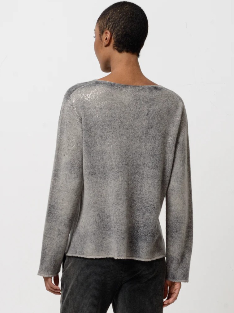 The Mayer Faded Smoke Lux Sweater by Ploumanach is a regular fit crew neck sweater crafted from cashmere. It features the unique smoke art technique, where dark dust is applied to the fabric while intentionally leaving the edges untouched for a faded, distinct aesthetic. The design includes ribbed cuffs and a ribbed neckline. The sweater is built to be lightweight and breathable, ensuring comfortable wear.