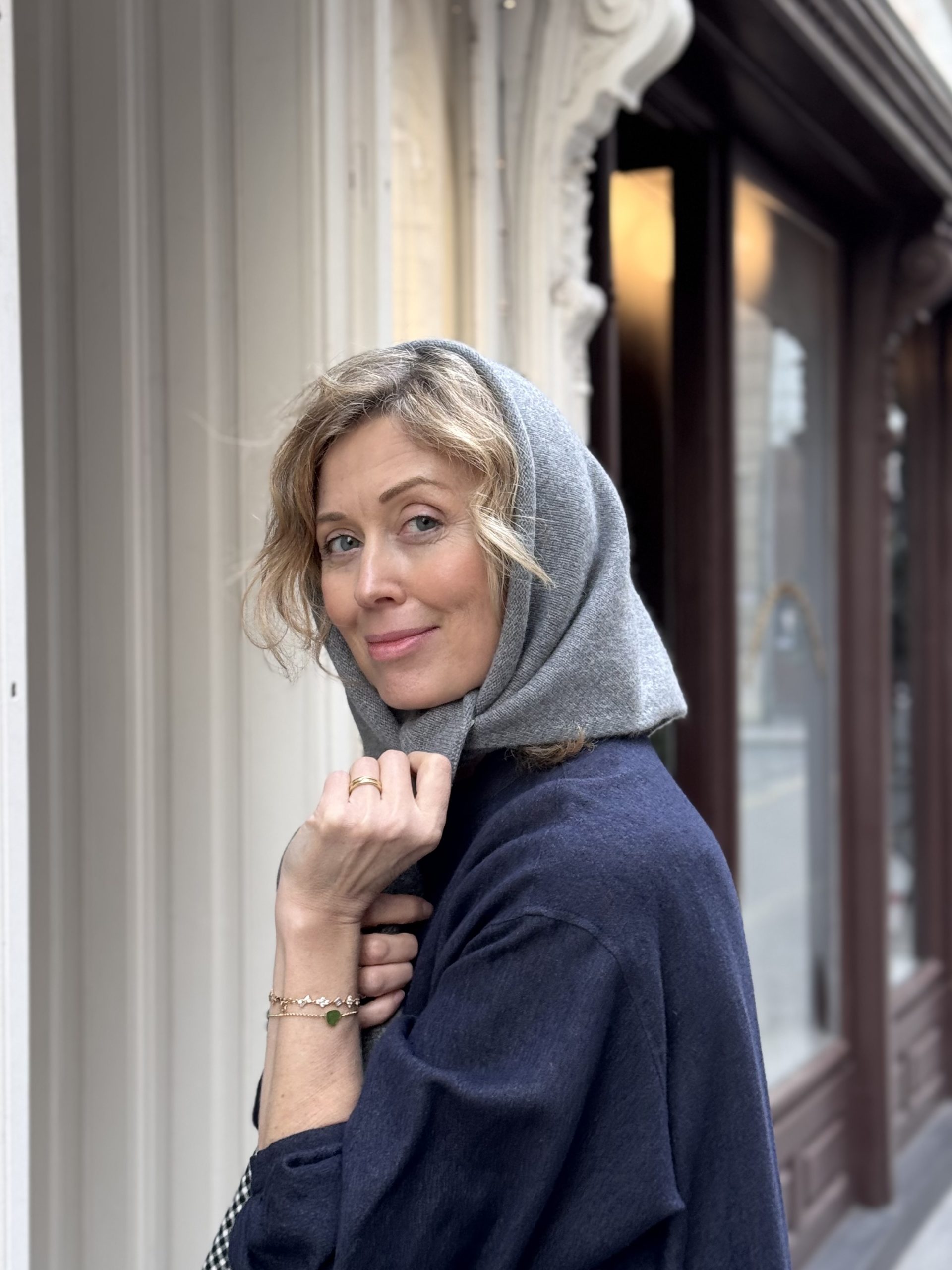 The Cashmere Scarf by MJW. is a wide scarf made from a cashmere material. The scarf has a fine, soft texture and can be wrapped or draped. It can also be worn and styled as a headscarf.