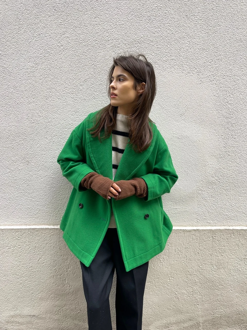The My Shawl Coat by Nicholson&Nicholson presents a modern silhouette with a nod to classic design, featuring a prominent shawl collar that lends it a timeless appeal. Based on a vintage Mackinaw coat, this double-breasted, oversized half-coat offers a relaxed fit. It is finished with a 100% cupra lining, ensuring a smooth and luxurious feel.