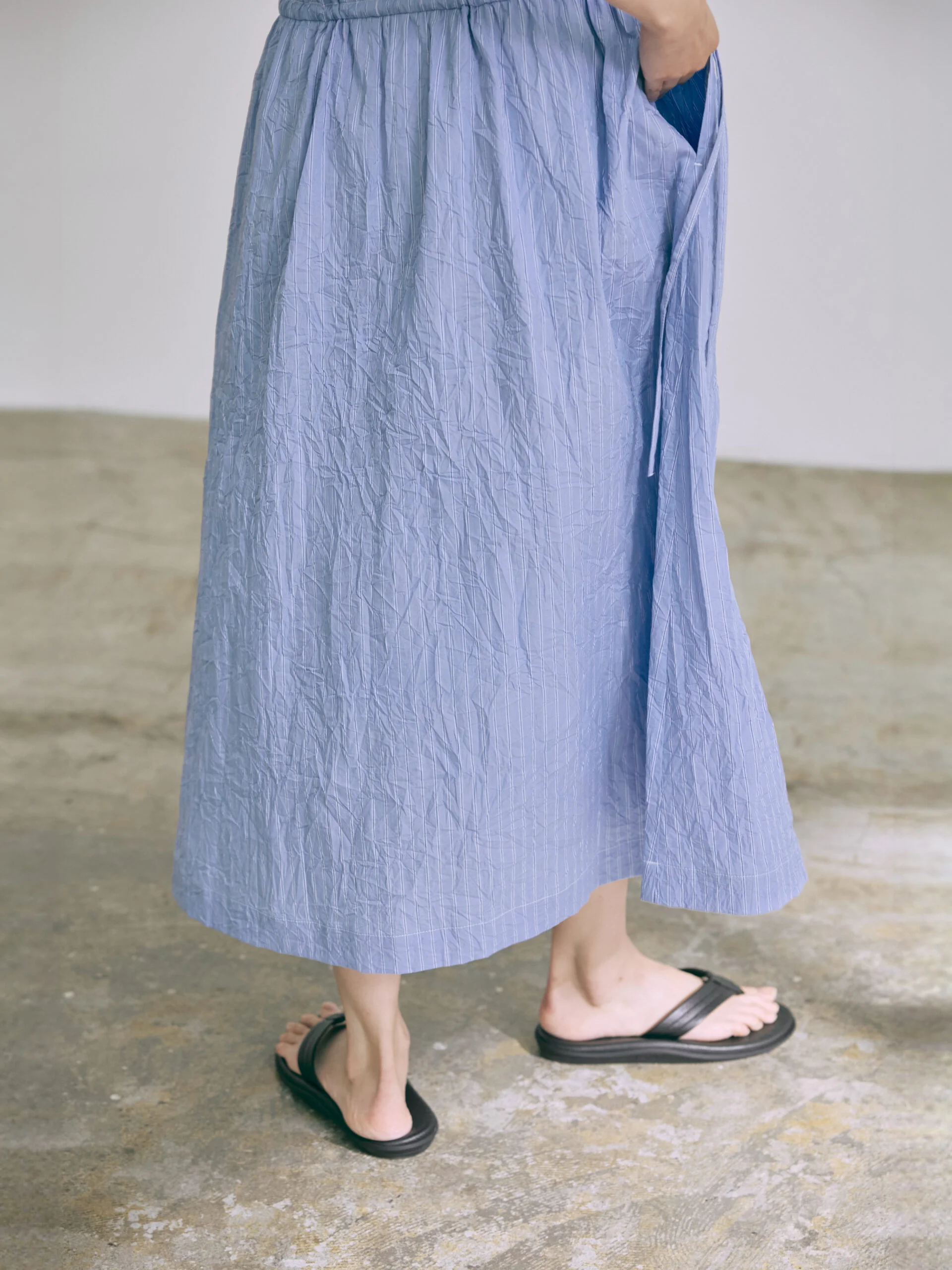 Crafted from signature crinkle cotton, the dress features a functional drawcord at the waist, allowing the simple silhouette to be adjusted for a more defined shape or worn loose for an effortless look.