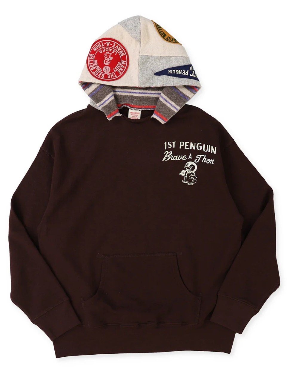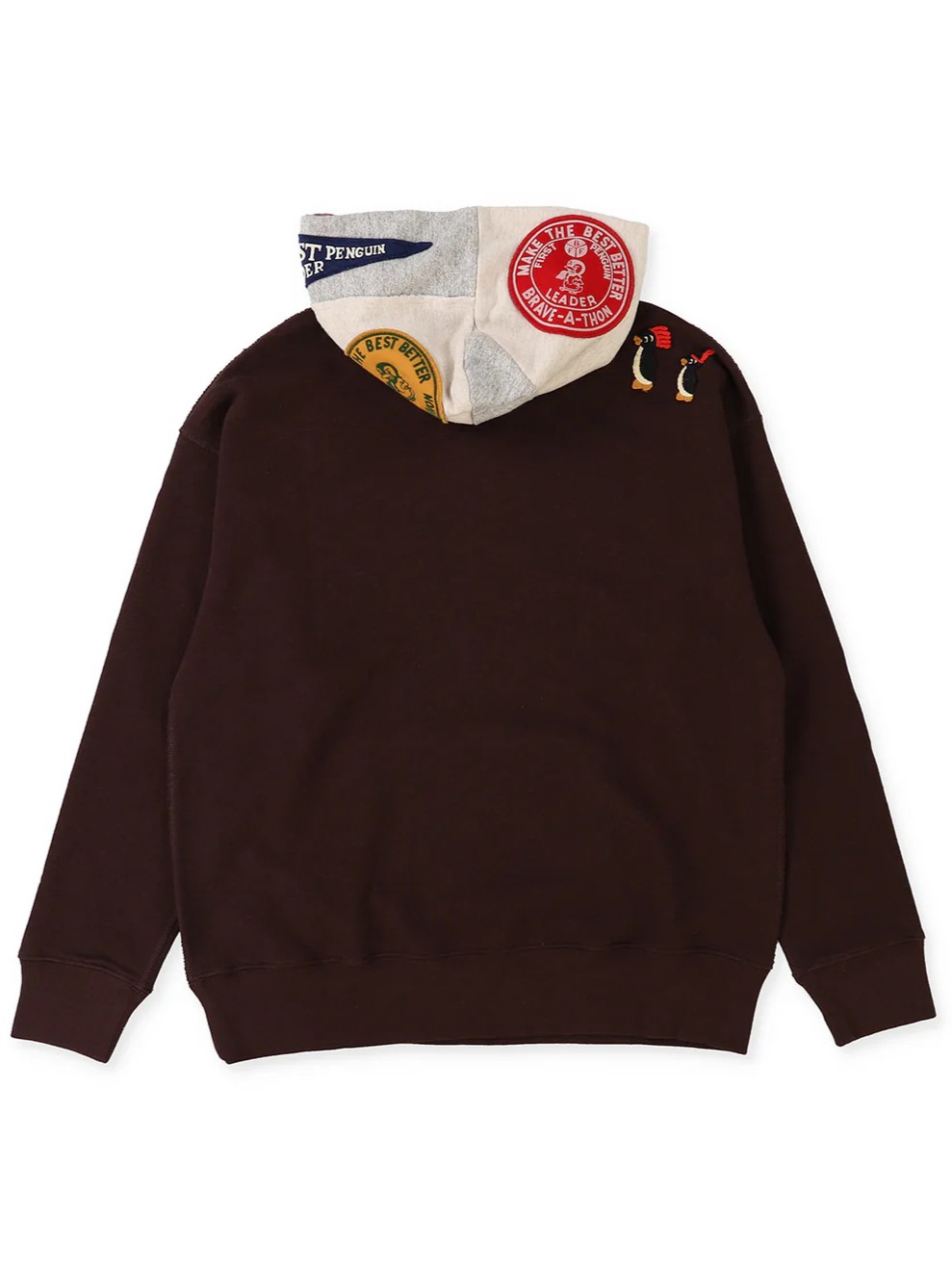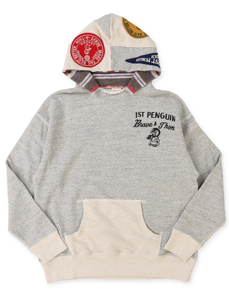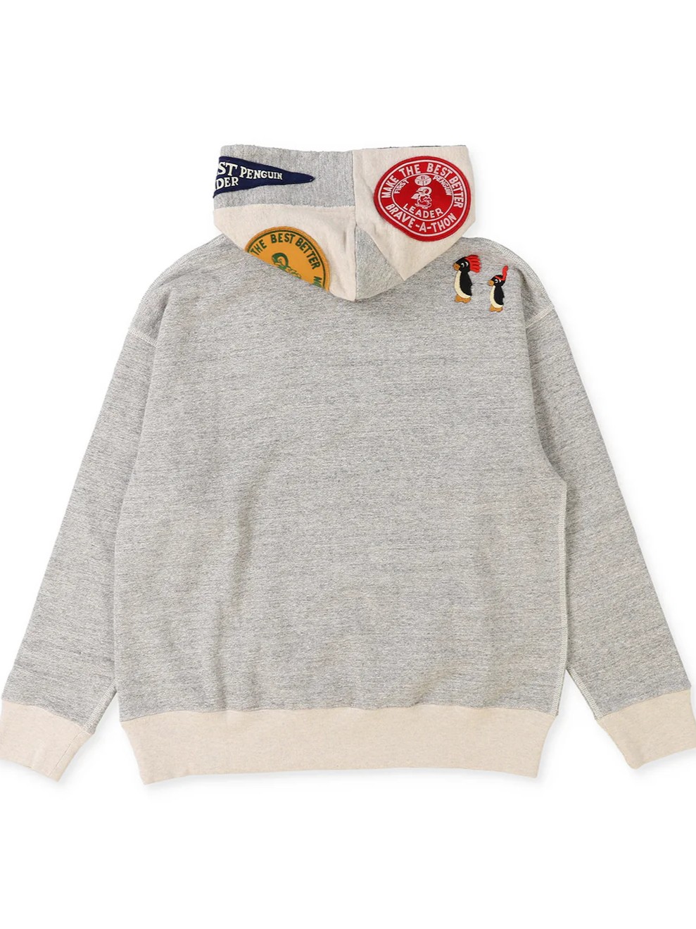 The PENNIE Patch Sweat Hoodie by Denim Dungaree is constructed using a unique fabric created on a Tompkins knitting machine, resulting in a cloth that is soft, full of air, and very light against the skin.