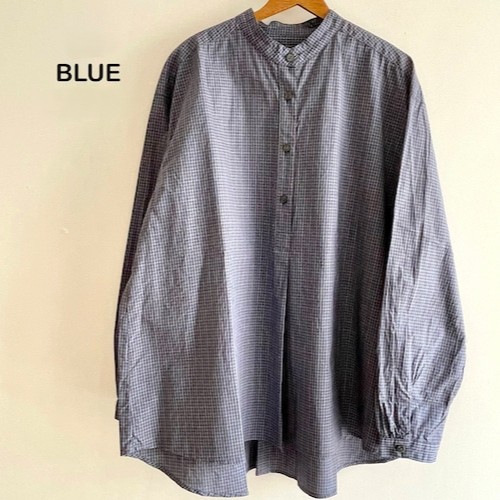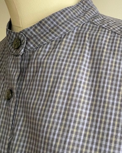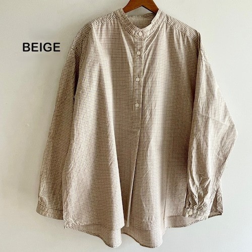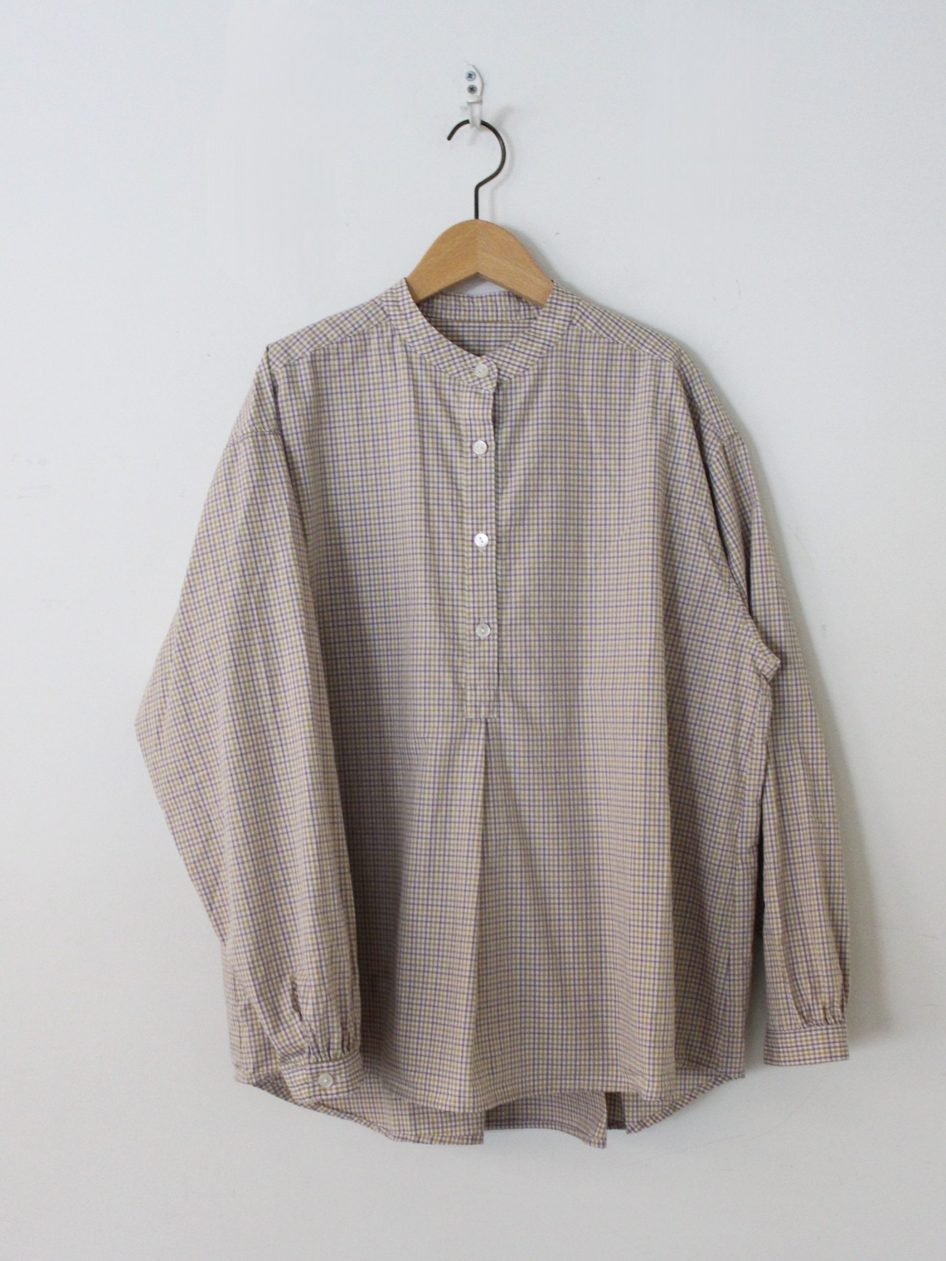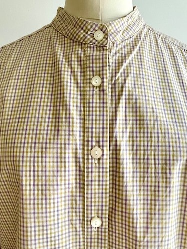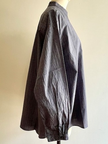 The Poplin Check Stand Collar Shirt by Sarahwear is a stand-collar garment designed with a comfortable, generous width and a sleek appearance. It is constructed from a smooth, lightweight cotton fabric that is woven at a high density, providing a firm and durable quality. The shirt has undergone a wash process to achieve a natural and unique texture, enhancing its tactile character.