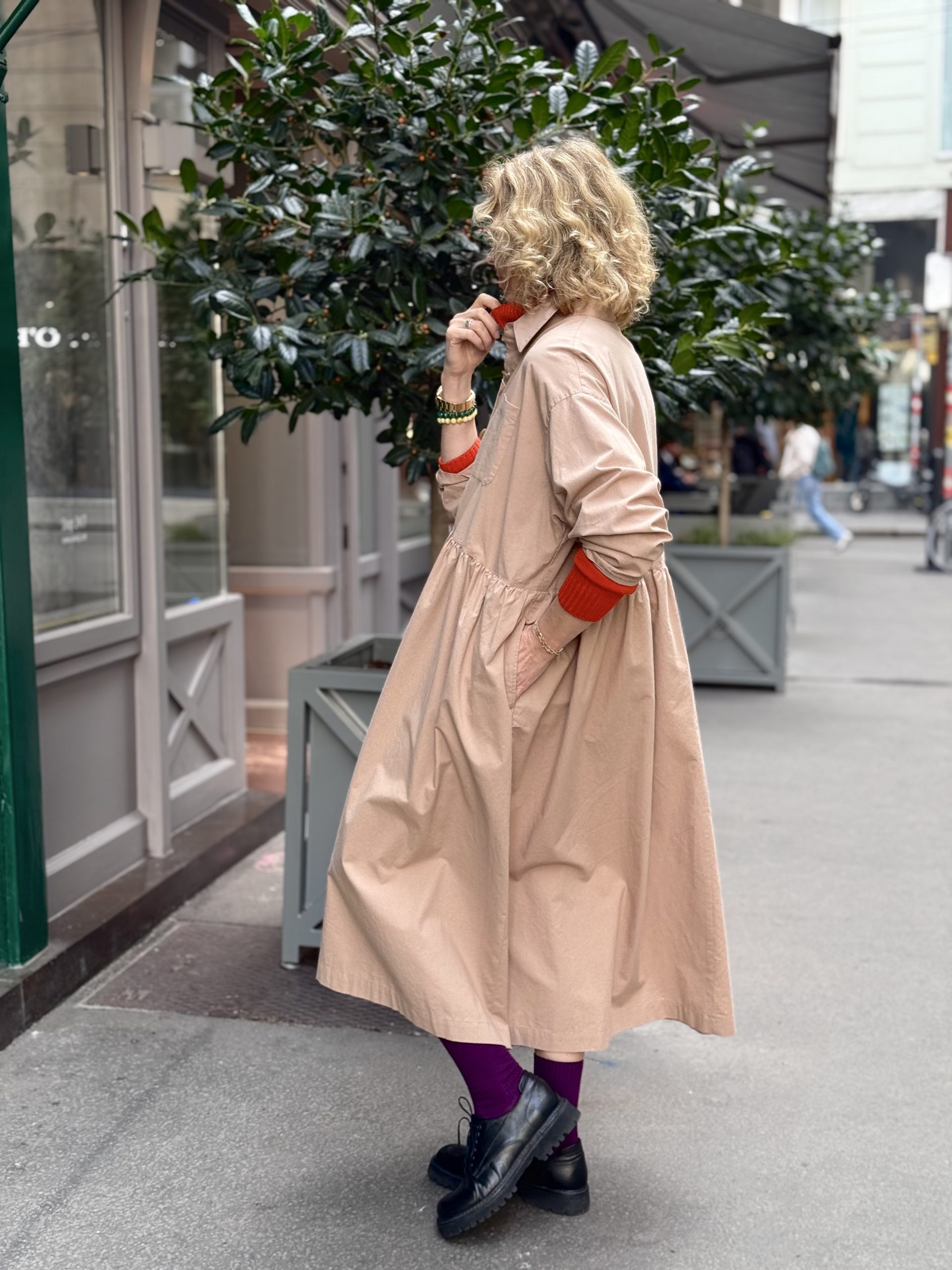The Rachel Cotton/Wool Dress by Sarahwear is a long dress with a loose, voluminous fit. The dress has a collared neckline and a button-up placket on the chest. It features a gathered seam at the waist and long sleeves with buttoned cuffs. The dress also has a large patch pocket on the left side of the chest.